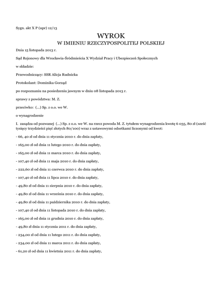 Sygn. akt X P (upr) 12/13 WYROK W IMIENIU RZECZYPOSPOLITEJ POLSKIEJ Dnia 15 listopada 2013 r. Sąd Rejonowy dla Wrocławia-Śródmieścia X Wydział Pracy i Ubezpieczeń Społecznych w składzie: Przewodniczący: SSR Alicja Rudnicka Protokolant: Dominika Gorząd po rozpoznaniu na posiedzeniu jawnym w dniu 08 listopada 2013 r. sprawy z powództwa: M. Z. przeciwko: (...) Sp. z o.o. we W. o wynagrodzenie I. zasądza od pozwanej (...) Sp. z o.o. we W. na rzecz powoda M. Z. tytułem wynagrodzenia kwotę 6 035, 80 zł (sześć tysięcy trzydzieści pięć złotych 80/100) wraz z ustawowymi odsetkami liczonymi od kwot: - 66, 40 zł od dnia 11 stycznia 2010 r. do dnia zapłaty, - 165,00 zł od dnia 11 lutego 2010 r. do dnia zapłaty, - 165,00 zł od dnia 11 marca 2010 r. do dnia zapłaty, - 107,40 zł od dnia 11 maja 2010 r. do dnia zapłaty, - 222,60 zł od dnia 11 czerwca 2010 r. do dnia zapłaty, - 107,40 zł od dnia 11 lipca 2010 r. do dnia zapłaty, - 49,80 zł od dnia 11 sierpnia 2010 r. do dnia zapłaty, - 49,80 zł od dnia 11 września 2010 r. do dnia zapłaty, - 49,80 zł od dnia 11 października 2010 r. do dnia zapłaty, - 107,40 zł od dnia 11 listopada 2010 r. do dnia zapłaty, - 165,00 zł od dnia 11 grudnia 2010 r. do dnia zapłaty, - 49,80 zł dnia 11 stycznia 2011 r. do dnia zapłaty, - 234,00 zł od dnia 11 lutego 2011 r. do dnia zapłaty, - 234,00 zł od dnia 11 marca 2011 r. do dnia zapłaty, - 61,20 zł od dnia 11 kwietnia 2011 r. do dnia zapłaty, - 234,00 zł od dnia 11 maja 2011 r. do dnia zapłaty, - 176,40 zł od dnia 11 czerwca 2011 r. do dnia zapłaty, - 176,40 zł od dnia 11 lipca 2011 r. do dnia zapłaty, - 176,40 zł od dnia 11 sierpnia 2011 r. do dnia zapłaty, - 118,80 zł od dnia 11 września 2011 r. do dnia zapłaty, - 118,80 zł od dnia 11 października 2011 r. do dnia zapłaty, - 176,40 zł od dnia 11 listopada 2011 r. do dnia zapłaty, - 234,00 zł od dnia 11 grudnia 2011 r. do dnia zapłaty, - 176,40 zł od dnia 11 stycznia 2011 r. do dnia zapłaty, - 290,40 zł od dnia 11 lutego 2012 r. do dnia zapłaty, - 290,40 zł od dnia 11 marca 2012 r. do dnia zapłaty, - 232,80 zł od dnia 11 kwietnia 2012 r. do dnia zapłaty, - 348,00 zł od dnia 11 maja 2012 r. do dnia zapłaty, - 290,40 zł od dnia 11 czerwca 2012 r. do dnia zapłaty, - 348,00 zł od dnia 11 lipca 2012 r. do dnia zapłaty, - 232,80 zł od dnia 11 sierpnia 2012 r. do dnia zapłaty, - 232,80 zł od dnia 11 września 2012 r. do dnia zapłaty, - 348,00 zł od dnia 11 października 2012 r. do dnia zapłaty, II. oddala powództwo w pozostałej części, III. zasądza od powoda na rzecz strony pozwanej kwotę 60 zł., tytułem zwrotu kosztów zastępstwa procesowego; IV. nakazuje pozwanej (...) Sp. z o.o. we W. uiścić na rzecz Skarbu Państwa (kasa Sądu Rejonowego dla Wrocławia – Śródmieścia) kwotę 301,80 zł tytułem opłaty sądowej od pozwu od uiszczenia której powód był zwolniony z mocy ustawy; V. nie obciąża powoda pozostałą częścią opłaty sądowej od pozwu na rzecz Skarbu Państwa; VI. wyrokowi w punkcie I nadaje rygor natychmiastowej wykonalności do kwoty 2 253,09 zł tj. do wysokości jednomiesięcznego wynagrodzenia powoda. Sygn. akt X P (upr) 12/13 UZASADNIENIE Powód M. Z. wniósł pozew przeciwko Przedsiębiorstwu (...) sp. z o.o. z siedzibą we W. o zapłatę wynagrodzenia w wysokości 6.159, 80 zł, na które składają się kwoty stanowiące różnicę między otrzymywanym wynagrodzeniem a stawką minimalną wynagrodzenia mianowicie kwoty za: - listopad 2009 r. - 124,00 zł z ustawowymi odsetkami od dnia 11 grudnia 2009 roku do dnia zapłaty, - grudzień 2009 r. - 66, 40 zł z ustawowymi odsetkami od dnia 11 stycznia 2010 roku do dnia zapłaty, - styczeń 2010 r. - 165,00 zł z ustawowymi odsetkami od dnia 11 lutego 2010 roku do dnia zapłaty, - luty 2010 r. - 165,00 zł z ustawowymi odsetkami od dnia 11 marca 2010 roku do dnia zapłaty, - kwiecień 2010 r. - 107,40 zł z ustawowymi odsetkami od dnia 11 maja 2010 roku do dnia zapłaty, - maj 2010 r.- 222,60 zł z ustawowymi odsetkami od dnia 11 czerwca 2010 roku do dnia zapłaty, - czerwiec 2010 r. - 107,40 zł z ustawowymi odsetkami od dnia 11 lipca 2010 roku do dnia zapłaty, - lipiec 2010 r. - 49,80 zł z ustawowymi odsetkami od dnia 11 sierpnia 2010 roku do dnia zapłaty, - sierpień 2010 r. - 49,80 zł z ustawowymi odsetkami od dnia 11 września 2010 roku do dnia zapłaty, - wrzesień 2010 r. - 49,80 zł z ustawowymi odsetkami od dnia 11 października 2010 roku do dnia zapłaty, - października 2010 r. - 107,40 zł z ustawowymi odsetkami od dnia 11 listopada 2010 roku do dnia zapłaty, - listopad 2010 r. - 165,00 zł z ustawowymi odsetkami od dnia 11 grudnia 2010 roku do dnia zapłaty, - grudzień 2010 r.- 49,80 zł z ustawowymi odsetkami od dnia 11 stycznia 2011 roku do dnia zapłaty, - styczeń 2011 r. - 234,00 zł z ustawowymi odsetkami od dnia 11 lutego 2011 roku do dnia zapłaty, - luty 2011 r. - 234,00 zł z ustawowymi odsetkami od dnia 11 marca 2011 roku do dnia zapłaty, - marzec 2011 r. - 61,20 zł z ustawowymi odsetkami od dnia 11 kwietnia 2011 roku do dnia zapłaty, - kwiecień 2011 r. - 234,00 zł z ustawowymi odsetkami od dnia 11 maja 2011 roku do dnia zapłaty, - maj 2011 r. - 176,40 zł z ustawowymi odsetkami od dnia 11 czerwca 2011 roku do dnia zapłaty, - czerwiec 2011 r. - 176,40 zł z ustawowymi odsetkami od dnia 11 lipca 2011 roku do dnia zapłaty, - lipiec 2011 r. - 176,40 zł z ustawowymi odsetkami od dnia 11 sierpnia 2011 roku do dnia zapłaty, - sierpień 2011 r. - 118,80 zł z ustawowymi odsetkami od dnia 11 września 2011 roku do dnia zapłaty, - wrzesień 2011 r. - 118,80 zł z ustawowymi odsetkami od dnia 11 października 2011 roku do dnia zapłaty, - października 2011 r.- 176,40 zł z ustawowymi odsetkami od dnia 11 listopada 2011 roku do dnia zapłaty, - listopad 2011 r. - 234,00 zł z ustawowymi odsetkami od dnia 11 grudnia 2011 roku do dnia zapłaty, - grudzień 2011 r. - 176,40 z