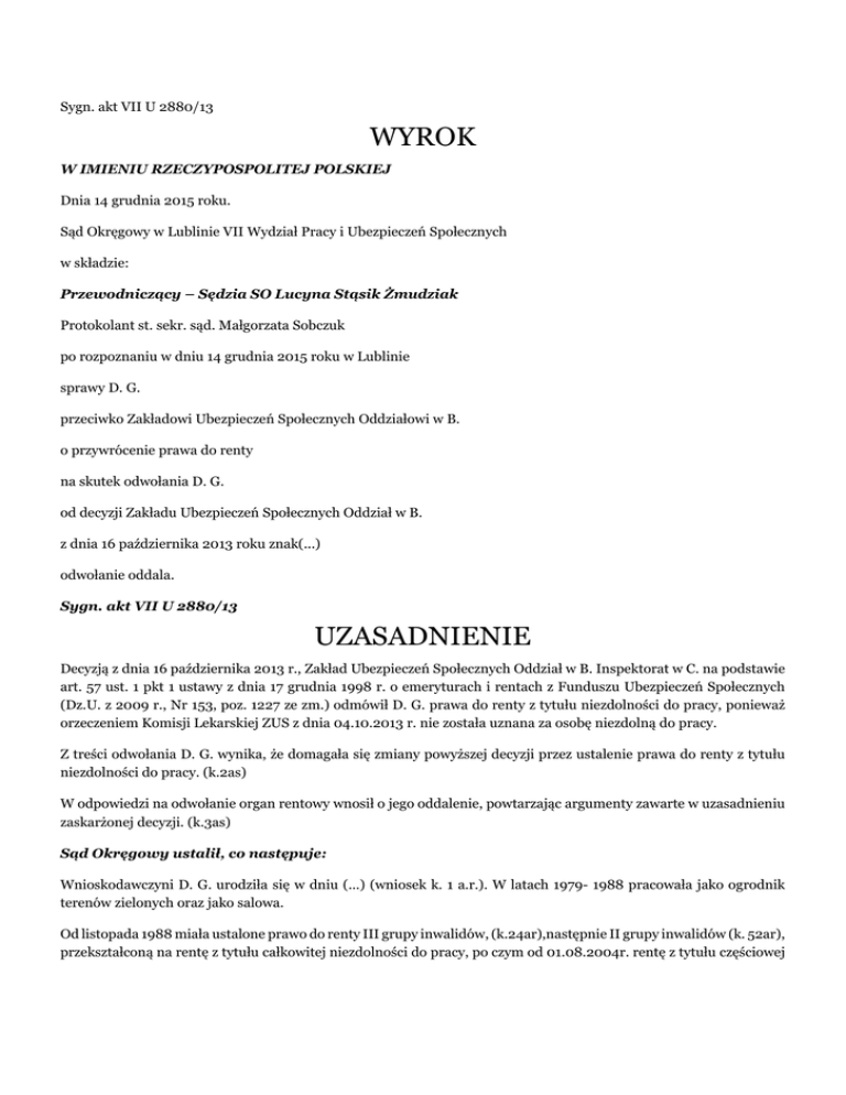 Sygn. akt VII U 2880/13 WYROK W IMIENIU RZECZYPOSPOLITEJ POLSKIEJ Dnia 14 grudnia 2015 roku. Sąd Okręgowy w Lublinie VII Wydział Pracy i Ubezpieczeń Społecznych w składzie: Przewodniczący – Sędzia SO Lucyna Stąsik Żmudziak Protokolant st. sekr. sąd. Małgorzata Sobczuk po rozpoznaniu w dniu 14 grudnia 2015 roku w Lublinie sprawy D. G. przeciwko Zakładowi Ubezpieczeń Społecznych Oddziałowi w B. o przywrócenie prawa do renty na skutek odwołania D. G. od decyzji Zakładu Ubezpieczeń Społecznych Oddział w B. z dnia 16 października 2013 roku znak(...) odwołanie oddala. Sygn. akt VII U 2880/13 UZASADNIENIE Decyzją z dnia 16 października 2013 r., Zakład Ubezpieczeń Społecznych Oddział w B. Inspektorat w C. na podstawie art. 57 ust. 1 pkt 1 ustawy z dnia 17 grudnia 1998 r. o emeryturach i rentach z Funduszu Ubezpieczeń Społecznych (Dz.U. z 2009 r., Nr 153, poz. 1227 ze zm.) odmówił D. G. prawa do renty z tytułu niezdolności do pracy, ponieważ orzeczeniem Komisji Lekarskiej ZUS z dnia 04.10.2013 r. nie została uznana za osobę niezdolną do pracy. Z treści odwołania D. G. wynika, że domagała się zmiany powyższej decyzji przez ustalenie prawa do renty z tytułu niezdolności do pracy. (k.2as) W odpowiedzi na odwołanie organ rentowy wnosił o jego oddalenie, powtarzając argumenty zawarte w uzasadnieniu zaskarżonej decyzji. (k.3as) Sąd Okręgowy ustalił, co następuje: Wnioskodawczyni D. G. urodziła się w dniu (...) (wniosek k. 1 a.r.). W latach 1979- 1988 pracowała jako ogrodnik terenów zielonych oraz jako salowa. Od listopada 1988 miała ustalone prawo do renty III grupy inwalidów, (k.24ar),następnie II grupy inwalidów (k. 52ar), przekształconą na rentę z tytułu całkowitej niezdolności do pracy, po czym od 01.08.2004r. rentę z tytułu częściowej niezdolności do pracy. (k. 183ar) Prawo do renty ostatnio przysługiwało do 31.08.2012r, kiedy to po ustaleniu, że wnioskodawczyni jest zdolna do pracy odmówiono renty na dalszy okres. (decyzje k. 213 ar) Odwołanie od decyzji z dnia 23.10.2012r. odmawiającej prawa do renty na dalszy okres zostało oddalone wyrokiem z dnia 29.04.2013r. w sprawie VII U 4147/12. W toku tej sprawy Sąd dopuścił dowód z opinii biegłych: okulisty, psychiatry, chirurgii naczyniowej, neurologa i hematologa, którzy po zapoznaniu się z dokumentacją medyczną wnioskodawczyni stwierdzili u niej zmiany zwyrodnieniowe kręgosłupa ze skoliozą lędźwiową, upośledzenie umysłowe w stopniu lekkim, zaburzenia adaptacyjne, żylaki kończyn dolnych, niedokrwistość megaloblastyczna z powodu niedoboru witaminy B12, zez rozbieżny oka prawego jednakże uznali, że brak długotrwałej niezdolności do pracy. Wyroku wnioskodawczyni nie skarżyła. (bezsporne – akta VII U 4147/12) W dniu 23 lipca 2013 r. D. G. złożyła ponowny wniosek o rentę z tytułu niezdolności do pracy. (k…ar) Do wniosku dołączyła aktualne zaświadczenia lekarskie. Lekarz Orzecznik ZUS po zbadaniu wnioskodawczyni i dokonaniu oceny dokumentacji medycznej oraz posiłkując się opinią biegłych ze sprawy VII U 4147/12 nie uznał jej za niezdolną do pracy. Podobnie Komisja Lekarska ZUS badająca wnioskodawczynię na skutek złożonego przez nią sprzeciwu (k. ….ar) nie stwierdziła istnienia niezdolności do pracy, potwierdzając rozpoznania dolegliwości opisane przez Lekarza Orzecznika. (orzeczenie z dnia 04.10.2013 r. a.r.). W tym stanie rzeczy została wydana zaskarżona decyzja. Na skutek złożonego odwołania Sąd dopuścił dowód z opinii biegłych: neurologa, ortopedy, kardiologa, chirurga naczyniowego, hematologa, okulisty i psychologa. (k.5as) U D. G. stwierdzono: nadciśnienie tętnicze I WHO, stenokardię, zmiany zwyrodnieniowe kręgosłupa szyjnego i lędźwiowo-krzyżowego, wczesne zmiany zwyrodnieniowe bioder, przebyty uraz prawego łokcia, umiarkowaną artrozę obu kolan, szyjnopochodny ból głowy, zaćmę dojrzałą oka prawego i początkową oka lewego, zez rozbieżny oka prawego, niedowidzenie oka prawego, brak widzenia obuocznego, żylaki kończyn dolnych, niedokrwistość z niedoboru witaminy B12, leczoną witaminą B12, upośledzenie umysłowe w stopniu lekkim, cechy zaburzeń poznawczych uwarunkowanych organicznym uszkodzeniem OUN, w wywiadzie: zaburzenia adaptacyjne. Biegli po przeanalizowaniu dokumentacji medycznej oraz przeprowadzeniu badania wnioskodawczyni zgodzili się z orzeczeniem ZUS i stwierdzili, że wnioskodawczyni nie jest częściowo lub całkowicie niezdolna do pracy. Z wywiadu oraz dokumentacji medycznej wynikało, że u D. G. przebiegające bez powikłań narządowych i dobrze kontrolowane farmakologicznie nadciśnienie tętnicze oraz stenokardia nie sprowadzają przeciwwskazań do podjęcia zatrudnienia zgodnego z posiadanymi kwalifikacjami zawodowymi. Badana podaje dolegliwości bólowe wielostawowe - tj. okolicy bioder i prawego łokcia. W przeszłości przebyła uraz okolicy prawego łokcia i skręcenie prawego stawu skokowego. Zgłasza także: bóle okolicy L-S kręgosłupa, okolicy barków, kolan, okolicy kostek goleni, bóle głowy. Od 2007 r. pozostaje w leczeniu pod kontrolą ortopedyczną. Ma zalecone leczenie farmakologiczne i rehabilitacyjne. Dostarczyła zdjęcia RTG bioder i kręgosłupa L-S. Jet leczona również w poradni neurologicznej, była również hospitalizowana neurologicznie. Doraźnie stosuje leki niesterydowe przeciwbólowe-przeciwzapalne. Przeprowadzone badanie ortopedyczno-neurologiczne, podobnie jak badania orzeczników ZUS, nie ujawniło obecności u opiniowanej cech czynnego drażnienia korzeni nerwowych, objawów ubytkowych, oraz istotnego posiedzenia funkcji kręgosłupa i narządu ruchu. Świadczy to o utrwalonej remisji opisywanych w przeszłości zespołów korzeniowych. Zgłaszane obecnie dolegliwości bólowe kręgosłupa i kończyn, w okresach zaostrzeń wymagają leczenia ambulatoryjnego w ramach krótkotrwałej niezdolności do pracy, nie czynią ni