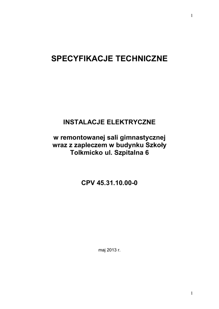 1 SPECYFIKACJE TECHNICZNE INSTALACJE ELEKTRYCZNE w remontowanej sali gimnastycznej wraz z zapleczem w budynku Szkoły Tolkmicko ul. Szpitalna 6 CPV 45.31.10.00-0 maj 2013 r. 1 2 WSTĘP 1.1. Przedmiot Specyfikacji Technicznej. Przedmiotem Specyfikacji Technicznej są wymagania dotyczące wyk onania i odbioru instalacji elektrycznej w remontowanej sali gimnastycznej wraz z zapleczem w budynku Szkoły Tolkmicko ul. Szpitalna 6. 1.2. Zakres stosowania specyfikacji technicznej Specyfikacja Techniczna jest stosowana jako dokument przetargowy i kontraktowy przy zleceniach i realizacji robót wymienionych w pkt. 1.1. 1.3 Zakres robót objętych ST. Ustalenia zawarte w niniejszej ST dotyczą prowadzenia robót elektrycznych i obejmują wykonanie kompletnej instalacji elektrycznej w obiekcie szczegółowo opisanej w projekcie budowlano-wykonawczym i w przedmiarze robót. KOD ROBÓT CPV KATEGORIA ROBÓT – 453100003 – roboty w zakresie instalacji elektrycznych 1.4 Określenia podstawowe. 1.4.1Trasowanie – wyznaczenie trasy przebiegu przewodów i miejsc punktów gniazd, wyłączników, opraw itp. 1.4.2 Rury instalacyjne – rury stalowe lub z tworzyw sztucznych układanych po wierzchu lub podłożu. 1.4.2 Podłoże – mur, tynk, beton, na których układane są przewody. 1.4.3 Punkt oświetleniowy – oprawa oświetleniowa jarzeniowa lub żarowa. 2.0 MATERIAŁY Ogólne wymagania dotyczące materiałów podano w ST „Wymagania ogólne” pkt. 2. 2.1 Rozdzielnie Tablicę wykonać wg rysunków szczegółowych w Dokumentacji projektowej. 2.2 Oprawy oświetleniowe Oświetlenie pomieszczeń wykonać należy oprawami zgodnie z planami dokumentacji projektowej. 2.3. Przewody Całość instalacji elektrycznej wykonać przewodami YDY i YDYp o różnym przekroju żył (wg przedmiaru) 3.0 SPRZĘT Ogólne wymagania dotyczące sprzętu podano w ST „Wymagania ogólne” pkt. 3. 4.0TRANSPORT Ogólne wymagania dotyczące transportu podano w ST „Wymagania ogólne” pkt. 4. 5.0 WYKONANIE ROBÓT Ogólne wymagania dotyczące wykonania robót podano w ST „Wymagania ogólne” pkt. 5. 5.1. Trasowanie – należy wykonać uwzględniając konstrukcję budynku oraz zapewniając bezkolizyjność z innymi instalacjami. Wskazane jest aby trasa przewodów i rur instalacyjnych przebiegała w liniach poziomych i pionowych. 5.2. Bruzdy – dostosować do średnicy rur, aby w przypadku układania dwóch, więcej rur odstępy między nimi wynosiły nie mniej niż 5 mm. 5.3. Wykonanie tablic – wykonać zgodnie z rysunkami szczegółowymi Dokumentacji projektowej i zamontować zgodnie z jej zaleceniami. 2 3 5.4. Instalacja oświetlenia i gniazd wtykowych 230 – wykonać przewodami YDYp o przekroju 2 żył 3 x 2,5; 3 x 1,5; 4 x 1,5; 5 x 1,5; 5 x 2,5 mm . Przewody wprowadzone do puszek powinny mieć nadmiar długości niezbędny do wykonania podłączeń. Przewód neutralny powinien być nieco dłuższy od przewodów fazowych. Zagięcia i łuki w płaszczyźnie przewodu powinny być łagodne. Puszki należy osadzić na ścianach w sposób trwały i po zamontowaniu przykryć pokrywkami montażowymi. 5.5. Montaż osprzętu i opraw oświetleniowych • gniazda wtyczkowe i łączniki należy mocować do podłoża w sposób trwały • oprawy oświetleniowe montować zgodnie z Dokumentacją projektową. 6.00. KONTROLA JAKOŚCI Ogólne wymagania dotyczące kontroli jakości podano w ST „Wymagania ogólne” pkt. 6. 6.1. Próby montażowe Po zakończeniu robót należy przeprowadzić próby montażowe obejmujące badania i pomiary: • pomiar rezystancji izolacji należy wykonać dla każdego obwodu oddzielnie od strony zasilania; pomiar należy dokonać induktorem 500 V lub 1000 V; rezystancja izolacji z przewodem neutralnym lub uziemiającym dla instalacji 220 V nie może być mniejsza niż 0,25 MΩ. • pomiar rezystancji izolacji odbiorników należy wykonać induktorem 500 V i nie może być mniejszy od 1,0 MΩ. Z prób montażowych należy sporządzić protokół. 6.2. Po pozytywnym zakończeniu wszystkich badań i pomiarów objętych próbami montażowymi należy załączyć instalacje pod napięcie i sprawdzić czy: Podstawą odbioru robót izolacyjnych są badania obejmujące: • punkty świetlne są załączone zgodnie z założonym programem • w gniazdach wtyczkowych przewody są dokładnie dołączone do właściwych zacisków 7.0. OBMIAR ROBÓT Ogólne wymagania dotyczące obmiaru robó podano w ST „Wymagania ogólne” pkt. 7. 8.0. ODBIÓR ROBÓT Ogólne wymagania dotyczące obmiaru robót podano w ST „Wymagania ogólne” pkt. 8. 8.1. Odbiory międzyoperacyjne – powinien przeprowadzić organ nadzoru Wykonawcy. Odbiorom tym powinny podlegać: • osadzone konstrukcje wsporcze, oprawy oświetleniowe • ułożone rury, listwy, korytka przed wciągnięciem przewodów • instalacja przed załączeniem pod napięciem 8.2. Odbiory częściowe dotyczą robót ulegających zakryciu. 8.3. Odbiór końcowy • Do odbioru końcowego wykonanych robót Wykonawca powinien przedłożyć: • aktualną dokumentacje powykonawczą • protokoły prób montażowych • oświadczenie Wykonawcy o zakończeniu robót i gotowości instalacji do eksploatacji 8.4. Komisja odbioru końcowego: • bada aktualność i kompletność dokumentacji powykonawczej • bada protokoły odbiorców częściowych i sprawdza usunięcie usterek • bada zaświadczenia o jakości materiałów i urządzeń oraz przedstawia ewentualne wnioski i uwagi • bada i akceptuje protokoły prób montażowych • dokonuje prób i odbioru instalacji włączonej pod napięcie • ustala okres i warunki wstępnej eksploatacji instalacji • spisuje protokół odbiorczy 3 4 9.00. PODSTAWA PŁATNOŚCI Ogólne zasady dotyczące płatności za wykonane roboty podano w ST „Wymagania ogólne” pkt. 9. 9.1. Cena wykonania robót obejmuje: • demontaż opraw, puszek, wyłączników, gniazd, tablicy • wytyczenie trasy przewodów, rur i punktów osprzętu • 