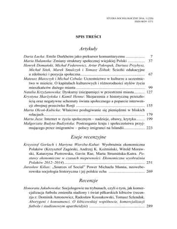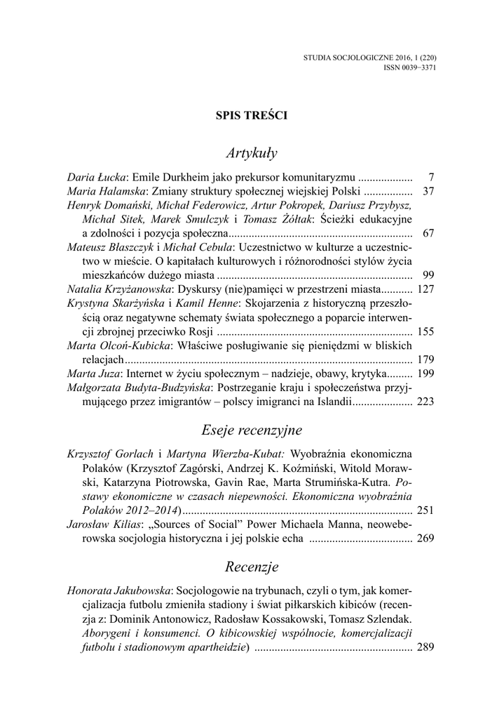 STUDIA SOCJOLOGICZNE 2016, 1 (220) ISSN 0039−3371 SPIS TREŚCI Artykuły Daria Łucka: Emile Durkheim jako prekursor komunitaryzmu ................... Maria Halamska: Zmiany struktury społecznej wiejskiej Polski ................. Henryk Domański, Michał Federowicz, Artur Pokropek, Dariusz Przybysz, Michał Sitek, Marek Smulczyk i Tomasz Żółtak: Ścieżki edukacyjne a zdolności i pozycja społeczna................................................................ Mateusz Błaszczyk i Michał Cebula: Uczestnictwo w kulturze a uczestnictwo w mieście. O kapitałach kulturowych i różnorodności stylów życia mieszkańców dużego miasta .................................................................... Natalia Krzyżanowska: Dyskursy (nie)pamięci w przestrzeni miasta........... Krystyna Skarżyńska i Kamil Henne: Skojarzenia z historyczną przeszłością oraz negatywne schematy świata społecznego a poparcie interwencji zbrojnej przeciwko Rosji .................................................................... Marta Olcoń-Kubicka: Właściwe posługiwanie się pieniędzmi w bliskich relacjach .................................................................................................... Marta Juza: Internet w życiu społecznym – nadzieje, obawy, krytyka......... Małgorzata Budyta-Budzyńska: Postrzeganie kraju i społeczeństwa przyjmującego przez imigrantów – polscy imigranci na Islandii ..................... 7 37 67 99 127 155 179 199 223 Eseje recenzyjne Krzysztof Gorlach i Martyna Wierzba-Kubat: Wyobraźnia ekonomiczna Polaków (Krzysztof Zagórski, Andrzej K. Koźmiński, Witold Morawski, Katarzyna Piotrowska, Gavin Rae, Marta Strumińska-Kutra. Postawy ekonomiczne w czasach niepewności. Ekonomiczna wyobraźnia Polaków 2012–2014) ................................................................................ 251 Jarosław Kilias: „Sources of Social” Power Michaela Manna, neoweberowska socjologia historyczna i jej polskie echa .................................... 269 Recenzje Honorata Jakubowska: Socjologowie na trybunach, czyli o tym, jak komercjalizacja futbolu zmieniła stadiony i świat piłkarskich kibiców (recenzja z: Dominik Antonowicz, Radosław Kossakowski, Tomasz Szlendak. Aborygeni i konsumenci. O kibicowskiej wspólnocie, komercjalizacji futbolu i stadionowym apartheidzie) ....................................................... 289 4 SPIS TRESCI Małgorzata Gadecka: Dostęp młodzieży wiejskiej do wykształcenia wyższego (recenzja z: Krzysztof Wasielewski, Młodzież wiejska na uniwersytecie: droga na studia, mechanizm alokacji, postawy wobec kształcenia) ............................................................................................................ 297 STUDIA SOCJOLOGICZNE 2016, 1 (220) ISSN 0039−3371 CONTENTS Articles Daria Łucka: Emile Durkheim as a Precursor of Communitarianism .......... Maria Halamska: Changes in the Social Structure of Rural Poland ............ Henryk Domański, Michał Federowicz, Artur Pokropek, Dariusz Przybysz, Michał Sitek, Marek Smulczyk and Tomasz Żółtak: Effects of Social Origin and Abilities on Educational Choices................................................. Mateusz Błaszczyk and Michał Cebula: Cultural Participation and Use of the City. On Cultural Capitals and Diversity of Lifestyles of City Dwellers.............................................................................................................. Natalia Krzyżanowska: Discourses of (Non)Remembrance in Contemporary Urban Spaces..................................................................................... Krystyna Skarżyńska and Kamil Henne: How the Associations with the Historic Past and the Negative Schemas of the Social World Differentiate Support for Military Intervention against Russia .................................... Marta Olcoń-Kubicka: The Right Use of Money in Close Relationships..... Marta Juza: The Internet in Social Life: Expectations, Concerns, Critique . Małgorzata Budyta-Budzyńska: Perception of the Receiving Country and Society by Immigrants: The Case of Polish Immigrants in Iceland ......... 7 37 67 99 127 155 179 199 223 Review Essays Krzysztof Gorlach and Martyna Wierzba-Kubat: Economic Imagination of Poles (Postawy ekonomiczne w czasach niepewności. Ekonomiczna wyobraźnia Polaków 2012–2014 [Economic Attitudes in the Times of Uncertainty. Economic Imagination of Poles 2012–2014] by Krzysztof Zagórski, Andrzej K. Koźmiński, Witold Morawski, Katarzyna Piotrowska, Gavin Rae, Marta Strumińska-Kutra) ........................................ 251 Jarosław Kilias: Michael Mann’s “Sources of Social Power”, the Neo-Weberian Historical Sociology and its Reflections in Poland ....................... 269 Book Reviews Honorata Jakubowska: Sociologists on the Stands, or How Commercialisation of Football Changed the Stadiums and the World of Football Fans (review of: Aborygeni i konsumenci. O kibicowskiej wspólnocie, komercjalizacji futbolu i stadionowym apartheidzie [The Aboriginals and The 6 CONTENTS Consumers. On Fan Community, Commercialisation of Football and Stadium Apartheid] by Dominik Antonowicz, Radosław Kossakowski, Tomasz Szlendak) .................................................................................... 289 Małgorzata Gadecka: Rural Youth’s Access to Higher Education (review of: Młodzież wiejska na uniwersytecie: droga na studia, mechanizm alokacji, postawy wobec kształcenia [Rural Youth at the University: The Way to Study, Allocation Mechanisms, Attitudes to Education] by Krzysztof Wasielewski) ............................................................................ 297