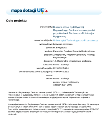 Opis projektu tytuł projektu: Budowa części dydaktycznej Regionalnego Centrum Innowacyjności przy Akademii Techniczno-Rolniczej w Bydgoszczy nazwa beneficjenta: Uniwersytet Technologiczno-Przyrodniczy województwo: kujawsko-pomorskie powiat: m. Bydgoszcz fundusz: Europejski Fundusz Rozwoju Regionalnego program: Zintegrowany Program Operacyjny Rozwoju Regionalnego działanie: 1.3. Regionalna infrastruktura społeczna dziedzina: nauka i edukacja wartość projektu: 22 162 518.81 zł dofinansowanie z Unii Europejskiej: 15 560 019.22 zł ocena: sektor: nauka i edukacja punktor projekt realizowany w latach 2004-2006 Utworzenie „Regionalnego Centrum Innowacyjności” (RCI) przy Uniwersytecie TechnologicznoPrzyrodniczym w Bydgoszczy stanowiło jedno z kluczowych zadań zapisanych w Regionalnej Strategii Innowacji Województwa Kujawsko-Pomorskiego, przyjętej przez Sejmik Województwa KujawskoPomorskiego. Koncepcja utworzenia „Regionalnego Centrum Innowacyjności” (RCI) obejmowała dwa etapy. W pierwszym, zrealizowanym w latach 2004-2006, czyli w czasie trzech ostatnich lat wieloletniego programu Unii Europejskiej, powstała część dydaktyczno-informacyjna RCI. W drugim etapie, obejmującym lata 2007-2013, powstała część związana z rozwojem innowacyjności w regionie w zakresie dyscyplin technicznych i rolniczych. W Centrum, zlokalizowanym na terenie Ośrodka Szkół Wyższych w Fordonie, mieszczą się następujące jednostki: Multimedialne Centrum Kształcenia i Szkoleń, Regionalny Ośrodek Informacji Patentowej, Regionalny Ośrodek Informacji Naukowo – Technicznej, Biuro Monitoringu Zawodów Inżynierskich i Związanych z Rolnictwem, Regionalny Punkt Kontaktowy Programów Europejskich, Regionalna Biblioteka i Czytelnia Techniczna oraz Regionalny Punkt Informacji Normalizacyjnej. Celem planowanej inwestycji było stworzenie możliwości korzystania z potencjału Uczelni zainteresowanym osobom z otoczenia społeczno-gospodarczego, w tym głównie małym i średnim przedsiębiorcom. Funkcje informacyjno – doradczo – szkoleniowe pełnione przez RCI na rzecz przedsiębiorców uzupełnione zostały poprzez udostępnienie zainteresowanym instytucjom i przedsiębiorcom zasobów patentowych, norm przemysłowych, elektronicznych źródeł informacji naukowo-technicznej, infrastruktury informatycznej oraz sal seminaryjnych, konferencyjnych czy pomieszczeń do prezentacji multimedialnych. Dzięki włączeniu do węzła lokalnego Kujawsko-Pomorskiej Sieci Informacyjnej łączami szerokopasmowymi, Multimedialne Centrum Kształcenia i Szkoleń powołane w ramach planowanego projektu, posiada odpowiednią infrastrukturę i bazę techniczną do dostarczania wymienionych rodzajów usług, co przyczynia się zwiększenia wykorzystywania technologii informacyjnych w życiu społecznym i gospodarczym regionu, a tym samym do dalszego postępu w budowaniu społeczeństwa informacyjnego. Istotną barierą w efektywnej współpracy uczelni z przedsiębiorstwami był brak odpowiedniej infrastruktury badawczej, która mogłaby w znaczący sposób przyczynić się do bardziej dynamicznego rozwoju przemysłu w zakresie rozwiązań proinnowacyjnych. Koncepcja utworzenia w oparciu o środki Regionalnego Programu Operacyjnego na lata 2007-2013 sieci akredytowanych laboratoriów o profilu technicznym i technologicznym, jako II etapu realizacji Regionalnego Centrum Innowacyjności miała na celu usunięcie istniejącej przeszkody i zmierzała do utworzenia sieci współpracujących wzajemnie laboratoriów badawczych. Są one zorientowane na ważne z punktu widzenia rozwoju regionu dziedziny badań, działające również na potrzeby przemysłu, a zwłaszcza na rzecz małych i średnich przedsiębiorstw i zorganizowane w formie Centrów Rozwoju Innowacyjności w dyscyplinach technicznych i rolniczych. Laboratoria funkcjonują ściśle w porozumieniu z organizacjami i stowarzyszeniami naukowo-technicznymi, parkami przemysłowymi i przedsiębiorstwami. Rolę koordynatora w tej współpracy pełni Regionalne Centrum Innowacyjności.