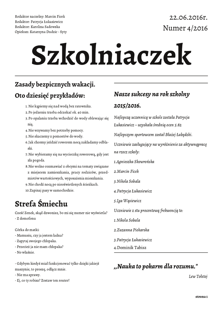 22.06.2016r. Numer 4/2016 Redaktor naczelny: Marcin Ficek Redaktor: Patrycja Łukasiewicz Redaktor: Karolina Sadowska Opiekun: Katarzyna Dudzic - Syty Szkolniaczek Zasady bezpicznych wakacji. Oto dziesięć przykładów: 1. Nie kąpiemy się nad wodą bez ratownika. 2.Po jedzeniu trzeba odczekać ok. 40 min. 3. Po opalaniu trzeba wchodzić do wody oblewając się nią. 4. Nie wzywamy bez potrzeby pomocy. 5. Nie skaczemy z pomostów do wody. 6. Jak chcemy jeździć rowerem nocą zakładamy odblaski. 7. Nie wybieramy się na wycieczkę rowerową, gdy jest zła pogoda. 8.Nie wolno rozmawiać z obcymi na tematy związane z miejscem zamieszkania, pracy rodziców, przedmiotów wartościowych, wyposażenia mieszkania. 9. Nie chodź nocą po nieoświetlonych ścieżkach. 10.Zapinaj pasy w samochodzie. Strefa Śmiechu Cześć Zenek, skąd dzwonisz, bo mi się numer nie wyświetla? - Z domofonu Nasze sukcesy na rok szkolny 2015/2016. Najlepszą uczennicą w szkole została Patrycja Łukasiewicz – uzyskała średnią ocen 5.82 Najlepszym sportowcem został Błażej Łabędzki. Uczniowie zasługujący na wyróżnienie za aktywnąpracę na rzecz szkoły: 1.Agnieszka Skowrońska 2.Marcin Ficek 3.Nikola Sobala 4.Patrycja Łukasiewicz 5.Iga Wąsiewicz Uczniowie z stu procentową frekwencją to: 1.Nikola Sobala Córka do matki: - Mamusiu, czy ja jestem ładna? - Zapytaj swojego chłopaka. - Przecież ja nie mam chłopaka? - No właśnie. 2.Zuzanna Piekarska - Gdybym kiedyś miał funkcjonować tylko dzięki jakiejś maszynie, to proszę, odłącz mnie. - Nie ma sprawy. - Ej, co ty robisz? Zostaw ten router! ,,Nauka to pokarm dla rozumu." 3.Patrycja Łukasiewicz 4.Dominik Tabisz Lew Tołstoj strona 1 Strona Poetycka Prawdziwych przyjaciółpoznaje się Walizka Złote myśly w biedzie. Przyjaźń szczera nie umiera. Czy wiecie, że... ,,Pies to najlepszy przyjaciel człowieka." •Dingo zostały przywiezione z południowej Azji wraz z jedną z fal osadniczych, którą przybyli przodkowie Aborygenów Australijskich. Dingo przybyły do Australii jeszcze nie w pełni udomowione i wtórnie zdziczały. Różnią się od psów domowych wieloma szczegółami, między innymi nie potrafią szczekać. •Ilość receptorów w nosie niedźwiedzia jest 7 razy wieksza, niż u psa i około sto razy większa, niż u człowieka. Znane są przypadki niedźwiedzi polarnych, które ruszały na polowanie za ofiarą zwietrzoną z odległości ponad 60 kilometrów. Przede wszystkim Walizki Nie są po to by stać. Lubią ciągłe podróże; Lubią być jak najdłużej Spakowane po brzegi. Czy to podróż daleka, czy też nie! całkiem bliska; Tak jak piesek na ciebie grzecznie czeka walizka. Zawsze chętna, gotowa ruszyć w podróż, w nieznane. Ale z kim? Nie wiadomo? Jak to z kim? Razem z panem. Wszystkim serdecznie życzymy wesołych, udanych wakacji!!! •Psy husky słyną z niebieskich oczu. Dość często występuje u nich też heterochromia - czyli różnica koloru między lewym, a prawym okiem. •Dla kotów słodki smak nie jest ani pociągający, ani odpychający. Obserwacje właścicieli kotów zostały potwierdzone przez naukowców, którzy mierzyli impulsy przekazywane przez nerwy odpowiedzialne za smak. Wykazywały one silne reakcje na potrawy słone, kwaśne i gorzkie, ale żadnej reakcji na słodkie. Serdecznie wszystkich zapraszamy do tworzenia gazetki szkolnej ,,Szkolniaczek" w następnym roku szkolnym! Redakcja Szkolniaczka strona 2