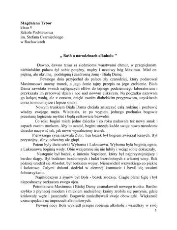 Magdalena Tybor klasa 5 Szkoła Podstawowa im. Stefana Czarnieckiego w Racławicach ,, Baśń o narodzinach alkoholu '' Dawno, dawno temu za siedmioma warstwami chmur, w przepięknym niebiańskim pałacu żył sobie potężny, mądry i uczciwy bóg Maximus. Miał on piękną, ale okrutną, podstępną i zazdrosną żonę - Białą Damę. Pewnego dnia przyjechał do pałacu zły czarodziej, który podarował Maximusowi mocny trunek, a jego żonie tajny przepis na jego zrobienie. Biała Dama zawołała swoich najlepszych elfów do tajnego podziemnego laboratorium i przykazała im pracować dzień i noc nad nowym eliksirem. Na początku nazywała go kolącą wodą, ale z czasem, dzięki swoim diabelskim przyprawom, uzyskiwała coraz to mocniejsze i lepsze smaki. Nowym trunkiem Biała Dama chciała zniszczyć całą rodzinę i pozbawić władzy swojego męża. Wiedziała, że po wypiciu jednego pucharka bogowie przestaną logicznie myśleć i będą całkowicie bezwolni. Co roku bogini miała jedno dziecko i co roku nadawała też nowy smak i zapach swoim trunkom. Aby to uczcić, bogini zaczęła każde swoje nowo narodzone dziecko nazywać tak, jak nowo wynaleziony trunek. Pierwszego syna nazwała Żubr. Ten bożek był bogiem zwierząt leśnych. Był przystojny, silny, odważny ale głupi. Potem były dwie córki Wyborna i Luksusowa. Wyborna była boginią ognia, a Luksusowa boginią wody. Obie wzajemnie się nie lubiły i wciąż sobie dokuczały. Następnie był bożek, o imieniu Napoleon, który był najprzystojniejszy i bardzo skąpy. Był bożkiem bezdomnych i ludzi bezrobotnych z własnej winy. Rok później urodził się Absolut, był bożkiem wojny. Nienawidził wszystkiego co piękne i kolorowe. Całymi dniami siedział w ciemnej komnacie i bawił się swoimi żołnierzykami. Najmłodszym z synów był Bols - bożek złodziei. Ciągle płatał figle i był nieposłuszny rozkazom swego ojca. Potomkowie Maximusa i Białej Damy zasmakowali nowego trunku. Bardzo szybko z płynącej miodem i mlekiem nadniebnej krainy zrobiła się pustynia, gdzie królowały węże i jaszczurki. Bogowie zaniedbywali swoje obowiązki. Większość czasu spędzali na imprezach alkoholowych. Pewnej nocy Bols wykradł przepis robienia alkoholu i wsiadłszy w swój 1 powóz zaprzęgnięty w piętnaście smoków, zawiózł go ludziom mieszkającym na ziemi. Ludzie bardzo szybko sporządzili nowy napój i ze smakiem zaczęli go kosztować. Niewiele wody upłynęło w rzekach, a już całe dnie spędzali na piciu alkoholu. Uważali, że nowy trunek jest rewelacyjny. Po wypiciu kilku pucharków sądzili, że są najmądrzejsi, najdoskonalsi i czuli się bogami. Czas płynął, a skutki picia alkoholu potężniały: ludzie stali się źli, dumni i nie chcieli składać ofiar bogom ani ich czcić. Za swojego boga uważali alkohol. Jemu wystawiali pomniki przedstawiające piętnastometrową flaszkę, a w niej ,,nieśmiertelną duszę''. Z czasem alkohol zmienił stosunki między ludźmi. Zniszczył ludziom mózgi, które powoli zamieniały się w chłonną gąbkę łatwo nasiąkającą po wypiciu trunku. Pijana osoba nie mogła utrzymać głowy prosto na karku. Ciężka głowa kiwała się na wszystkie strony i często opadała bezwładnie, a pijany człowiek bredził bez ładu i składu. Zaczęła narastać ilość konfliktów. Ludzie mieli pretensje do samych siebie i złościli się bez powodu. Stali się bezsilni, bezradni i bezwolni. Panowała agresja i nienawiść. Gdy brakowało alkoholu, ludzie zaczęli o niego walczyć. Wybuchały wojny. Maximus widząc, że bogowie oraz ludzie na ziemi oszaleli na punkcie nowego trunku, postanowił wszystkich ukarać. Ze szczytów niebiańskiej krainy posypały się pioruny. Potężne gromy trafiały we wszystkie domostwa, a święty ogień palił ciała ludzkie. Potężny bóg ukarał też swoją żonę Białą Damę, którą zamienił w etykietę i przylepił ją na jej ulubionym trunku. Ci, co ocaleli, założyli tajną wspólnotę walki z alkoholem. Zaczęli ufać i z pokorą polegać na bogu Maximusie i postępować tak, jakby on tego chciał. Piekielny trunek kazał im zakopać głęboko pod ziemię, gdzie królował Lucyfer król diabłów. Ludzie, którzy nie zapomnieli smaku i zapachu alkoholu, z mozołem kopią wielokilometrowe tunele pod ziemią w poszukiwaniu tego trunku. Słyszano, że niektórym to się udawało. Potajemnie zakładają meliny, gdzie nadal się upijają, ale głęboko w sercu boją się, że kiedyś zakończą swoje życie w męczarniach i w straszliwej samotności. 2