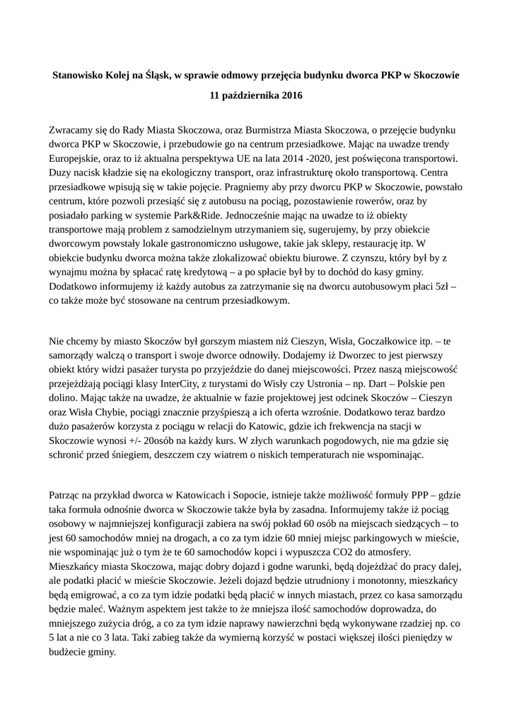 Stanowisko Kolej na Śląsk, w sprawie odmowy przejęcia budynku dworca PKP w Skoczowie 11 października 2016 Zwracamy się do Rady Miasta Skoczowa, oraz Burmistrza Miasta Skoczowa, o przejęcie budynku dworca PKP w Skoczowie, i przebudowie go na centrum przesiadkowe. Mając na uwadze trendy Europejskie, oraz to iż aktualna perspektywa UE na lata 2014 -2020, jest poświęcona transportowi. Duzy nacisk kładzie się na ekologiczny transport, oraz infrastrukturę około transportową. Centra przesiadkowe wpisują się w takie pojęcie. Pragniemy aby przy dworcu PKP w Skoczowie, powstało centrum, które pozwoli przesiąść się z autobusu na pociąg, pozostawienie rowerów, oraz by posiadało parking w systemie Park&Ride. Jednocześnie mając na uwadze to iż obiekty transportowe mają problem z samodzielnym utrzymaniem się, sugerujemy, by przy obiekcie dworcowym powstały lokale gastronomiczno usługowe, takie jak sklepy, restaurację itp. W obiekcie budynku dworca można także zlokalizować obiektu biurowe. Z czynszu, który był by z wynajmu można by spłacać ratę kredytową – a po spłacie był by to dochód do kasy gminy. Dodatkowo informujemy iż każdy autobus za zatrzymanie się na dworcu autobusowym płaci 5zł – co także może być stosowane na centrum przesiadkowym. Nie chcemy by miasto Skoczów był gorszym miastem niż Cieszyn, Wisła, Goczałkowice itp. – te samorządy walczą o transport i swoje dworce odnowiły. Dodajemy iż Dworzec to jest pierwszy obiekt który widzi pasażer turysta po przyjeździe do danej miejscowości. Przez naszą miejscowość przejeżdżają pociągi klasy InterCity, z turystami do Wisły czy Ustronia – np. Dart – Polskie pen dolino. Mając także na uwadze, że aktualnie w fazie projektowej jest odcinek Skoczów – Cieszyn oraz Wisła Chybie, pociągi znacznie przyśpieszą a ich oferta wzrośnie. Dodatkowo teraz bardzo dużo pasażerów korzysta z pociągu w relacji do Katowic, gdzie ich frekwencja na stacji w Skoczowie wynosi +/- 20osób na każdy kurs. W złych warunkach pogodowych, nie ma gdzie się schronić przed śniegiem, deszczem czy wiatrem o niskich temperaturach nie wspominając. Patrząc na przykład dworca w Katowicach i Sopocie, istnieje także możliwość formuły PPP – gdzie taka formuła odnośnie dworca w Skoczowie także była by zasadna. Informujemy także iż pociąg osobowy w najmniejszej konfiguracji zabiera na swój pokład 60 osób na miejscach siedzących – to jest 60 samochodów mniej na drogach, a co za tym idzie 60 mniej miejsc parkingowych w mieście, nie wspominając już o tym że te 60 samochodów kopci i wypuszcza CO2 do atmosfery. Mieszkańcy miasta Skoczowa, mając dobry dojazd i godne warunki, będą dojeżdżać do pracy dalej, ale podatki płacić w mieście Skoczowie. Jeżeli dojazd będzie utrudniony i monotonny, mieszkańcy będą emigrować, a co za tym idzie podatki będą płacić w innych miastach, przez co kasa samorządu będzie maleć. Ważnym aspektem jest także to że mniejsza ilość samochodów doprowadza, do mniejszego zużycia dróg, a co za tym idzie naprawy nawierzchni będą wykonywane rzadziej np. co 5 lat a nie co 3 lata. Taki zabieg także da wymierną korzyść w postaci większej ilości pieniędzy w budżecie gminy. Podczas wizji lokalnej która odbyła się 2.09.2016r. uzyskaliśmy całkiem odmienne informację, które przedstawił przewodniczący Rady Miasta Skoczowa P. Dedio. W budynku dworcowym można umieszczać funkcję mieszkaniową, biurową, handlową itp., ale pod jednym warunkiem – kupujący ewentualnie najemca nie będzie wnosił żadnych roszczeń do hałasów wytwarzanych przez przejeżdżające pociągi. Co do kwestii najmowania pomieszczenia dla TK Telekom – cesja umowy najmu zgodnie z informacją jaką my posiadamy – ma przejść na nowego właściciela i to on ma pobierać z niego profity. Generalnie podczas wizji dało się wyczuć niechęć Radnych do budynku. W toku polemiki podczas wizji, usłyszeliśmy z ust Pana Przewodniczącego Dedio, oraz Pani Radnej Papkali, iż nie ma funduszy UE na takie prace. Państwo nie byli świadomi, że aktualnie PKP PLK wykonuje projekt dla rewitalizacji linii na odcinku Chybie - Wisła oraz Goleszów - Skoczów. Nie brali pod uwagę że w najbliższych latach będzie ta linia wyremontowana do prędkości 80-100km/h. Na nasz postulat, że ludzie jeżdżą do Skoczowa z Katowic, oraz z Skoczowa do Katowic, a ich średnia frekwencja to około 20 osób, usłyszeliśmy z ust Pana Dedio, że „jak on patrzy z okna to pociągi jeżdżą puste”. Zapytaliśmy także o nową perspektywę UE – iż kładzie ona nacisk na transport zbiorowy w tym kolej. Że są specjalne fundusze takie jak ZIT, RPO, Tritia. Państwo Radni w ogóle nie wiedzieli o czym mówimy – byli w ogóle nie zorientowani w możliwościach z jakich szło by pozyskać środki – a z jednego funduszu np. Cieszyn będzie wykonywał przebudowę swojego dworca kolejowego na centrum przesiadkowe. Zapytaliśmy także o inną formę pozyskania funduszu – formułę PPP. Usłyszeliśmy że to jest śliska i nie wygodna formuła – nam wydaje się że bardzo dobra, dodatkowo Radni poinformowali nas, że nikt w Skoczowie inwestować nie chce. Formuła taka wyłoniła by partnera biznesowego – inwestora, wraz z którym można by powołać spółkę celową, w której Gmina aportem mogła by dać obiekt, a inwestor pieniądze na inwestycję. Oczywiście by to się opłacało inwestycja musi być określona na czas około 30 lat, by inwestor umiał się skredytować. Z zysku który pochodził by z wynajmu lokali pod usługi, restaurację itp., można by utrzymać obiekt – a może i by wystarczyło na wypłatę dywidendy do kasy miasta. Była także podjęta kwestia „źle wynegocjowanych warunków przejęcia”. Wraz z członkiem Kolej na Śląsk zapytaliśmy – czy Rada lub jej przedstawiciel, uczestniczył w spotkaniu w którym uzgadnian