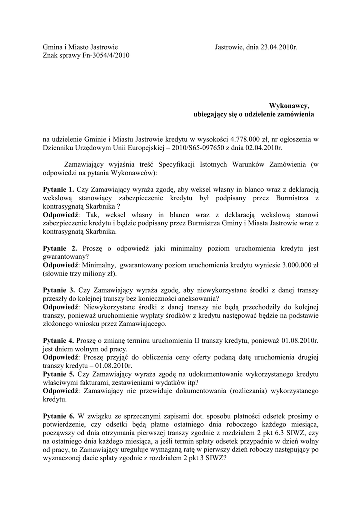Gmina i Miasto Jastrowie Znak sprawy Fn-3054/4/2010 Jastrowie, dnia 23.04.2010r. Wykonawcy, ubiegający się o udzielenie zamówienia na udzielenie Gminie i Miastu Jastrowie kredytu w wysokości 4.778.000 zł, nr ogłoszenia w Dzienniku Urzędowym Unii Europejskiej – 2010/S65-097650 z dnia 02.04.2010r. Zamawiający wyjaśnia treść Specyfikacji Istotnych Warunków Zamówienia (w odpowiedzi na pytania Wykonawców): Pytanie 1. Czy Zamawiający wyraŜa zgodę, aby weksel własny in blanco wraz z deklaracją wekslową stanowiący zabezpieczenie kredytu był podpisany przez Burmistrza z kontrasygnatą Skarbnika ? Odpowiedź: Tak, weksel własny in blanco wraz z deklaracją wekslową stanowi zabezpieczenie kredytu i będzie podpisany przez Burmistrza Gminy i Miasta Jastrowie wraz z kontrasygnatą Skarbnika. Pytanie 2. Proszę o odpowiedź jaki minimalny poziom uruchomienia kredytu jest gwarantowany? Odpowiedź: Minimalny, gwarantowany poziom uruchomienia kredytu wyniesie 3.000.000 zł (słownie trzy miliony zł). Pytanie 3. Czy Zamawiający wyraŜa zgodę, aby niewykorzystane środki z danej transzy przeszły do kolejnej transzy bez konieczności aneksowania? Odpowiedź: Niewykorzystane środki z danej transzy nie będą przechodziły do kolejnej transzy, poniewaŜ uruchomienie wypłaty środków z kredytu następować będzie na podstawie złoŜonego wniosku przez Zamawiającego. Pytanie 4. Proszę o zmianę terminu uruchomienia II transzy kredytu, poniewaŜ 01.08.2010r. jest dniem wolnym od pracy. Odpowiedź: Proszę przyjąć do obliczenia ceny oferty podaną datę uruchomienia drugiej transzy kredytu – 01.08.2010r. Pytanie 5. Czy Zamawiający wyraŜa zgodę na udokumentowanie wykorzystanego kredytu właściwymi fakturami, zestawieniami wydatków itp? Odpowiedź: Zamawiający nie przewiduje dokumentowania (rozliczania) wykorzystanego kredytu. Pytanie 6. W związku ze sprzecznymi zapisami dot. sposobu płatności odsetek prosimy o potwierdzenie, czy odsetki będą płatne ostatniego dnia roboczego kaŜdego miesiąca, począwszy od dnia otrzymania pierwszej transzy zgodnie z rozdziałem 2 pkt 6.3 SIWZ, czy na ostatniego dnia kaŜdego miesiąca, a jeśli termin spłaty odsetek przypadnie w dzień wolny od pracy, to Zamawiający ureguluje wymaganą ratę w pierwszy dzień roboczy następujący po wyznaczonej dacie spłaty zgodnie z rozdziałem 2 pkt 3 SIWZ? Odpowiedź: Zamawiający w rozdziale 2 pkt 6.3 SIWZ zapisał: „Spłata odsetek nastąpi bez okresu karencji, ostatniego dnia kaŜdego miesiąca. W przypadku, gdy termin spłaty kredytu lub odsetek przypadnie w dzień wolny od pracy, to Zamawiający ureguluje wymaganą ratę w pierwszy dzień roboczy następujący po wyznaczonej dacie spłaty”. Pytanie 7. Proszę o potwierdzenie, Ŝe dla wyliczenia ceny oferty przyjąć uruchomienie transz kredytu zgodnie z rozdziałem 2 pkt 2 Odpowiedź: Zamawiający potwierdza, Ŝe dla wyliczenia ceny oferty naleŜy przyjąć uruchomienie transz kredytu zgodnie z rozdziałem 2 pkt 2 . Pytanie 8. Proszę o potwierdzenie, Ŝe zarówno do wyliczenia ceny oferty jak i w umowie kredytowej będzie obowiązywał kalendarz rzeczywisty? Odpowiedź: Wykonawcy powinni przyjąć do obliczenia ceny udzielenia kredytu kalendarz odsetek obowiązujący w banku oferującym kredyt. Pytanie 9. Czy Zamawiający wyraŜa zgodę na zapis: „Zamawiający przewiduje moŜliwość zmiany umowy kredytowej w części dotyczącej zmiany harmonogramu spłat kredytu w przypadku przedterminowej spłaty części kredytu”. Odpowiedź: Tak, wynika to z zapisów SIWZ (rozdział 2) gdzie przewidziano prawo wcześniejszej spłaty kredytu lub rezygnacji z części kredytu bez dodatkowych kosztów związanych z wcześniejszą spłatą, a w rozdziale 21 ust. 7 pkt 4 – zmianę harmonogramu spłaty kredytu. W związku z tym w rozdziale 21 SIWZ, w ust. 7 dodaje się pkt 6 o brzmieniu: „6) Zamawiający przewiduje moŜliwość zmiany umowy kredytowej w części dotyczącej zmiany harmonogramu spłat kredytu w przypadku przedterminowej spłaty części kredytu”.