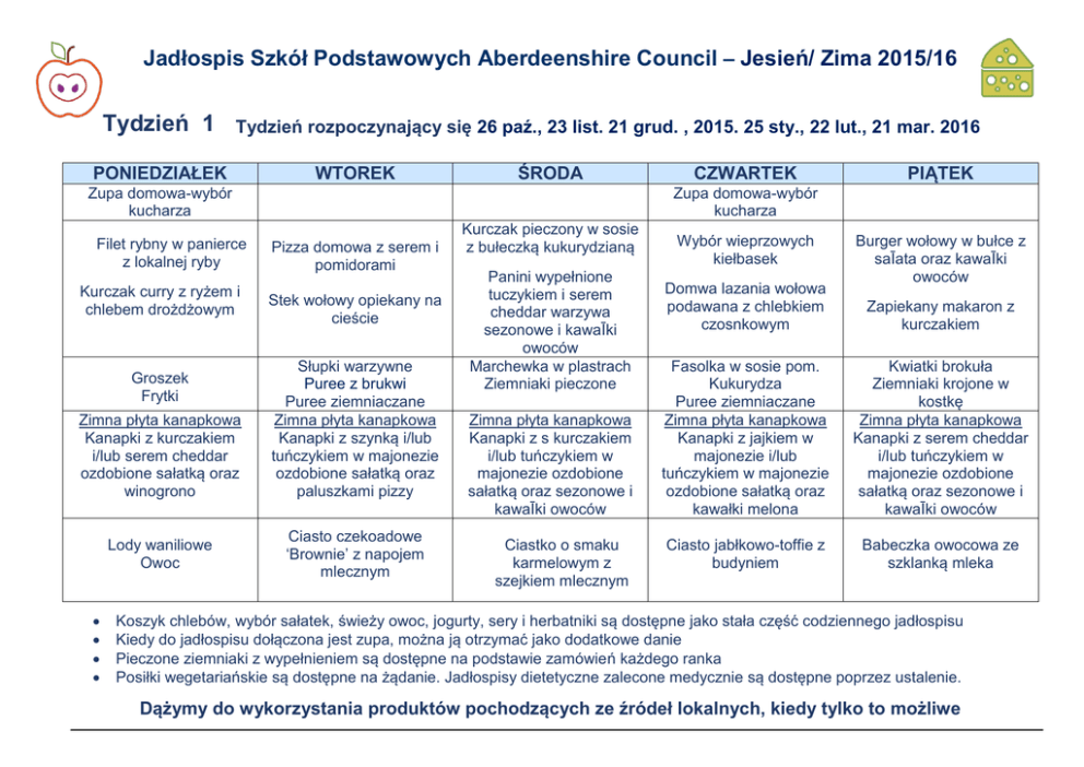 Jadłospis Szkół Podstawowych Aberdeenshire Council – Jesień/ Zima 2015/16 Tydzień 1 Tydzień rozpoczynający się 26 paź., 23 list. 21 grud. , 2015. 25 sty., 22 lut., 21 mar. 2016 PONIEDZIAŁEK WTOREK ŚRODA Zupa domowa-wybór kucharza Filet rybny w panierce z lokalnej ryby Kurczak curry z ryżem i chlebem drożdżowym Groszek Frytki Zimna płyta kanapkowa Kanapki z kurczakiem i/lub serem cheddar ozdobione sałatką oraz winogrono Lody waniliowe Owoc CZWARTEK PIĄTEK Zupa domowa-wybór kucharza Pizza domowa z serem i pomidorami Stek wołowy opiekany na cieście Słupki warzywne Puree z brukwi Puree ziemniaczane Zimna płyta kanapkowa Kanapki z szynką i/lub tuńczykiem w majonezie ozdobione sałatką oraz paluszkami pizzy Ciasto czekoadowe ‘Brownie’ z napojem mlecznym Kurczak pieczony w sosie z bułeczką kukurydzianą Panini wypełnione tuczykiem i serem cheddar warzywa sezonowe i kawaĪki owoców Marchewka w plastrach Ziemniaki pieczone Zimna płyta kanapkowa Kanapki z s kurczakiem i/lub tuńczykiem w majonezie ozdobione sałatką oraz sezonowe i kawaĪki owoców Ciastko o smaku karmelowym z szejkiem mlecznym Wybór wieprzowych kiełbasek Domwa lazania wołowa podawana z chlebkiem czosnkowym Burger wołowy w bułce z saĪata oraz kawaĪki owoców Zapiekany makaron z kurczakiem Fasolka w sosie pom. Kukurydza Puree ziemniaczane Zimna płyta kanapkowa Kanapki z jajkiem w majonezie i/lub tuńczykiem w majonezie ozdobione sałatką oraz kawałki melona Kwiatki brokuła Ziemniaki krojone w kostkę Zimna płyta kanapkowa Kanapki z serem cheddar i/lub tuńczykiem w majonezie ozdobione sałatką oraz sezonowe i kawaĪki owoców Ciasto jabłkowo-toffie z budyniem Babeczka owocowa ze szklanką mleka Koszyk chlebów, wybór sałatek, świeży owoc, jogurty, sery i herbatniki są dostępne jako stała część codziennego jadłospisu Kiedy do jadłospisu dołączona jest zupa, można ją otrzymać jako dodatkowe danie Pieczone ziemniaki z wypełnieniem są dostępne na podstawie zamówień każdego ranka Posiłki wegetariańskie są dostępne na żądanie. Jadłospisy dietetyczne zalecone medycznie są dostępne poprzez ustalenie. Dążymy do wykorzystania produktów pochodzących ze źródeł lokalnych, kiedy tylko to możliwe Jadłospis Szkół Podstawowych Aberdeenshire Council – Jesień/ Zima 2015/16 Tydzień 2 PONIEDZIAŁEK Tydzień rozpoczynający się 2 list., 30 list., 2015. 4 sty., 1 lut. oraz 28 mar. 2016 WTOREK ŚRODA Zupa domowa-wybór kucharza Tradycyjny kurczak w cieście paluszki rybne CZWARTEK PIĄTEK Zupa domowa-wybór kucharza Wołowina lokalna pieczona w sosie z kukurydzą Tradycyjny makaron w sosie serowym Filet rybny w panierce z lokalnej ryby Indyk panierowany w bułce oraz sezonowe i kawaĪki owoców Wybór kiełbasek wieprzowych orasz ‘Yorkshire Pudding’ Bagietka z gorącym grillowanym kurczakiem oraz warzywa sezonowe i kawaĪki owoców Kurczak w słodkim chili z ryżem Mięso w sosie z owsianym ciastem Groszek Frytki Burak w plastrach Marchewka w plastrach Puree ziemniaczane Zimna płyta kanapkowa Kanapki z tuńczykiem w majonezie i/lub serem cheddar podane z sałatką oraz sezonowe i kawaĪki owoców Zimna płyta kanapkowa Kanapki z szynką i/lub tuńczykiem w majonezie podane z sałatką oraz sezonowe i kawaĪki owoców Kwiatki brokuła Fasolka w sosie pom. Puree ziemniaczane Marchew w plastrach Burak w plastrach Gotowame ziemniaki Zimna płyta kanapkowa Kanapki z tuńczykiem w majonezie i/lub serem cheddar ozdobione sałatką oraz winogrono Zimna płyta kanapkowa Kanapki z kurczakiem i/lub szynką ozdobione sałatką z oraz kawałki melona Zimna płyta kanapkowa Kanapki z jajkiem w majonezie i/lub tuńczykiem w majonezie ozdobione sałatką oraz winogrono Ciasto jogurtowoczekoladowe z budyniem Galaretka z owocem Herbatniki otrębowe z napojem mlecznym bananowy piernik z budyniem Rolada Jammy Swiss z budyniem Jadłospis Szkół Podstawowych Aberdeenshire Council – Jesień/ Zima 2015/16 Tydzień 3 PONIEDZIAŁEK Tydzień rozpoczynający się 9 list., 7 gru. 2015. 11 sty., 8 lut. & 7 mar. 2016 WTOREK ŚRODA CZWARTEK Zupa domowa-wybór kucharza Pizza domowa z serem i pomidorami Kurczak pieczony w sosie z kukurydzą Kremowy makaron z szynką z chlebem czosnkowym Zawijana tortilla z mięsem mielonym wołowym Kukurydza Puree ziemniaczane Kwiatki brokułów Pieczone ziemniaki Zimna płyta Kanapki z kurczakiem i/lub tuńczykiem w majonezie ozdobione sałatką oraz paluszki pizzy Zimna płyta Kanapki z szynką i/lub serem cheddar ozdobione sałatką oraz winogrono Precel czekoladowy z budyniem Babeczka cytrynowa podana z szejkiem mlecznym Wybór kiełbasek wieprzowych oraz sezonowe i kawaĪki owoców Filet rybny w panierce z lokalnej ryby Serowe kółeczka Kurczak curry z ryżem i chlebem drożdżowym Marchewka w plastrach Ziemniaki krojone w kostkę Zimna płyta Kanapki z jajkiem w majonezie i/lub Kurczak z maj. w cieście z sałatką oraz sezonowe i kawaĪki owoców Biszkopt toffi z budyniem Fasolka w sosie pom. Burak w plastrach Frytki Zimna płyta Kanapki z tuńczykiem w majonezie i/lub szynką ozdobione sałatką oraz kawałki melona Ciasto czekoladowe z budyniem PIĄTEK Zupa domowa-wybór kucharza Spaghetti Bolognaise podane z chlebkiem czosnkowym Zapiekana bułka Panini wypełniona serem cheddar z szynką oraz sezonowe i kawaĪki owoców Groszek Zimna płyta Kanapki z serem cheddar i/lub tuńczykiem w majonezie podane z sałatką oraz sezonowe i kawaĪki owoców Ciasto Melba brzoskwiniowa Jadłospis Szkół Podstawowych Aberdeenshire Council – Jesień/ Zima 2015/16 Tydzień 4 PONIEDZIAŁEK Tydzień rozpoczynający się 16 list. & 14 gru. 2015. 18 sty., 15 lut., 14 mar. 2016 WTOREK ŚRODA CZWARTEK Zupa domowa-wybór kucharza Burger wołowy w bułce oraz warzywa sezonowe i kawaĪki owoców slodko-kwasne warzywa z makaronem Tradycyjny kurczak w cieście Zapiekana bułka Panini wypełniona serem cheddar oraz sezonowe i kawaĪki owoców Kukurydza Marchew w p