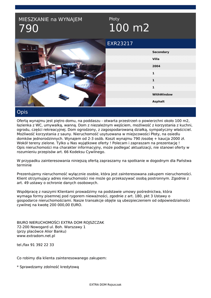 Płoty MIESZKANIE na WYNAJEM 100 m2 790 EXR23217 Secondary Villa 2004 1 1 1 WithWindow Asphalt Opis Ofertą wynajmu jest piętro domu, na poddaszu - otwarta przestrzeń o powierzchni około 100 m2, łazienka z WC, umywalką, wanną. Dom z niezależnym wejściem, możliwość z korzystania z kuchni, ogrodu, części rekreacyjnej. Dom ogrodzony, z zagospodarowaną działką, sympatyczny właściciel. Możliwość korzystania z sauny. Nieruchomość usytuowana w miejscowości Płoty, na osiedlu domków jednorodzinnych. Wynajem od 2-3 osób. Koszt wynajmu 790 /osobę + kaucja 2000 zł. Wokół tereny zielone. Tylko u Nas wyjątkowe oferty ! Polecam i zapraszam na prezentację ! Opis nieruchomości ma charakter informacyjny, może podlegać aktualizacji, nie stanowi oferty w rozumieniu przepisów art. 66 Kodeksu Cywilnego. W przypadku zainteresowania niniejszą ofertą zapraszamy na spotkanie w dogodnym dla Państwa terminie Prezentujemy nieruchomość wyłącznie osobie, która jest zainteresowana zakupem nieruchomości. Klient otrzymujący adres nieruchomości nie może go przekazywać osobą postronnym. Zgodnie z art. 49 ustawy o ochronie danych osobowych. Współpracę z naszymi Klientami prowadzimy na podstawie umowy pośrednictwa, która wymaga formy pisemnej pod rygorem nieważności, zgodnie z art. 180, pkt 3 Ustawy o gospodarce nieruchomościami. Nasze transakcje objęte są ubezpieczeniem od odpowiedzialności cywilnej na kwotę 200 000,00 EURO. BIURO NIERUCHOMOŚCI EXTRA DOM ROJSZCZAK 72-200 Nowogard ul. Boh. Warszawy 1 (przy placówce Alior Banku) www.extradom.net.pl tel./fax 91 392 22 33 Co robimy dla klienta zainteresowanego zakupem: * Sprawdzamy zdolność kredytową EXTRA DOM Rojszczak * Wyszukujemy odpowiednią nieruchomość, * Pomagamy w prowadzeniu negocjacji, * Pomagamy w uzyskaniu potrzebnych dokumentów * Pomagamy w uzyskaniu kredytu hipotecznego * Współpracujemy z kancelariami notarialnymi, geodetami Korzystając z naszych usług oszczędzasz swój czas, a także zyskujesz pewność, że Twoja transakcja zostanie przeprowadzona z należytą starannością, w sposób profesjonalny i co najważniejsze - BEZPIECZNY. Nr licencji pośredników: 21317, 21318 Dorota Więzowska tel. 517 770 353 tel. (91) 392 22 33 email: [email protected] EXTRA DOM Rojszczak Powered by TCPDF (www.tcpdf.org)