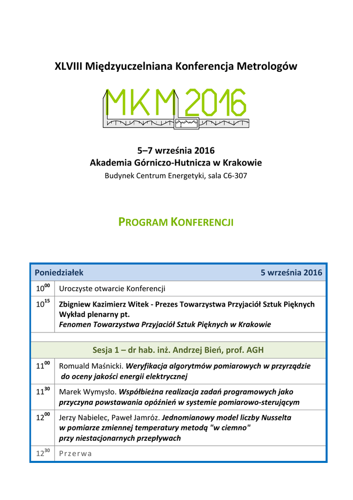 XLVIII Międzyuczelniana Konferencja Metrologów 5–7 września 2016 Akademia Górniczo-Hutnicza w Krakowie Budynek Centrum Energetyki, sala C6-307 PROGRAM KONFERENCJI Poniedziałek 00 10 15 10 5 września 2016 Uroczyste otwarcie Konferencji Zbigniew Kazimierz Witek - Prezes Towarzystwa Przyjaciół Sztuk Pięknych Wykład plenarny pt. Fenomen Towarzystwa Przyjaciół Sztuk Pięknych w Krakowie Sesja 1 – dr hab. inż. Andrzej Bień, prof. AGH 00 11 30 11 00 12 30 12 Romuald Maśnicki. Weryfikacja algorytmów pomiarowych w przyrządzie do oceny jakości energii elektrycznej Marek Wymysło. Współbieżna realizacja zadań programowych jako przyczyna powstawania opóźnień w systemie pomiarowo-sterującym Jerzy Nabielec, Paweł Jamróz. Jednomianowy model liczby Nusselta w pomiarze zmiennej temperatury metodą "w ciemno" przy niestacjonarnych przepływach Prz er wa Sesja 2 (dydaktyczna) – dr hab. inż. Dariusz Świsulski, prof. PG 00 13 30 13 00 14 Anna Szlachta. Przyrządy wirtualne wspomagające nauczanie podstaw metrologii Grzegorz Pankanin. Czy studenci wydziałów elektronicznych mogą polubić laboratorium podstaw pomiarów? Ob iad w r e stau ra cji Ob i eży ś wi at Sesja 3 – prof. dr hab. inż. Leon Swędrowski 00 15 30 15 00 16 30 16 00 17 Adam Ilnicki, Mariusz R. Rząsa. Stanowisko do badania silnika pneumatycznego Sławomir Gryś. Bezprzewodowy pomiar ciśnienia i temperatury powietrza w kole samochodowym Maria Wrzuszczak, Yuriy Khoma. Error correction of impedance-voltage converter with neural network application Andrzej Ożadowicz, Jakub Grela. System aktywnego zarządzania popytem na energię w budynkach Ws p óln e wy j śc ie n a Ry n ek Kra ko w ski Zw i ed zan i e Po d zi e mi Ry n ku i u ro czy sta ko lac ja Wtorek 6 września 2016 Sesja 4 – dr hab. inż. Maria Wrzuszczak, prof. PO 30 9 00 10 30 10 00 11 30 11 Mariusz R. Rząsa, Joanna Boguniewicz-Zabłocka. Sposób analizy wyznaczania trajektorii ruchu pęcherzyka gazu poprzez śledzenie jego środka masy i orientacji przestrzennej Dariusz Kasprzak, Andrzej Mrowiec. Pomiar kryzą segmentową strumienia medium dla małych liczb Reynoldsa Marek Kciuk, Sebastian Bartel. Zastosowanie algorytmu genetycznego w celu wyznaczenia współczynników wzmocnienia wzmacniacza wejściowego rejestratora sygnałów Witold Aksamit, Jakub Rzeszutko. Application of GaN transistors to increase efficiency of switched-mode power supplies Prz er wa Sesja 5 – dr hab. inż. Sławomir Gryś, prof. PCz 00 12 30 12 00 13 00 14 30 14 Krzysztof Tomczyk. Relationship between the number of Monte Carlo trials applied for modelling voltage output accelerometers and the maximum dynamic errors Marta Wiśniewska. A deep-flick standard applied for determination of FMM sensor indication errors Bartosz Dominikowski, Krzysztof Pacholski. Korekcja właściwości metrologicznych przetworników szybkozmiennych sygnałów elektronicznych Ob iad w r e stau ra cji Ob i eży ś wi at Wy jazd n a s e sj ę do Politechniki Krakowskiej Małopolskie Laboratorium Budownictwa Energooszczędnego Sesja 6 (na terenie PK) – mgr inż. Paweł Kwasnowski 00 15 30 15 00 16 30 16 00 17 30 19 Grzegorz Hayduk, Paweł Kwasnowski, Małgorzata Fedorczak-Cisak, Marcin Furtak. Wybrane zagadnienia systemu opomiarowania specjalistycznego w budynku Małopolskiego Laboratorium Budownictwa Energooszczędnego Politechniki Krakowskiej Zbigniew Mikoś, Marcin Jachimski, Grzegorz Hayduk, Grzegorz Wróbel, Paweł Kwasnowski. Algorytmy zamiany odczytów czasowych liczników energii na wirtualne odczyty zdarzeniowe Grzegorz Hayduk, Marcin Jachimski, Paweł Kwasnowski, Zbigniew Mikoś, Grzegorz Wróbel. System akwizycji, rejestracji i wspomagania analizy zużycia energii elektrycznej Grzegorz Wróbel, Marcin Jachimski, Grzegorz Hayduk, Paweł Kwasnowski. Pośrednie pomiary zużycia energii elektrycznej w systemach automatyki budynków Wy c ie czk a t ec h n i czn a Kon w en t S en i oró w Środa 7 września 2016 Sesja 7 – dr hab. inż. Mariusz Rząsa, prof. PO 30 9 00 10 30 10 00 11 30 11 00 13 Stanisław Szczesny, Marek Wołoszyk, Michał Ziółko. Sprzętowa symulacja uszkodzeń w diagnostyce magnesów nadprzewodzących Grzegorz Sieklucki, Adam Pracownik, Tadeusz Orzechowski. Reconstruction of the unmeasured signals in a two-mass system - filtering analysis Szymon Barczentewicz, Jerzy Nabielec, Andrzej Wetula. High-voltage divider with automatic calibration - model tests Marek Kciuk, Marcelina Mrógała. Moduł rejestracji warunków środowiskowych dla stanowiska pomiarowego Zamknięcie obrad i zakończenie konferencji Ob iad w r e stau ra cji Ob i eży ś wi at