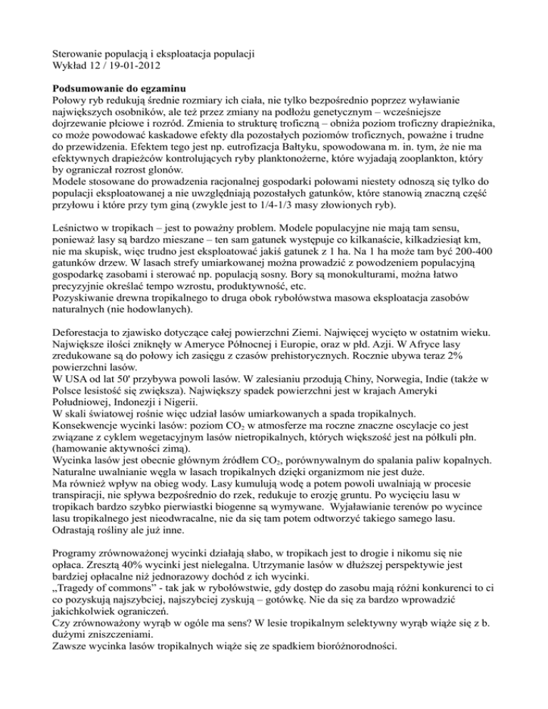 Sterowanie populacją i eksploatacja populacji Wykład 12 / 19-01-2012 Podsumowanie do egzaminu Połowy ryb redukują średnie rozmiary ich ciała, nie tylko bezpośrednio poprzez wyławianie największych osobników, ale też przez zmiany na podłożu genetycznym – wcześniejsze dojrzewanie płciowe i rozród. Zmienia to strukturę troficzną – obniża poziom troficzny drapieżnika, co może powodować kaskadowe efekty dla pozostałych poziomów troficznych, poważne i trudne do przewidzenia. Efektem tego jest np. eutrofizacja Bałtyku, spowodowana m. in. tym, że nie ma efektywnych drapieżców kontrolujących ryby planktonożerne, które wyjadają zooplankton, który by ograniczał rozrost glonów. Modele stosowane do prowadzenia racjonalnej gospodarki połowami niestety odnoszą się tylko do populacji eksploatowanej a nie uwzględniają pozostałych gatunków, które stanowią znaczną część przyłowu i które przy tym giną (zwykle jest to 1/4-1/3 masy złowionych ryb). Leśnictwo w tropikach – jest to poważny problem. Modele populacyjne nie mają tam sensu, ponieważ lasy są bardzo mieszane – ten sam gatunek występuje co kilkanaście, kilkadziesiąt km, nie ma skupisk, więc trudno jest eksploatować jakiś gatunek z 1 ha. Na 1 ha może tam być 200-400 gatunków drzew. W lasach strefy umiarkowanej można prowadzić z powodzeniem populacyjną gospodarkę zasobami i sterować np. populacją sosny. Bory są monokulturami, można łatwo precyzyjnie określać tempo wzrostu, produktywność, etc. Pozyskiwanie drewna tropikalnego to druga obok rybołówstwa masowa eksploatacja zasobów naturalnych (nie hodowlanych). Deforestacja to zjawisko dotyczące całej powierzchni Ziemi. Najwięcej wycięto w ostatnim wieku. Największe ilości zniknęły w Ameryce Północnej i Europie, oraz w płd. Azji. W Afryce lasy zredukowane są do połowy ich zasięgu z czasów prehistorycznych. Rocznie ubywa teraz 2% powierzchni lasów. W USA od lat 50' przybywa powoli lasów. W zalesianiu przodują Chiny, Norwegia, Indie (także w Polsce lesistość się zwiększa). Największy spadek powierzchni jest w krajach Ameryki Południowej, Indonezji i Nigerii. W skali światowej rośnie więc udział lasów umiarkowanych a spada tropikalnych. Konsekwencje wycinki lasów: poziom CO2 w atmosferze ma roczne znaczne oscylacje co jest związane z cyklem wegetacyjnym lasów nietropikalnych, których większość jest na półkuli płn. (hamowanie aktywności zimą). Wycinka lasów jest obecnie głównym źródłem CO2, porównywalnym do spalania paliw kopalnych. Naturalne uwalnianie węgla w lasach tropikalnych dzięki organizmom nie jest duże. Ma również wpływ na obieg wody. Lasy kumulują wodę a potem powoli uwalniają w procesie transpiracji, nie spływa bezpośrednio do rzek, redukuje to erozję gruntu. Po wycięciu lasu w tropikach bardzo szybko pierwiastki biogenne są wymywane. Wyjaławianie terenów po wycince lasu tropikalnego jest nieodwracalne, nie da się tam potem odtworzyć takiego samego lasu. Odrastają rośliny ale już inne. Programy zrównoważonej wycinki działają słabo, w tropikach jest to drogie i nikomu się nie opłaca. Zresztą 40% wycinki jest nielegalna. Utrzymanie lasów w dłuższej perspektywie jest bardziej opłacalne niż jednorazowy dochód z ich wycinki. „Tragedy of commons” - tak jak w rybołówstwie, gdy dostęp do zasobu mają różni konkurenci to ci co pozyskują najszybciej, najszybciej zyskują – gotówkę. Nie da się za bardzo wprowadzić jakichkolwiek ograniczeń. Czy zrównoważony wyrąb w ogóle ma sens? W lesie tropikalnym selektywny wyrąb wiąże się z b. dużymi zniszczeniami. Zawsze wycinka lasów tropikalnych wiąże się ze spadkiem bioróżnorodności. Można tworzyć rezerwaty (co jest i tak trudne do egzekwowania), ale wtedy sprzyja to nasilaniu się presji poza nimi, powstają wyspy lasu, nasila się efekt krawędzi (nielegalny dostęp łatwiejszy, penetracja gatunków inwazyjnych, drapieżników). Generalnie lasy tropikalne są bardzo wrażliwe na eksploatację, zawsze zachodzi degradacja. Przyszłość leśnictwa powinna się opierać tylko na lasach strefy umiarkowanej, ale wiele krajów tropikalnych tylko z tego się utrzymuje. Podsumowanie Eksploatacja populacji naturalnych prowadzi z reguły do szerokich, nieprzewidywalnych i niekorzystnych efektów. Modele nie przewidują zmian ewolucyjnych, dotyczą populacji eksploatowanych na poziomie tylko zmian demograficznych. Drapieżnictwo miało bardzo duży, selekcyjny wpływ na ewolucję, spowodowało rozwinięcie się wielu cech jak lot, szybki bieg, etc. i taki też jest wpływ człowieka. Zmienia on populacje eksploatowane zwykle w sposób niekorzystny wobec celów eksploatacji (jak redukcja somatycznego wzrostu u ryb, ekstynkcja), bo powoduje że zasobów jest coraz mniej i są coraz trudniejsze do pozyskania. Korzystne jest wprowadzanie jakichkolwiek ograniczeń np. na połów, uwłaszczenia i koncesje. Wieloryby prawie wyginęły z powodu eksploatacji, z powodu intensywnych połowów. Eksploatowano od największych do coraz mniejszych gatunków w miarę ich wytępienia. Tylko całkowity zakaz połowów zapobiegł ich wyginięciu na Ziemi. Duże drapieżniki są eksploatowane przede wszystkim w morzach. Są one nieliczne ze względu na rozmiary i poziom w sieci troficznej – nie mogą tworzyć gęstych populacji. Do drapieżników na wysokich poziomach troficznych dociera bardzo niewielka część energii, tylko ok. 10% a morza i tak są bardzo mało produktywne – jak tereny półpustynne. Człowiek eksploatuje zasoby inaczej niż drapieżniki – celuje w największe i najdorodniejsze sztuki a nie małe, schorowane, i poluje bez względu na liczebność populacji ofiary, podczas gdy naturalne drapieżniki polują zwykle na ofiary o największej liczebności populacji. Normy dla polowania zwykle się wyznacza, tak, że nie można polować na mniejsze niż... to powoduje e