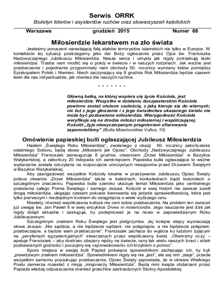 Serwis ORRK Biuletyn liderów i asystentów ruchów oraz stowarzyszeń katolickich Warszawa grudzień 2015 Numer 68 Miłosierdzie lekarstwem na zło świata Jesteśmy poruszeni narastającą falą ataków terrorystów islamskich nie tylko w Europie. W kontekście tej sytuacji postrzegamy jako dar Boży ogłoszenie przez Ojca św. Franciszka Nadzwyczajnego Jubileuszu Miłosierdzia. Nasze serca i umysły jak nigdy potrzebują łaski miłosierdzia. Trzeba nam modlić się o pokój w świecie i w naszych rodzinach. Jak ważne jest przebaczenie i pojednanie przypomniały nam obchody 50. rocznicy wymiany listów pomiędzy Episkopatem Polski i Niemiec. Niech zaczynający się 8 grudnia Rok Miłosierdzia będzie czasem łaski dla nas indywidualnie, jak również dla naszych ruchów. * * * * * * * Główną belką, na której wspiera się życie Kościoła, jest miłosierdzie. Wszystko w działaniu duszpasterskim Kościoła powinno zostać otulone czułością, z jaką kieruje się do wiernych; nic też z jego głoszenia i z jego świadectwa ukazanego światu nie może być pozbawione miłosierdzia. Wiarygodność Kościoła weryfikuje się na drodze miłości miłosiernej i współczującej. Kościół „żyje niewyczerpanym pragnieniem ofiarowania zapomnieliśmy” (Bulla Misericordiae Vultus, 10) Omówienie papieskiej bulli ogłaszającej Jubileusz Miłosierdzia Hasłem „Świętego Roku Miłosierdzia”, zwołanego z okazji 50. rocznicy zakończenia ostatniego Soboru, będą słowa „Miłosierni jak Ojciec”. Obchody „Nadzwyczajnego Jubileuszu Miłosierdzia” Franciszek zainauguruje 8 grudnia, otwarciem „Drzwi Miłosierdzia” w Bazylice Watykańskiej, a zakończy 20 listopada ich zamknięciem. Papieska bulla ogłaszająca to ważne wydarzenie została odczytana na rozpoczęcie uroczystych nieszporów przed Drzwiami Świętymi w Bazylice Watykańskiej. Aby zaangażować wszystkie Kościoły lokalne w przeżywanie Jubileuszu Ojciec Święty poleca otwarcie „Drzwi Miłosierdzia” także w katedrach, konkatedrach bądź kościołach o szczególnym znaczeniu. Papieska bulla szeroko ukazuje temat Miłosierdzia jako centralnego przesłania całego Pisma Świętego i samego Jezusa. Kościół w swej historii nie zawsze szedł drogą miłosierdzia, ulegając czasem pokusie kierowania się jedynie sprawiedliwością, która jest tylko pierwszym i niezbędnym krokiem do osiągnięcia o wiele wyższego celu. Niestety, również współczesna kultura nie ceni sobie przebaczenia. Na problem ten zwracał już uwagę św. Jan Paweł II w swej encyklice Dives in misericordia. Jego nauczanie jest dziś jak nigdy dotąd aktualne i zasługuje, by podejmować je na nowo w zapowiedzianym Roku Jubileuszowym. Szczególnym znakiem Roku Świętego jest pielgrzymka. Jej kolejne etapy wyznaczają słowa Jezusa: „Nie sądźcie, a nie będziecie sądzeni; nie potępiajcie, a nie będziecie potępieni; przebaczajcie, a będzie wam przebaczone”. Franciszek zachęca do wyjścia ku ludziom żyjącym na „peryferiach egzystencjalnych” stwarzanych przez współczesny świat. „Otwórzmy oczy – apeluje Franciszek – aby dostrzec obszary nędzy na świecie, rany tak wielu naszych braci i sióstr pozbawianych godności i poczujmy się «sprowokowani» ich krzykiem o pomoc”. Sporo miejsca w swojej bulli Papież poświęca spowiednikom zachęcając ich, by byli „prawdziwym znakiem miłosierdzia”. Spowiednikiem nigdy się nie „jest”, ale się nim „staje”, przede wszystkim samemu poszukując przebaczenia. Ojciec Święty zapowiada, że w okresie Wielkiego Postu zamierza rozesłać z misją „misjonarzy Miłosierdzia”. Będą nimi księża obdarzeni przez Papieża władzą odpuszczania również grzechów zastrzeżonych Stolicy Apostolskiej. Papież Franciszek zachęca biskupów do organizowania „misji ludowych” w poszczególnych diecezjach, aby wszyscy wierni mogli doświadczyć „radości przebaczenia”. W bardzo zdecydowanych słowach apeluje o nawrócenie do ludzi, którzy prze z swój sposób postępowania „bardzo oddalili się od Bożej łaski”. Zwraca się szczególnie do ludzi należących do grup przestępczych, oszukujących innych czy dopuszczających się korupcji. Jubileusz może stać się dla nich wszystkich wielką okazją do nawrócenia. Rok Święty wiąże się również z możliwością uzyskania odpustu zupełnego. W zakończeniu bulli Franciszek wspomina świętych i błogosławionych Kościoła, dla których miłosierdzie stało się „misją życia”. Konkretnie wymienia tu św. Siostrę Faustynę Kowalską, którą nazywa „wielką apostołką Miłosierdzia”. Papież zachęca, by w zbliżającym się Roku Jubileuszowym dać się zaskoczyć Bogu. „Oby w tym Roku – czytamy w zakończeniu papieskiej bulli – Kościół nie ustał w okazywaniu miłosierdzia i cierpliwości pocieszania i przebaczania”. (RV) Abp Wojciech Polak Prymas Polski Prymas o Roku Miłosierdzia „Miłosierdzie Boga nie jest tanią pociechą. Nie jest też przysłowiowym przymknięciem oka wobec ludzkiej słabości i grzechu. Nie jest aprobatą dla naszej ułomności. Jest wyzwoleniem i wybawieniem człowieka” – powiedział w rozmowie z KAI Prymas Polski abp Wojciech Polak. KAI: Zamachy, śmierć, wojna, falach uchodźców, strach, a w tym wszystkim Rok Miłosierdzia, w który niebawem wejdziemy. Symboliczne? - Papież Franciszek w bulli ogłaszającej Nadzwyczajny Jubileusz Miłosierdzia zauważył, że tajemnica miłosierdzia jest "dla nas źródłem radości, ukojenia i pokoju". W obliczu tak wielu trudnych wyzwań, które dziś przeżywamy, rzeczywiście w miłosierdziu możemy znaleźć – jak wskazuje papież – ukojenie i pokrzepienie. Odkrywamy w ten sposób oblicze Boga, który jest z nami solidarny, który wychodzi nam naprzeciw, który okazuje nam swoją miłość, potężniejszą niż śmierć, niż ludzki grzech. W miłosierdziu rozpoznajemy obecność Boga pośr