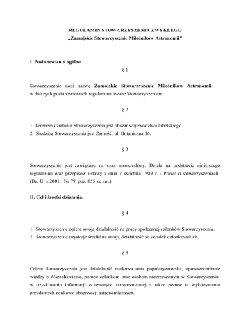 REGULAMIN STOWARZYSZENIA ZWYKŁEGO „Zamojskie Stowarzyszenie Miłośników Astronomii” I. Postanowienia ogólne. §1 Stowarzyszenie nosi nazwę Zamojskie Stowarzyszenie Miłośników Astronomii, w dalszych postanowieniach regulaminu zwane Stowarzyszeniem. §2 1. Terenem działania Stowarzyszenia jest obszar województwa lubelskiego. 2. Siedzibą Stowarzyszenia jest Zamość, ul. Botaniczna 16. §3 Stowarzyszenie jest zawiązane na czas nieokreślony. Działa na podstawie niniejszego regulaminu oraz przepisów ustawy z dnia 7 kwietnia 1989 r. - Prawo o stowarzyszeniach (Dz. U. z 2001r. Nr 79, poz. 855 ze zm.). II. Cel i środki działania. §4 1. Stowarzyszenie opiera swoją działalność na pracy społecznej członków Stowarzyszenia. 2. Stowarzyszenie uzyskuje środki na swoją działalność ze składek członkowskich. §5 Celem Stowarzyszenia jest działalność naukowa oraz popularyzatorska, upowszechnianie wiedzy o Wszechświecie, pomoc członkom oraz osobom niezrzeszonym w Stowarzyszeniu w uzyskiwaniu informacji o tematyce astronomicznej a także pomoc w wykonywaniu przydatnych naukowo obserwacji astronomicznych. §6 Stowarzyszenie realizuje swoje cele poprzez: 1. Organizowanie spotkań, prelekcji, wystaw, oraz innych imprez o tematyce astronomicznej. 2. Współpracę z placówkami naukowymi i edukacyjnymi, obserwatoriami astronomicznymi i planetariami oraz innymi instytucjami i organizacjami państwowymi i społecznymi działającymi w podobnym zakresie. 3. Organizację wyjazdów w celu przeprowadzania wartościowych naukowo eksperymentów, obserwacji i pomiarów z dziedziny astronomii. 4. Współpracę z osobami i instytucjami o podobnych celach działania. 5. Prowadzenie, wspieranie, analizowanie oraz archiwizacja badań i obserwacji astronomicznych. 6. Propagowanie idei badań kosmicznych wśród społeczności lokalnej. 7. Propagowanie osiągnięć w zakresie astronomii amatorskiej i zawodowej. 8. Pomoc przy konstruowaniu oraz zakupie sprzętu astronomicznego. 9. Inne działania, realizujące cele regulaminowe Stowarzyszenia. III. Członkostwo. §7 1. Członkiem stowarzyszenia może być osoba fizyczna, pełnoletnia posiadająca pełną zdolność do czynności prawnych i nie pozbawiona praw publicznych, będąca obywatelem polskim lub cudzoziemcem. 2. Przyjęcia nowych członków dokonuje Zebranie Członków uchwałą podjętą w ciągu 1 miesiąca od daty złożenia deklaracji. 3. W razie odmowy przyjęcia w poczet członków, zainteresowany ma prawo w terminie jednego miesiąca od daty jej doręczenia złożyć na ręce Przedstawiciela odwołanie do Zebrania Członków. Zebranie Członków rozpatruje odwołanie w czasie najbliższych obrad. Stanowisko Zebrania Członków jest ostateczne. §8 1. Członek ma prawo: a) wybierać i być wybieranym do władz Stowarzyszenia, b) uczestniczyć z głosem stanowiącym w Zebraniu Członków, c) zgłaszać wnioski i postulaty dotyczące działalności Stowarzyszenia, d) korzystać z pomocy i zaplecza Stowarzyszenia w podejmowanych działaniach, e) brać udział w pracach, zebraniach i innych przedsięwzięciach Stowarzyszenia z prawem głosu. 2. Członek obowiązany jest do: a) przestrzegania regulaminu i uchwał władz Stowarzyszenia, b) regularnego opłacania składek członkowskich, c) czynnego uczestniczenia w realizacji celów regulaminowych Stowarzyszenia, d) dbania o dobre imię i mienie Stowarzyszenia. §9 1. Członkostwo w Stowarzyszeniu ustaje na skutek: a) rezygnacji z przynależności do Stowarzyszenia, zgłoszonej na piśmie Przedstawicielowi, b) śmierci członka, c) uchwały Zebrania Członków z powodu nie płacenia składek członkowskich przez okres 1 roku, d) wykluczenia uchwałą Zebrania Członków z powodu nieprzestrzegania postanowień regulaminu i uchwał władz Stowarzyszenia lub działania na szkodę Stowarzyszenia. 2. Osoba wykluczona lub skreślona ma prawo wniesienia odwołania do Zebrania Członków w terminie 14 dni od daty doręczenia uchwały na piśmie. Zebranie Członków rozpatruje odwołanie w czasie najbliższych obrad, a jego decyzja jest ostateczna. IV. Władze Stowarzyszenia. § 10 Władzami Stowarzyszenia są: 1. Zebranie Członków. 2. Zarząd Stowarzyszenia. 3. Przedstawiciel. § 11 Uchwały Zebrania Członków Stowarzyszenia podejmowane są zwykłą większością głosów, przy obecności co najmniej połowy ogólnej liczby uprawnionych członków. § 12 1. Zebranie Członków jest najwyższą władzą Stowarzyszenia, które podejmuje decyzje we wszystkich sprawach należących do zakresu działania Stowarzyszenia, o ile regulamin nie stanowi inaczej. 2. Zebraniem Członków kieruje Przewodniczący Zebrania. 3. Zebranie Członków zwołuje Przedstawiciel lub Zarząd Stowarzyszenia. 4. Zarząd Stowarzyszenia składa się z 3 osób : Prezesa, V-ce Prezesa, Sekretarza/Skarbnika. § 13 Kadencja Przedstawiciela trwa 1 rok. Kadencja Zarządu trwa 3 lata. § 14 Do zakresu działania Zarządu i Przedstawiciela należy: 1. Realizacja uchwał Zebrania Członków, zgodnie z celami regulaminowymi oraz uchwałami Zebrania Członków. 2. Przygotowywanie planów działalności Stowarzyszenia. 3. Składanie sprawozdań ze swej działalności na Zebraniu Członków. §15 1. Przedstawicielem uprawnionym do reprezentacji Andrzej Rzemieniak. 2. Przedstawiciel reprezentuje Stowarzyszenie na zewnątrz. Stowarzyszenia jest: