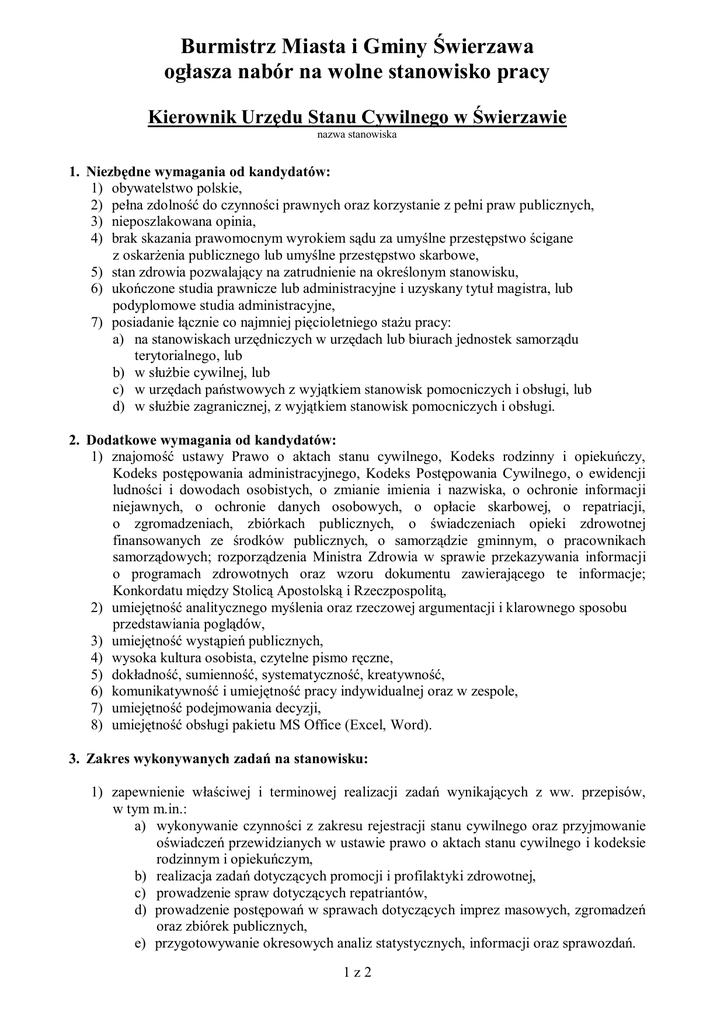 Burmistrz Miasta i Gminy Świerzawa ogłasza nabór na wolne stanowisko pracy Kierownik Urzędu Stanu Cywilnego w Świerzawie nazwa stanowiska 1. Niezbędne wymagania od kandydatów: 1) obywatelstwo polskie, 2) pełna zdolność do czynności prawnych oraz korzystanie z pełni praw publicznych, 3) nieposzlakowana opinia, 4) brak skazania prawomocnym wyrokiem sądu za umyślne przestępstwo ścigane z oskarżenia publicznego lub umyślne przestępstwo skarbowe, 5) stan zdrowia pozwalający na zatrudnienie na określonym stanowisku, 6) ukończone studia prawnicze lub administracyjne i uzyskany tytuł magistra, lub podyplomowe studia administracyjne, 7) posiadanie łącznie co najmniej pięcioletniego stażu pracy: a) na stanowiskach urzędniczych w urzędach lub biurach jednostek samorządu terytorialnego, lub b) w służbie cywilnej, lub c) w urzędach państwowych z wyjątkiem stanowisk pomocniczych i obsługi, lub d) w służbie zagranicznej, z wyjątkiem stanowisk pomocniczych i obsługi. 2. Dodatkowe wymagania od kandydatów: 1) znajomość ustawy Prawo o aktach stanu cywilnego, Kodeks rodzinny i opiekuńczy, Kodeks postępowania administracyjnego, Kodeks Postępowania Cywilnego, o ewidencji ludności i dowodach osobistych, o zmianie imienia i nazwiska, o ochronie informacji niejawnych, o ochronie danych osobowych, o opłacie skarbowej, o repatriacji, o zgromadzeniach, zbiórkach publicznych, o świadczeniach opieki zdrowotnej finansowanych ze środków publicznych, o samorządzie gminnym, o pracownikach samorządowych; rozporządzenia Ministra Zdrowia w sprawie przekazywania informacji o programach zdrowotnych oraz wzoru dokumentu zawierającego te informacje; Konkordatu między Stolicą Apostolską i Rzeczpospolitą, 2) umiejętność analitycznego myślenia oraz rzeczowej argumentacji i klarownego sposobu przedstawiania poglądów, 3) umiejętność wystąpień publicznych, 4) wysoka kultura osobista, czytelne pismo ręczne, 5) dokładność, sumienność, systematyczność, kreatywność, 6) komunikatywność i umiejętność pracy indywidualnej oraz w zespole, 7) umiejętność podejmowania decyzji, 8) umiejętność obsługi pakietu MS Office (Excel, Word). 3. Zakres wykonywanych zadań na stanowisku: 1) zapewnienie właściwej i terminowej realizacji zadań wynikających z ww. przepisów, w tym m.in.: a) wykonywanie czynności z zakresu rejestracji stanu cywilnego oraz przyjmowanie oświadczeń przewidzianych w ustawie prawo o aktach stanu cywilnego i kodeksie rodzinnym i opiekuńczym, b) realizacja zadań dotyczących promocji i profilaktyki zdrowotnej, c) prowadzenie spraw dotyczących repatriantów, d) prowadzenie postępowań w sprawach dotyczących imprez masowych, zgromadzeń oraz zbiórek publicznych, e) przygotowywanie okresowych analiz statystycznych, informacji oraz sprawozdań. 1z2 2) Zadania okresowe: a) udzielanie ślubów w święta i dni wolne od pracy w godzinach uzgadnianych z zainteresowanymi, b) pełnienie zastępstw za pracowników ds. ewidencji ludności oraz dowodów osobistych. 4. Wymagane dokumenty: 1) życiorys (CV), 2) list motywacyjny, 3) kwestionariusz osobowy- wg wzoru dostępnego na stronie internetowej Urzędu Miasta i Gminy (www.bip.swierzawa.pl) oraz w Sekretariacie Urzędu pok. Nr 10 II piętro, 4) własnoręcznie potwierdzony za zgodność z oryginałem dokument potwierdzający tożsamość, 5) własnoręcznie potwierdzone za zgodność z oryginałem kserokopie dokumentów poświadczających wykształcenie oraz staż pracy, 6) inne dodatkowe dokumenty o posiadanych kwalifikacjach i umiejętnościach, 7) oświadczenia złożone w trybie art. 233§1 Kodeksu karnego: a) o niekaralności za przestępstwa popełnione umyślnie, b) o stanie zdrowia pozwalające na zatrudnienie na ww. stanowisku, c) o pełnej zdolności do czynności prawnych oraz korzystaniu z pełni praw publicznych. Wymagane dokumenty aplikacyjne należy składać w Sekretariacie Urzędu Miasta i Gminy pok. nr 10 lub przesłać za pośrednictwem poczty na adres: Urząd Miasta i Gminy w Świerzawie, Plac Wolności 60, 59-540 Świerzawa w zamkniętej kopercie z dopiskiem: ''Nabór na stanowisko Kierownika Urzędu Stanu Cywilnego w Świerzawie'' Oferty należy składać do dnia 2 grudnia 2011r. do godz. 15.30. 5. Dodatkowe informacje: 1) dokumenty, które wpłyną do Urzędu Miasta i Gminy po wyżej określonym terminie nie będą rozpatrywane, 2) telefon kontaktowy 757134 937 wew. 22 3) informacja o wyniku naboru będzie umieszczona na stronie internetowej Urzędu Miasta i Gminy w Świerzawie www.bip.swierzawa.pl oraz na tablicy ogłoszeń w Urzędzie Miasta i Gminy w Świerzawie, Plac Wolności 60, 4) kandydaci spełniający wymogi formalne zostaną telefonicznie lub pisemnie poinformowani o terminie dalszej procedury naboru, 5) kandydaci, którzy nie zostaną zakwalifikowani, proszeni są do osobistego odbioru złożonych dokumentów aplikacyjnych pok. nr 10 w Urzędzie Miasta i Gminy w Świerzawie, 6) kandydatowi nie przysługuje roszczenie o nawiązanie stosunku pracy, 7) zastrzega się prawo unieważnienia naboru bez podania przyczyny, 8) wymagane dokumenty aplikacyjne (list motywacyjny i CV) muszą być opatrzone klauzulą: ''Wyrażam zgodę na przetwarzanie moich danych osobowych zawartych w ofercie pracy dla potrzeb niezbędnych do realizacji procesu rekrutacji zgodnie z ustawą z 29.08.1997 r. o ochronie danych osobowych (Dz. U. z 2002r. Nr 101,poz. 926 z późn. zm.) oraz ustawą z 21.11.2008 r. o pracownikach samorządowych (Dz. U. Nr 223, poz. 1458 z póż. zm.)'', 9) przed zawarciem umowy o pracę kandydat wyłoniony w drodze naboru jest zobowiązany przedłożyć pracodawcy: a) zaświadczenie z Krajowego Rejestru Karnego o braku prawomocnego skazania za przestępstwo popełnione umyślnie, b) oryginały dokumentów potwierdzających wykształcenie i posiadane kwalifikacje oraz staż pracy. Burmistrz Miasta i Gminy (-) Józef Kołcz Świerzawa, dnia 17 listopada 2011 r.
