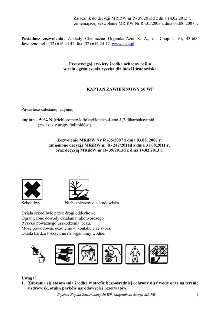 Załącznik do decyzji MRiRW nr R- 39/2013d z dnia 14.02.2013 r. zmieniającej zezwolenie MRiRW Nr R -35/2007 z dnia 03.08. 2007 r. Posiadacz zezwolenia: Zakłady Chemiczne Organika-Azot S. A., ul. Chopina 94, 43-600 Jaworzno, tel.: (32) 616 44 42, fax.(32) 616 24 17, www.azot.pl Przestrzegaj etykiety środka ochrony roślin w celu ograniczenia ryzyka dla ludzi i środowiska KAPTAN ZAWIESINOWY 50 WP Zawartość substancji czynnej: kaptan – 50% N-(trichlorometylotio)cykloheks-4-eno-1,2-dikarboksyimid (związek z grupy ftalimidów ) Zezwolenie MRiRW Nr R -35/2007 z dnia 03.08. 2007 r. zmienione decyzją MRiRW nr R- 242/2011d z dnia 31.08.2011 r. oraz decyzją MRiRW nr R- 39/2013d z dnia 14.02.2013 r. Szkodliwy Niebezpieczny dla środowiska Działa szkodliwie przez drogi oddechowe Ograniczone dowody działania rakotwórczego Ryzyko poważnego uszkodzenia oczu. Może powodować uczulenie w kontakcie ze skórą. Działa bardzo toksycznie na organizmy wodne. Uwaga! 1. Zabrania się stosowania środka w strefie bezpośredniej ochrony ujęć wody oraz na terenie uzdrowisk, otulin parków narodowych i rezerwatów. Etykieta Kaptan Zawiesinowy 50 WP, załącznik do decyzji MRiRW 1 2. Nie zanieczyszczać wód środkiem ochrony roślin lub jego opakowaniem. I OPIS DZIAŁANIA Środek grzybobójczy w formie proszku do sporządzania zawiesiny wodnej o działaniu kontaktowym do stosowania zapobiegawczego w ochronie jabłoni i gruszy przed parchem jabłoni i parchem gruszy, wiśni przed gorzką zgnilizną wiśni, fasoli szparagowej przed chorobami grzybowymi i bakteriozą obwódkową oraz roślin ozdobnych przed fuzariozą. II ZAKRES STOSOWANIA, TERMINY I DAWKI 1. ROŚLINY SADOWNICZE Środek można stosować podczas całego sezonu wegetacyjnego. JABŁOŃ, GRUSZA parch jabłoni, parch gruszy Zalecana dawka: 3kg/ha. Zalecana ilość wody: 600l/ha Środek stosować zapobiegawczo co 7 dni od fazy zielonego pąka kwiatowego do fazy gdy owoc osiąga połowę swojej wielkości. WIŚNIA gorzka zgnilizna wiśni Zalecana dawka: 3 kg/ha. Zalecana ilość wody : 500-750 l/ha Ilość cieczy roboczej dostosować do wielkości koron drzew. Środek stosować zapobiegawczo po3 tygodniach po kwitnieniu co 10 – 14 dni. 2. ROŚLINY WARZYWNE FASOLA SZPARAGOWA antraknoza fasoli, bakterioza obwódkowa fasoli, szara pleśń Zalecana dawka: 1,2 kg/ha. Zalecana ilość wody : 700 l/ha Opryskiwać 2 razy po wschodach roślin co 10 dni oraz 2 razy w okresie formowania strąków co 710 dni. 3. ROŚLINY OZDOBNE narcyz, tulipan, mieczyk (moczenie) fuzarioza Zalecane stężenie: 0,5 - 1% (500-1000 g środka w 100 litrach wody). Przed sadzeniem moczyć cebule przez 30 minut w cieczy użytkowej. III OKRES KARENCJI Etykieta Kaptan Zawiesinowy 50 WP, załącznik do decyzji MRiRW 2 okres od dnia ostatniego zabiegu do dnia zbioru roślin przeznaczonych do konsumpcji JABŁKA, GRUSZKI, WIŚNIE, FASOLA SZPARAGOWA - 7 DNI. ROŚLINY OZDOBNE – NIE DOTYCZY IV OKRES PREWENCJI DLA LUDZI I ZWIERZĄT okres zapobiegający zatruciu NIE DOTYCZY V SPORZĄDZANIE CIECZY UŻYTKOWEJ Przed przystąpieniem do sporządzania cieczy użytkowej dokładnie ustalić potrzebną jej ilość. Odważoną ilość środka wymieszać w osobnym naczyniu z małą ilością wody, następnie wlać przez sito do zbiornika opryskiwacza napełnionego częściowo wodą (z włączonym mieszadłem) i uzupełnić wodą do potrzebnej ilości. Po wlaniu środka do zbiornika opryskiwacza nie wyposażonego w mieszadło hydrauliczne ciecz mechanicznie wymieszać. Opróżnione opakowania przepłukać trzykrotnie wodą, a popłuczyny wlać do zbiornika z cieczą użytkową. Opryskiwać z włączonym mieszadłem. Po pracy aparaturę dokładnie wymyć. VI PRZECHOWYWANIE Przechowywać wyłącznie w oryginalnym opakowaniu w temperaturze nie niższej niż 0 0C i nie wyższej niż 300C. Chronić przed dziećmi. Nie przechowywać razem z żywnością, napojami i paszami dla zwierząt. VII WARUNKI BEZPIECZNEGO STOSOWANIA ŚRODKA Nie jeść i nie pić oraz nie palić tytoniu podczas stosowania produktu. Nie wdychać rozpylonej cieczy. Unikać zanieczyszczenia skóry i oczu. Natychmiast zdjąć całą zanieczyszczoną odzież. Nosić odpowiednią odzież ochronną, odpowiednie rękawice ochronne i okulary lub ochronę twarzy. W razie połknięcia niezwłocznie zasięgnij porady lekarza - pokaż opakowanie lub etykietę. Produkt i opakowanie usuwać jako odpad niebezpieczny. Opróżnione opakowania po środku zwrócić do sprzedawcy, u którego środek został zakupiony. Używać odpowiednich pojemników zapobiegających skażeniu środowiska. Zabrania się spalania opakowań po środku ochrony roślin we własnym zakresie. Etykieta Kaptan Zawiesinowy 50 WP, załącznik do decyzji MRiRW 3 Resztki cieczy użytkowej rozcieńczyć wodą i wypryskać na powierzchni poprzednio opryskiwanej. Wodę użytą do mycia aparatury wypryskać na powierzchni poprzednio opryskiwanej, stosując te same środki ochrony osobistej. UWAGA! ZABRANIA SIĘ WYKORZYSTYWANIA ŚRODKACH OCHRONY ROŚLIN DO OPRÓŻNIONYCH INNYCH CELÓW, OPAKOWAŃ W TYM PO TAKŻE TRAKTOWANIA ICH JAKO SUROWCE WTÓRNE. VIII ANTIDOTUM BRAK, STOSOWAĆ LECZENIE OBJAWOWE. IX POMOC MEDYCZNA W zaistniałych sytuacjach, kiedy wymagana jest lub konieczna inna pomoc medyczna niż ujęta w wyżej wymienionych ostrzeżeniach skontaktować się z najbliższym Ośrodkiem Toksykologicznym: Gdańsk – (58) 682 Kraków - (12) 411 Lublin – (81) 740 Łódź – (42) 657 Poznań – (61) 847 04 99 26 99 69 04 99 76 00 46 Rzeszów – (17) 866 44 09 Sosnowiec – (32) 266 11 45 Warszawa – (22) 619 08 97 Wrocław – (71) 343 30 08 Tarnów – (14) 631 54 09 Okres ważności - 3 lata Data produkcji -..................... Zawartość netto -....................... Nr partii -...................... Etykieta Kaptan Zawiesinowy 50 WP, załącznik do decyzji MRiRW 4