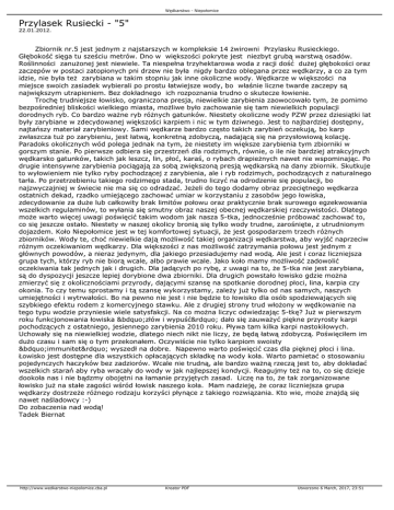 Wędkarstwo - Niepołomice Przylasek Rusiecki - "5" 22.01.2012. Zbiornik nr.5 jest jednym z najstarszych w kompleksie 14 żwirowni Przylasku Rusieckiego. Głębokość sięga tu sześciu metrów. Dno w większości pokryte jest niezbyt grubą warstwą osadów. Roślinności zanużonej jest niewiele. Ta niespełna trzyhektarowa woda z racji dość dużej głębokości oraz zaczepów w postaci zatopionych pni drzew nie była nigdy bardzo oblegana przez wędkarzy, a co za tym idzie, nie była też zarybiana w takim stopniu jak inne okoliczne wody. Wędkarze w większości na miejsce swoich zasiadek wybierali po prostu łatwiejsze wody, bo właśnie liczne twarde zaczepy są największym utrapieniem. Bez dokładnego ich rozpoznania trudno o skutecze łowienie. Trochę trudniejsze łowisko, ograniczona presja, niewielkie zarybienia zaowocowało tym, że pomimo bezpośredniej bliskości wielkiego miasta, możliwe było zachowanie się tam niewielkich populacji dorodnych ryb. Co bardzo ważne ryb różnych gatunków. Niestety okoliczne wody PZW przez dziesiątki lat były zarybiane w zdecydowanej większości karpiem i nic w tym dziwnego. Jest to najbardziej dostępny, najtańszy materiał zarybieniowy. Sami wędkarze bardzo często takich zarybień oczekują, bo karp zwłaszcza tuż po zarybieniu, jest łatwą, konkretną zdobyczą, nadającą się na przysłowiową kolację. Paradoks okolicznych wód polega jednak na tym, że niestety im większe zarybienia tym zbiorniki w gorszym stanie. Po pierwsze odbiera się przestrzeń dla rodzimych, równie, o ile nie bardziej atrakcyjnych wędkarsko gatunków, takich jak leszcz, lin, płoć, karaś, o rybach drapieżnych nawet nie wspominając. Po drugie intensywne zarybienia pociągają za sobą zwiększoną presją wędkarską na dany zbiornik. Skutkuje to wyłowieniem nie tylko ryby pochodzącej z zarybienia, ale i ryb rodzimych, pochodzących z naturalnego tarła. Po przetrzebieniu takiego rodzimego stada, trudno liczyć na odrodzenie się populacji, bo najzwyczajniej w świecie nie ma się co odradzać. Jeżeli do tego dodamy obraz przeciętnego wędkarza ostatnich dekad, rzadko umiejącego zachować umiar w korzystaniu z zasobów jego łowiska, zdecydowanie za duże lub całkowity brak limitów połowu oraz praktycznie brak surowego egzekwowania wszelkich regulaminów, to wyłania się smutny obraz naszej obecnej wędkarskiej rzeczywistości. Dlatego może warto więcej uwagi poświęcić takim wodom jak nasza 5-tka, jednocześnie próbować zachować to, co się jeszcze ostało. Niestety w naszej okolicy bronią się tylko wody trudne, zarośnięte, z utrudnionym dojazdem. Koło Niepołomice jest w tej komfortowej sytuacji, że jest gospodarzem trzech różnych zbiorników. Wody te, choć niewielkie dają możliwość takiej organizacji wędkarstwa, aby wyjść naprzeciw różnym oczekiwaniom wędkarzy. Dla większości z nas możliwość zatrzymania połowu jest jednym z głównych powodów, a nieraz jedynym, dla jakiego przesiadujemy nad wodą. Ale jest i coraz liczniejsza grupa tych, którzy ryb nie biorą wcale, albo prawie wcale. Jako koło mamy możliwość zadowolić oczekiwania tak jednych jak i drugich. Dla jadących po rybę, z uwagi na to, że 5-tka nie jest zarybiana, są do dyspozycji jeszcze lepiej dorybione dwa zbiorniki. Dla drugich powstało łowisko gdzie można zmierzyć się z okolicznościami przyrody, dającymi szansę na spotkanie dorodnej płoci, lina, karpia czy okonia. To czy temu sprostamy i tą szansę wykorzystamy, zależy już tylko od nas samych, naszych umiejętności i wytrwałości. Bo na pewno nie jest i nie będzie to łowisko dla osób spodziewających się szybkiego efektu rodem z komercyjnego stawku. Ale z drugiej strony trud włożony w wędkowanie na tego typu wodzie przyniesie wiele satysfakcji. Na co można liczyc odwiedzając 5-tkę? Już w pierwszym roku funkcjonowania łowiska „złów i wypuść” dało się zauważyć piękne przyrosty karpi pochodzących z ostatniego, jesiennego zarybienia 2010 roku. Pływa tam kilka karpi nastokilowych. Uchowały się na niewielkiej wodzie, dlatego niech nikt nie liczy, że będą łatwą zdobyczą. Poświęciłem im dużo czasu i sam się o tym przekonałem. Oczywiście nie tylko karpiom swoisty „immunitet” wyszedł na dobre. Napewno warto poświęcić czas dla pięknej płoci i lina. Łowisko jest dostępne dla wszystkich opłacających składkę na wody koła. Warto pamietać o stosowaniu pojedynczych haczyków bez zadziorów. Wcale nie trudną, ale bardzo ważną rzeczą jest to, aby dokładać wszelkich starań aby ryba wracały do wody w jak najlepszej kondycji. Reagujmy też na to, co się dzieje dookoła nas i nie bądzmy obojętni na łamanie przyjętych zasad. Liczę na to, że tak zorganizowane łowisko już na stałe zagości wśród łowisk naszego koła. Mam nadzieję, że coraz liczniejsza grupa wędkarzy dostrzeże różnego rodzaju korzyści płynące z takiego rozwiązania. Kto wie, może znajdą się nawet naśladowcy :-) Do zobaczenia nad wodą! Tadek Biernat http://www.wedkarstwo-niepolomice.cba.pl Kreator PDF Utworzono 6 March, 2017, 23:51