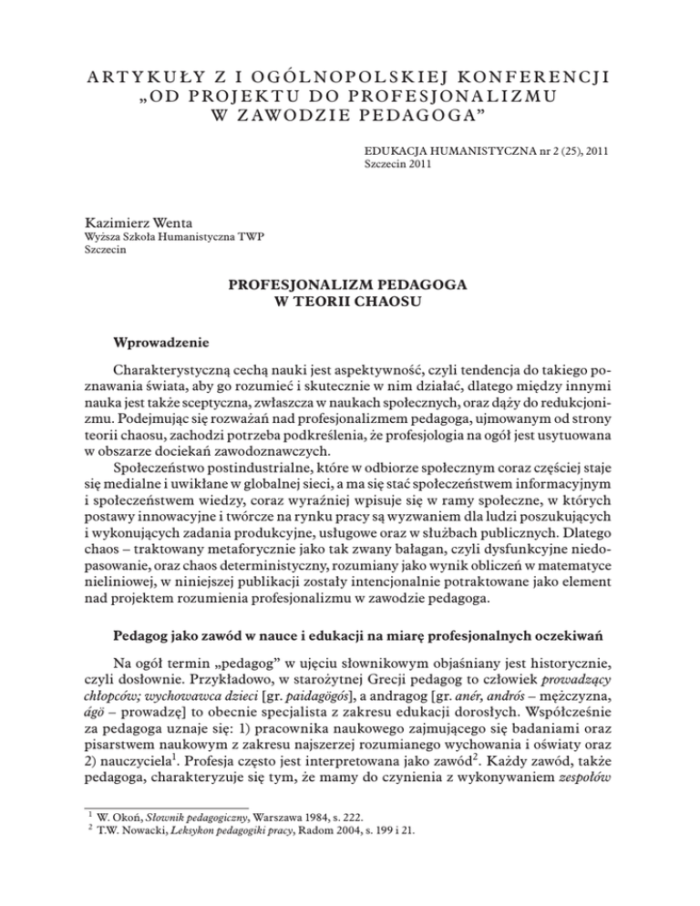 Art y k u ły z I O g ó l n o p o l s k i e j Ko n fere n c j i „ O d pr o j e k t u d o pr o fes j o n a l i z m u w z aw o d z i e pe dag o g a” Edukacja Humanistyczna nr 2 (25), 2011 Szczecin 2011 Kazimierz Wenta Wyższa Szkoła Humanistyczna TWP Szczecin PROFESJONALIZM PEDAGOGA W TEORII CHAOSU Wprowadzenie Charakterystyczną cechą nauki jest aspektywność, czyli tendencja do takiego poznawania świata, aby go rozumieć i skutecznie w nim działać, dlatego między innymi nauka jest także sceptyczna, zwłaszcza w naukach społecznych, oraz dąży do redukcjonizmu. Podejmując się rozważań nad profesjonalizmem pedagoga, ujmowanym od strony teorii chaosu, zachodzi potrzeba podkreślenia, że profesjologia na ogół jest usytuowana w obszarze dociekań zawodoznawczych. Społeczeństwo postindustrialne, które w odbiorze społecznym coraz częściej staje się medialne i uwikłane w globalnej sieci, a ma się stać społeczeństwem informacyjnym i społeczeństwem wiedzy, coraz wyraźniej wpisuje się w ramy społeczne, w których postawy innowacyjne i twórcze na rynku pracy są wyzwaniem dla ludzi poszukujących i wykonujących zadania produkcyjne, usługowe oraz w służbach publicznych. Dlatego chaos – traktowany metaforycznie jako tak zwany bałagan, czyli dysfunkcyjne niedopasowanie, oraz chaos deterministyczny, rozumiany jako wynik obliczeń w matematyce nieliniowej, w niniejszej publikacji zostały intencjonalnie potraktowane jako element nad projektem rozumienia profesjonalizmu w zawodzie pedagoga. Pedagog jako zawód w nauce i edukacji na miarę profesjonalnych oczekiwań Na ogół termin „pedagog” w ujęciu słownikowym objaśniany jest historycznie, czyli dosłownie. Przykładowo, w starożytnej Grecji pedagog to człowiek prowadzący chłopców; wychowawca dzieci [gr. paidagögós], a andragog [gr. anér, andrós – mężczyzna, ágö – prowadzę] to obecnie specjalista z zakresu edukacji dorosłych. Współcześnie za pedagoga uznaje się: 1) pracownika naukowego zajmującego się badaniami oraz pisarstwem naukowym z zakresu najszerzej rozumianego wychowania i oświaty oraz 2) nauczyciela1. Profesja często jest interpretowana jako zawód2. Każdy zawód, także pedagoga, charakteryzuje się tym, że mamy do czynienia z wykonywaniem zespołów 1 2 W. Okoń, Słownik pedagogiczny, Warszawa 1984, s. 222. T.W. Nowacki, Leksykon pedagogiki pracy, Radom 2004, s. 199 i 21. 158 Kazimierz Wenta czynności społecznie użytecznych, wyodrębnionych na skutek podziału pracy, wymagających od pracownika odpowiedniej wiedzy i umiejętności, a także cech psychofizycznych, warunkujących wykonanie zadań zawodowych powtarzanych systematycznie i będących źródłem utrzymania pracownika i jego rodziny. Zawód jest podstawą prestiżu i pozycji społecznej pracownika. Społeczne konsekwencje wykonywania zawodu to możliwość zrzeszania się jego przedstawicieli, pielęgnowania tradycji zawodu, prezentacji określonych postaw i ocen społecznych podejmowanych z pozycji danego zawodu3. Profesja, z kolei, jest odczytywana z punktu widzenia dużej fachowości, to znaczy zawodowych umiejętności ujawniających się w postaci jakości wykonywania trudnych zadań oraz ich wysokiego poziomu realizacji, co świadczy o dużych kompetencjach pracownika4. Można więc stwierdzić, że profesja pedagoga jest rozumiana jako zawód wymagający specjalistycznego przygotowania na poziomie wyższym wraz z dodatkowymi uprawnieniami, ponieważ jest to kwalifikowana praca wykonywana z dużą wprawą, między innymi ze względu na własne i uznane przez innych standardy (kryteria) przypisane dla danego stanowiska w nauce, edukacji. Wśród pedagogów ujawniają się takie ogólne profesjonalne kompetencje pedagogiczne, jak: 1) prakseologiczne, 2) komunikacyjne, 3) współdziałania, 4) kreatywne, 5) informatyczne, 6) moralne5. Jeżeli profesjonalizacja w zawodzie jest kapitałem ludzkim oraz kapitałem symbolicznym na rynku pracy, to warto zauważyć, że chodzi tutaj o: 1) proces polegający na powiększaniu się liczby osób wykonujących pracę uznawaną za działalność typową do zawodu; 2) dążenia grupy zawodowej do osiągnięcia cech charakteryzujących tak zwaną pełną profesję, co wiąże się z podwyższeniem pozycji zawodu; 3) przyznawanie osobie uprawnień związanych z wykonywaniem określonego typu „profesji”. Profesjonalizm może być wówczas traktowany jako proces towarzyszący przemianom społecznym, będący efektem upowszechniania się pracy najemnej, w przypadku pedagogów – pracy intelektualnie poznawczej na niwie nauki oraz usługowej i publiczno-funkcjonalnej w edukacji, a polegającej na przekazywaniu w ręce specjalistów coraz większego obszaru praktyki społecznej. Dlatego wśród cech profesjonalizmu na gruncie anglo-amerykańskim wymienia się: a) posiadanie specjalistycznego wykształcenia opartego na wiedzy naukowej; b) podporządkowanie się określonym normom etycznym i regułom postępowania (kodeks etyczny); c) służenie dobru wspólnemu (na przykład w profesji pedagoga – działania podejmowane na rzecz zdrowia i rozwoju, wychowanie i nauczanie na rzecz społecznie aprobowanego sukcesu); d) posiadanie autonomii w wykonywaniu zawodu; e) istnienie samorządowych organizacji zawodowych służących ochronie interesów profesji6. Na ogół o profesjonalistach pisze się, że mają wiedzę fachową, ale często stają w obliczu wyjątkowych, trudnych sytuacji, które nie poddają się schematycznym rozwiązaniom. Profesjonaliści muszą rozwijać zdolności radzenia sobie z niespodziewanymi okolicznościami i działać mądrze w sytuacji niejasnej7. Wykonanie pracy, nawet dobrze, jest czymś wystarczającym dla nieprofesjonalistów, ale cechą profesjonalistów jest stałe poprawianie 3 Tamże, s. 287. K. Olechnicki, P. Załęcki, Słownik socjologiczny, Toruń 2000, s. 164. 5 K. Denek, Kompetencje nauczycieli w kontekście do wyzwań XXI 