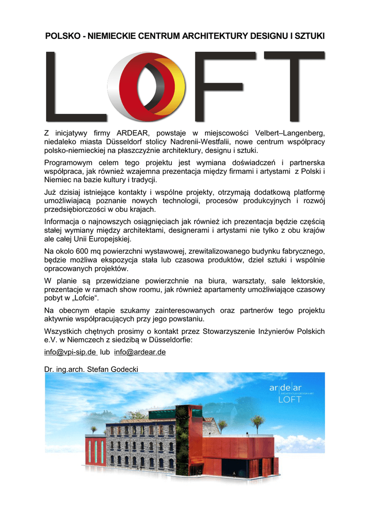 POLSKO - NIEMIECKIE CENTRUM ARCHITEKTURY DESIGNU I SZTUKI Z inicjatywy firmy ARDEAR, powstaje w miejscowości Velbert–Langenberg, niedaleko miasta Düsseldorf stolicy Nadrenii-Westfalii, nowe centrum współpracy polsko-niemieckiej na płaszczyźnie architektury, designu i sztuki. Programowym celem tego projektu jest wymiana doświadczeń i partnerska współpraca, jak również wzajemna prezentacja między firmami i artystami z Polski i Niemiec na bazie kultury i tradycji. Już dzisiaj istniejące kontakty i wspólne projekty, otrzymają dodatkową platformę umożliwiajacą poznanie nowych technologii, procesów produkcyjnych i rozwój przedsiębiorczości w obu krajach. Informacja o najnowszych osiągnięciach jak również ich prezentacja będzie częścią stałej wymiany między architektami, designerami i artystami nie tylko z obu krajów ale całej Unii Europejskiej. Na okolo 600 mq powierzchni wystawowej, zrewitalizowanego budynku fabrycznego, będzie możliwa ekspozycja stała lub czasowa produktów, dzieł sztuki i wspólnie opracowanych projektów. W planie są przewidziane powierzchnie na biura, warsztaty, sale lektorskie, prezentacje w ramach show roomu, jak również apartamenty umożliwiające czasowy pobyt w „Lofcie“. Na obecnym etapie szukamy zainteresowanych oraz partnerów tego projektu aktywnie współpracujących przy jego powstaniu. Wszystkich chętnych prosimy o kontakt przez Stowarzyszenie Inżynierów Polskich e.V. w Niemczech z siedzibą w Düsseldorfie: [email protected] lub [email protected] Dr. ing.arch. Stefan Godecki