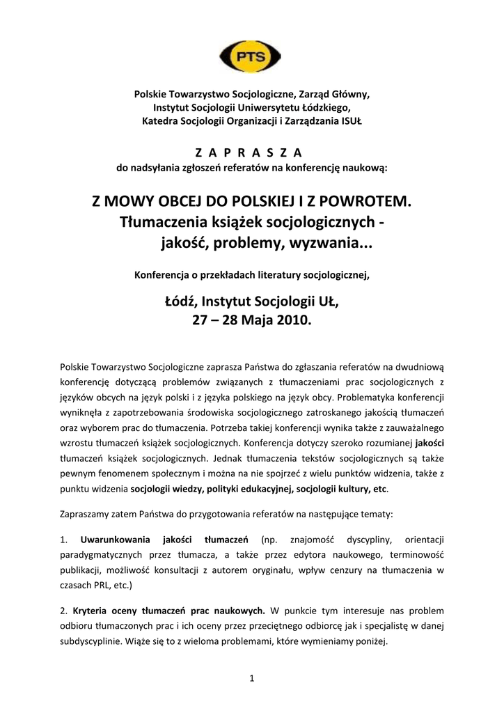 Polskie Towarzystwo Socjologiczne, Zarząd Główny, Instytut Socjologii Uniwersytetu Łódzkiego, Katedra Socjologii Organizacji i Zarządzania ISUŁ Z A P R A S Z A do nadsyłania zgłoszeń referatów na konferencję naukową: Z MOWY OBCEJ DO POLSKIEJ I Z POWROTEM. Tłumaczenia książek socjologicznych jakość, problemy, wyzwania... Konferencja o przekładach literatury socjologicznej, Łódź, Instytut Socjologii UŁ, 27 – 28 Maja 2010. Polskie Towarzystwo Socjologiczne zaprasza Państwa do zgłaszania referatów na dwudniową konferencję dotyczącą problemów związanych z tłumaczeniami prac socjologicznych z języków obcych na język polski i z języka polskiego na język obcy. Problematyka konferencji wyniknęła z zapotrzebowania środowiska socjologicznego zatroskanego jakością tłumaczeń oraz wyborem prac do tłumaczenia. Potrzeba takiej konferencji wynika także z zauważalnego wzrostu tłumaczeń książek socjologicznych. Konferencja dotyczy szeroko rozumianej jakości tłumaczeń książek socjologicznych. Jednak tłumaczenia tekstów socjologicznych są także pewnym fenomenem społecznym i można na nie spojrzeć z wielu punktów widzenia, także z punktu widzenia socjologii wiedzy, polityki edukacyjnej, socjologii kultury, etc. Zapraszamy zatem Państwa do przygotowania referatów na następujące tematy: 1. Uwarunkowania jakości tłumaczeń (np. znajomość dyscypliny, orientacji paradygmatycznych przez tłumacza, a także przez edytora naukowego, terminowość publikacji, możliwość konsultacji z autorem oryginału, wpływ cenzury na tłumaczenia w czasach PRL, etc.) 2. Kryteria oceny tłumaczeń prac naukowych. W punkcie tym interesuje nas problem odbioru tłumaczonych prac i ich oceny przez przeciętnego odbiorcę jak i specjalistę w danej subdyscyplinie. Wiąże się to z wieloma problemami, które wymieniamy poniżej. 1 Jak recenzować tłumaczenia? Kto może recenzować kompetentnie tłumaczenia, czy tłumaczenia mają być wierne pod względem treści, czy też znaczeń? Czy pojęcia mają być dosłownie tłumaczone, czy też przez omówienia/inne terminy? Czy tłumacz może stworzyć nowy język, czy też powinien odwoływać się do terminów już funkcjonujących w danym języku? Kto ma oceniać tłumaczenia? Czy jest jakieś gremium, które może powiedzieć „to tłumaczenie jest poprawne”? Czy też mamy do czynienia z pewną elastycznością ocen i „polifonią” języków (słowników i znaczeń) tłumaczeń? 3. Co tłumaczyć? Problem wyboru tekstów do tłumaczeń. Kto, w jaki sposób wybiera i decyduje o tłumaczeniu książek. Problem polityki wydawniczej i naukowej; koordynacja interesów wydawców i interesu nauki, sponsorów, etc. Problem władzy w nauce i polityce tłumaczeniowej; wykluczenie „niepożądanych paradygmatów” i orientacji; problem dominujących dyskursów naukowych; problem wznowień i powtórnych tłumaczeń prac opublikowanych między innymi w czasach PRL-u, itp. 4. Tłumaczenie tekstów naukowych z perspektywy profesjonalistów - tłumaczy. Główne problemy związane z tłumaczeniem prac teoretycznych, a także badawczych z punktu widzenia profesjonalnych tłumaczy (filologów). Problem znajomości języka technicznego danej dyscypliny szczegółowej; problemy różnic kulturowych i rozumienia terminów w różnych społeczeństwach i kulturach, itp. 5. Tłumaczenie tekstów z perspektywy profesjonalistów – edytorów naukowych. Główne problemy związane z korektą naukową przetłumaczonych tekstów; problem koordynacji i współpracy specjalisty z tłumaczem i wydawcą, itp. 6. Tłumaczenie tekstów z perspektywy profesjonalistów – wydawców. Problematyka wyboru tekstów i pogodzenia wymogów rynkowych z zapotrzebowaniem nauki na określone teksty. Problem finansowania tłumaczeń. Koordynacja działań z tłumaczami, edytorami naukowymi, itp. Na konferencji oprócz prezentacji referatów przewidujemy panele dyskusyjne, gdzie będą dyskutowali reprezentanci różnych stanowisk i stron w przedsięwzięciach publikacyjnych. Ponadto zostanie wręczona nagroda PTS dla tłumacza za najlepsze tłumaczenie książki lub artykułu (cyklu artykułów) socjologicznego w danym roku. Przewidujemy także publikację pokonferencyjną wybranych prac w Przeglądzie Socjologii Jakościowej (www.qualitativesociologyreview.org). Wszelkie bieżące informacje dotyczące konferencji będą ukazywały się na stronie: www.soc-org.edu.pl w dziale: Wydarzenia, zakładka: Konferencje. 2 Zgłoszenia uczestnictwa w konferencji (na karcie umieszczonej na stronie) prosimy nadsyłać do 31 stycznia 2010, na adres: Katedra Socjologii Organizacji i Zarządzania Instytut Socjologii UŁ, ul Rewolucji 1905r., 41/43, 90-214 Łódź, lub emailowo na adres: [email protected]; [email protected] Opłata konferencyjna: 150 zł (nie przewidujemy opłaty ulgowej) Opłata odejmuje uczestnictwo w konferencji, materiały konferencyjne oraz przerwy kawowe. Ostateczny termin wpłacenia opłaty konferencyjnej: 31 stycznia 2010 Konto: Uniwersytet Łódzki ul. Narutowicza 65, 90-131 Łódź NIP: 724-000-32-43 REGON: 000001287 Tytuł: Z mowy obcej do polskiej i z powrotem- nazwisko uczestnika Numer konta: PKO S.A. II/O Lodz 07 1240 3028 1111 0010 2943 4436 SWIFT: PKOPPLPW 3