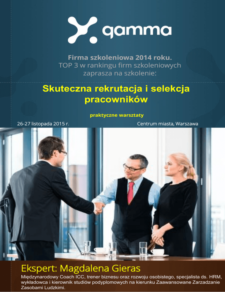 Firma szkoleniowa 2014 roku. TOP 3 w rankingu firm szkoleniowych zaprasza na szkolenie: Skuteczna rekrutacja i selekcja pracowników praktyczne warsztaty 26-27 listopada 2015 r. Centrum miasta, Warszawa Ekspert: Magdalena Gieras Międzynarodowy Coach ICC, trener biznesu oraz rozwoju osobistego, specjalista ds. HRM, wykładowca i kierownik studiów podyplomowych na kierunku Zaawansowane Zarzadzanie Zasobami Ludzkimi. Skuteczna rekrutacja i selekcja pracowników 26-27 listopada 2015 r. Centrum miasta, Warszawa Ludzie są głównym składnikiem każdej organizacji. Dlatego też pozyskiwanie i zatrudnianie właściwych osób oraz zachęcania ich do efektywnej pracy jest kluczem do sukcesu każdego zakładu pracy. Pozyskiwanie (nabór) personelu odbywa się w procesie rekrutacji i selekcji pracowników, który stanowi - obok planowania zasobów ludzkich - jeden z pierwszych i najważniejszych obszarów zadaniowych polityki personalnej w przedsiębiorstwie. Realizacja tych początkowych zadań decyduje w dużym stopniu o wykonaniu pozostałych celów cząstkowych, a w konsekwencji - celu nadrzędnego, jakim jest efektywne pozyskiwanie i spożytkowanie zasobów ludzkich. Na warsztaty zapraszamy: Szkolenie skierowane do pracowników działów personalnych oraz osób związanych z rekrutacją i selekcją nowych pracowników. 2 www.szkoleniaeksperckie.pl, 01-612 Warszawa, ul. Mysłowicka 15 Justyna Baryła-Rychert tel.: 22/266 08 48, [email protected] Skuteczna rekrutacja i selekcja pracowników 26-27 listopada 2015 r. Centrum miasta, Warszawa Uczestnicy dowiedzą się : •Jak przygotować opis stanowiska pracy i utwierdzić się w przekonaniu, że zatrudnienie nowej osoby to najlepsze rozwiązanie? •Jak opracować profil osobowy kandydata nie popełniając przy tym błędów wynikających z kontaktów z osobami zajmującymi już takie stanowisko? •Jak przyciągnąć najlepszych kandydatów, stosując różne metody i uniknąć posądzenia o dyskryminację ze względu np. na wiek? •Jak ocenić podania kandydatów i prześledzić tok rozumowania menedżerów podejmujących decyzje na tym etapie procesu? •Jak sprawnie przeprowadzić selekcję wykorzystując i efektywnie najczęściej stosowane narzędzia? •Jak uniknąć psychologicznych pułapek związanych z wpływem procesu selekcji na kandydatów? •Jak wprowadzić pracownika do organizacji? •Jak ocenić przeprowadzoną rekrutację i selekcję i zaprojektować konieczne zmiany? Po szkoleniu uczestnicy będą wiedzieć jak: •płynnie poruszać się po zagadnieniach procesu doboru kadr •wybrać najefektywniejsze źródła rekrutacji •tworzyć profil stanowiska •zaprojektować ogłoszenie •przeprowadzić selekcję kandydatów Na warsztaty zapraszamy: Szkolenie skierowane do pracowników działów personalnych oraz osób związanych z rekrutacją i selekcją nowych pracowników. 2 www.szkoleniaeksperckie.pl, 01-612 Warszawa, ul. Mysłowicka 15 Justyna Baryła-Rychert tel.: 22/266 08 48, [email protected] Skuteczna rekrutacja i selekcja pracowników 26-27 listopada 2015 r. Centrum miasta, Warszawa PROGRAM SZKOLENIA: 26-27 listopada 9.00 – 16.00 Pracownik potrzebny od zaraz, czyli od czego rozpocząć dobór pracowników? • • • • • • Rozwój i znaczenie funkcji personalnej Cele i znaczenie doboru kadr Schemat przebiegu procesu doboru Diagnoza potrzeb personalnych Dobór pracowników - istota oraz elementy składowe Kompetencje osoby rekrutującej – model kompetencyjny Projektowanie profilu kompetencyjnego kandydata na bazie analizy pracy • Zakres informacyjny opisu stanowiska pracy • Opis stanowiska pracy odwołujący się do kompetencji • Zasady tworzenia profilu kandydata, w tym: model kompetencyjny - metodologia projektowania Pozyskiwanie kandydatów • Formy rekrutacji – zewnętrzna, wewnętrzna, zalety, wady • Determinanty wyboru źródła pozyskiwania kandydatów • Znaczenie rekrutacji wewnętrznej – powiązanie z programem rozwoju rezerwy kadrowej, sukcesji stanowiskowej, przeniesienia, wpływ wyników systemu ocen • Zewnętrzna rekrutacja – konieczność dopływu pracowników spoza organizacji • Formy doboru zewnętrznego • Efektywność poszczególnych źródeł rekrutacji: nakłady, czas i skuteczność dopasowania kandydata do stanowiska Pogłębiona informacja o wybranych formach rekrutacji zewnętrznej • • • • Ogłoszenia prasowe: Sposób konstruowania ogłoszenia Efektywność rekrutacji Agencje doradztwa personalnego – zasady współpracy Head hunting Selekcja kandydatów • Jak selekcjonować CV - analiza życiorysów, listów motywacyjnych • Ocena motywacji kandydata • Testowanie kandydatów – wady i zalety testów psychologicznych, testy dostępne na polskim rynku ich zakres informacyjny i sposób wykorzystania • Wykorzystanie referencji - sprawdzanie przeszłości kandydata do pracy • Long list, short list • Wywiad telefoniczny 4 www.szkoleniaeksperckie.pl, 01-612 Warszawa, ul. Mysłowicka 15 Justyna Baryła-Rychert tel.: 22/266 08 48, [email protected] Skuteczna rekrutacja i selekcja pracowników 26-27 listopada 2015 r. Centrum miasta, Warszawa • Psychologiczne pułapki w percepcji i ocenie kandydatów • Dobór metod selekcyjnych • Model Williama Marstona • Metoda DISC i THOMAS bazująca na modelu Marstona • Metody i strategie selekcji: pozytywna, negatywna, play off, kompensacyjna, metoda lejka • Niekonwencjonalne metody selekcji kandydatów • Najczęściej popełniane błędy Rozmowa kwalifikacyjna jako jedna z metod selekcji • Rozmowa kwalifikacyjna, zasady i techniki przeprowadzania rozmów – budowanie listy pytań, – ocena kompetencji, – kwestionariusze rozmów, – aktywne słuchanie, – metoda STAR • Przygotowanie pracodawcy do rozmowy kwalifikacyjnej • Przebieg rozmowy • Na co zwracać uwagę podczas rozmowy • Zachowanie się kandydata na rozmowie kwalifikacyjnej • Różni kandydaci – różne techniki prow