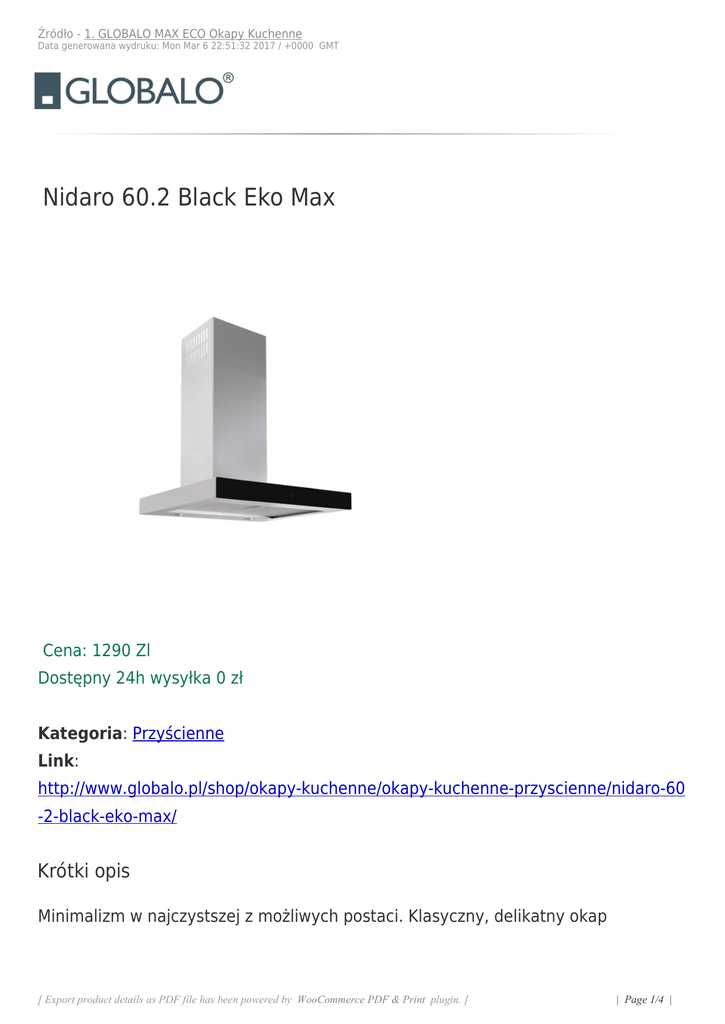 Źródło - 1. GLOBALO MAX ECO Okapy Kuchenne Data generowana wydruku: Mon Mar 6 22:51:32 2017 / +0000 GMT Nidaro 60.2 Black Eko Max Cena: 1290 Zl Dostępny 24h wysyłka 0 zł Kategoria: Przyścienne Link: http://www.globalo.pl/shop/okapy-kuchenne/okapy-kuchenne-przyscienne/nidaro-60 -2-black-eko-max/ Krótki opis Minimalizm w najczystszej z możliwych postaci. Klasyczny, delikatny okap [ Export product details as PDF file has been powered by WooCommerce PDF & Print plugin. ] | Page 1/4 | Źródło - 1. GLOBALO MAX ECO Okapy Kuchenne Data generowana wydruku: Mon Mar 6 22:51:32 2017 / +0000 GMT przyścienny Nidaro 60.2 Black Eko Max w pełni zadowoli klientów ceniących sobie proste i nienachalne formy. Maksymalna wydajność: 735 m3/h - Dotykowe sterowanie - Oświetlenie POWER LED Okap kuchenny Nidaro 60.2 Black Eko Max | Zalety i korzyści dla użytkownika Funkcjonalności: Okap kominowy Nidaro 60.2 działać może w trybie pochłaniacza (wtedy filtruje powietrze i oczyszcza je z toksyn i zapachów), a po podłączeniu do kanału wentylacyjnego – także w trybie wyciągu (który odprowadza opary na zewnątrz budynku). Wzmacniany, wielowarstwowy filtr aluminiowy sprawi, że sprzęty i szafki w Twojej kuchni wolne będą od tłustej warstwy, natomiast opcjonalny filtr węglowy (potrzebny w trybie pochłaniacza) neutralizuje aromaty gotowania i usuwa szkodliwe substancje. Oświetlenie POWER LED daje miłe, jasne światło – niezbędne podczas wieczornych prac w kuchni. Łatwość obsługi gwarantuje intuicyjny panel dotykowy ze wskaźnikiem LED. 3 stopnie prędkości i funkcja boost umożliwiają takie ustawienie okapu, aby jego wydajność była dostosowana do intensywności gotowania. Okap kuchenny Nidaro został również wyposażony w wyłącznik czasowy (timer można ustawić w zakresie 10-90 min). Przeznaczenie: Standardowa forma okapu kuchennego Nidaro 60.2 Black Eko Max sprawia, że jest on wybierany zarówno do tradycyjnych, jak i tych bardziej nowoczesnych kuchni. Materiały: Czarne hartowane szkło i stal nierdzewna Inox w kolorze naturalnym tworzą razem nowocześnie prezentujący się duet. Dobrze wiedzieć! Okap kominowy Nidaro jest prosty i gładki, dlatego łatwo go wyczyścić miękką ściereczką. [vc_column][vc_button title="Jaki wybrać okap?" custom_color="#58ccef" custom_icon="fa-question" custom_pos="left" href="/wybor-najlepszego-okapu-kuchennego/"][vc_button title="Pomaluj okap" [ Export product details as PDF file has been powered by WooCommerce PDF & Print plugin. ] | Page 2/4 | Źródło - 1. GLOBALO MAX ECO Okapy Kuchenne Data generowana wydruku: Mon Mar 6 22:51:32 2017 / +0000 GMT custom_color="#58ccef" custom_icon="fa-magic" custom_pos="left" href="/kolorowe-okapy/"][vc_button title="Stwórz własny okap" custom_color="#58ccef" custom_icon="fa-star" custom_pos="left" href="/stworz-wlasny-okap/"][vc_button title="Punkty sprzedaży" custom_color="#58ccef" custom_icon="fa-globe" custom_pos="left" href="/punkty-sprzedazy/"] Specyfikacja produktu: - Wymiary: 70 x 50 x 60 cm - Waga: 17 kg - Waga okapu: 13 kg - Szerokość: 60 cm - Głębokość: 50 cm - Wysokość: 70-101 cm - Filtr aluminiowy: wielowarstwowy, wzmacniany - Filtr węglowy: kaseta CSC 309 (opcjonalnie) - Sterowanie: sensorowe (dotykowe) ze wskaźnikiem LED - Moc silnika: 275 W - Oświetlenie: POWER LED 2 x 3 - Średnica wylotu: fi 15 cm, redukcja fi 12 cm - Timer: 10-90 minut - Wykonanie: czarne hartowane szkło, stal szlachetna (nierdzewna) Inox - Zakres prędkości: 3 + boost - Tryb pracy: pochłaniacz, wyciąg - Turbina zewnętrzna: okap może pracować z turbiną zewnętrzną - Kod EAN: 5900652382231 - Typ okapu: Przyścienny - Wydajność min.: 302 m3/h - Wydajność max: 545 m3/h - Wydajność boost: 735 m3/h [ Export product details as PDF file has been powered by WooCommerce PDF & Print plugin. ] | Page 3/4 | Źródło - 1. GLOBALO MAX ECO Okapy Kuchenne Data generowana wydruku: Mon Mar 6 22:51:32 2017 / +0000 GMT - Głośność min.: 54 dB - Głośność max: 68 dB - Głośność boost: 72 dB - Klasa energetyczna: Klasa B - Wprowadzono: 2011-08-22 - Zmodyfikowano: 2015-03-09 - Gwarancja: 2 lata - Marka: GLOBALO [ Export product details as PDF file has been powered by WooCommerce PDF & Print plugin. ] | Page 4/4 |