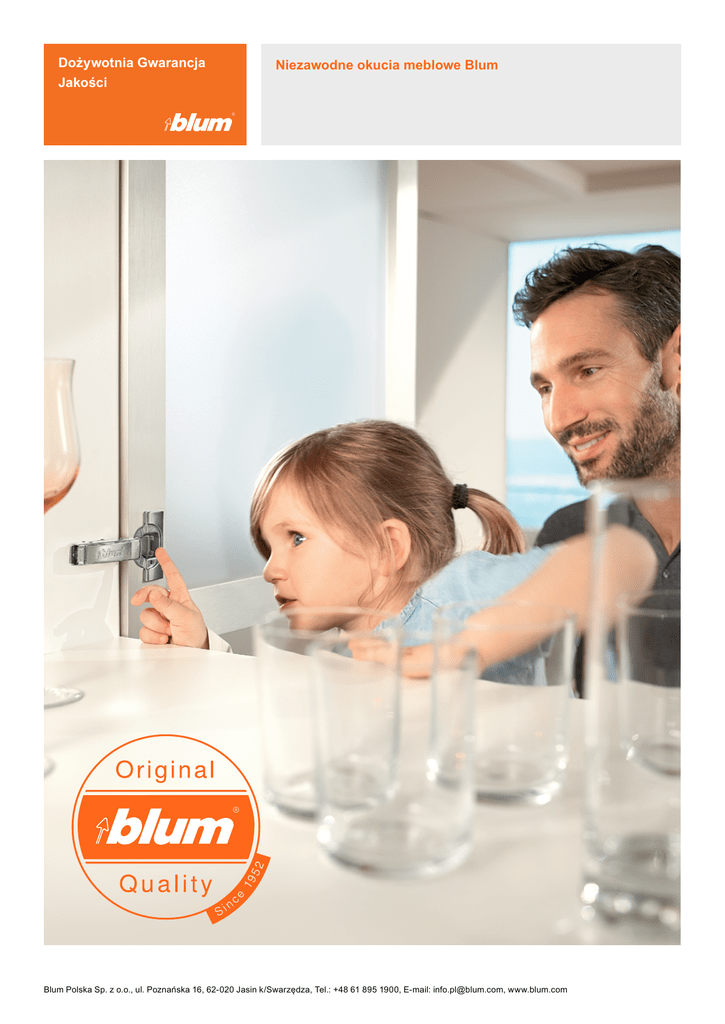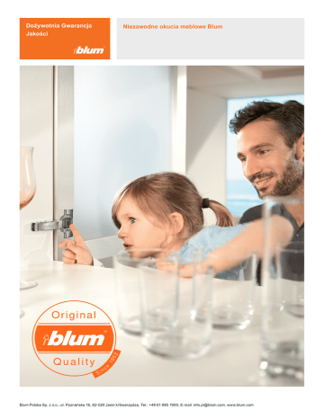 Dożywotnia Gwarancja Jakości Niezawodne okucia meblowe Blum Blum Polska Sp. z o.o., ul. Poznańska 16, 62-020 Jasin k/Swarzędza, Tel.: +48 61 895 1900, E-mail: [email protected], www.blum.com Dożywotnia Gwarancja Jakości Niezawodne okucia meblowe Blum 1. Czas obowiązywania: Blum Polska Sp. z o.o. (Blum) udziela Dożywotniej Gwarancji Jakości na swoje okucia meblowe tzn. systemy zawiasów, szuflad oraz podnośników frontów górnych. Dożywotnia Gwarancja Jakości dotyczy wyłącznie okucia zamontowanego w meblu, a czas jej obowiązywania kończy się wraz z zakończeniem użytkowania tego mebla przez konsumenta. 2. Zasięg terytorialny: Gwarancja Dożywotnia dotyczy okuć zamontowanych do mebli użytkowanych przez konsumenta wyłącznie na terenie Polski. 3. Świadczenia gwarancyjne: Jeżeli podczas użytkowania przez konsumenta mebla wyposażonego w systemy zawiasów Blum, systemy szuflad Blum lub w podnośniki frontów górnych Blum, konsument stwierdzi nieprawidłowe funkcjonowanie któregoś z okuć, Blum wyśle nieodpłatnie nowe okucie (takie samo co do rodzaju bądź funkcji). W celu uzyskania nowego okucia konsument powinien je wymontować i na własny koszt wysłać na adres Blum Polska. Do przesyłki należy dołączyć informację o rodzaju nieprawidłowości oraz adres zwrotny oraz telefon kontaktowy. Konsument dokonuje demontażu wadliwego okucia we własnym zakresie, po uprzednim zapoznaniu się ze sposobem i zasadami wykonywania tej czynności. Informacje o demontażu okuć Blum zawarte są na stronie www.blum.com. 4. Warunki gwarancji: 4.1.Gwarancja nie dotyczy okuć tzn. systemów zawiasów, szuflad oraz podnośników, które zostały niewłaściwie wbudowane, obciążone zbyt dużym ciężarem lub użytkowane niezgodnie z ich przeznaczeniem. Gwarancja nie obejmuje także okuć systemu SERVO-DRIVE, które: a) są starsze niż 5 lat licząc od momentu ich produkcji, b) zostały zastosowane w połączeniu z innymi systemami szuflad czy podnośników niż Blum lub były użytkowane niezgodnie z ich przeznaczeniem. Dożywotnia Gwarancja Jakości nie dotyczy także maszyn i urządzeń montażowych Blum. 4.2. Świadczenia gwarancyjne dotyczą jedynie ostatecznego odbiorcy produktów Blum (tj. konsumenta w rozumieniu polskiego prawa). Z uprawnień gwarancyjnych wyłączeni są przedsiębiorcy dokonujący dalszej odsprzedaży produktów Blum. 4.3. Dożywotnia Gwarancja nie wyłącza uprawnień kupującego, przysługujących mu w związku z niezgodnością towaru z umową sprzedaży. 5. Dostępność warunków Dożywotniej Gwarancji Jakości: Świadczenia z tytułu Dożywotniej Gwarancji Jakości oraz warunki gwarancji zamieszczone są na stronie www.blum.com i są dostępne dla ostatecznego odbiorcy 24h. Blum Polska Sp. z o.o., ul. Poznańska 16, 62-020 Jasin k/Swarzędza, Tel.: +48 61 895 1900, E-mail: [email protected], www.blum.com