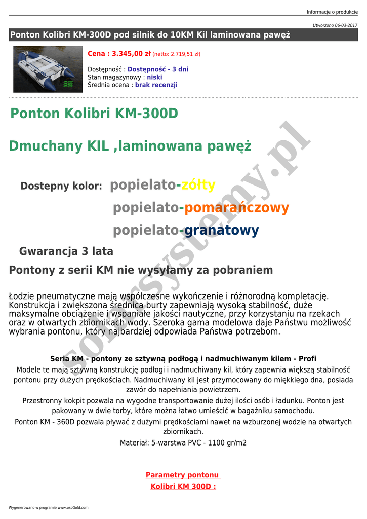 Informacje o produkcie Utworzono 06-03-2017 Ponton Kolibri KM-300D pod silnik do 10KM Kil laminowana pawęż Cena : 3.345,00 zł (netto: 2.719,51 zł) Dostępność : Dostępność - 3 dni Stan magazynowy : niski Średnia ocena : brak recenzji popielato-zółty te m Dostepny kolor: y. p Dmuchany KIL ,laminowana pawęż l Ponton Kolibri KM-300D popielato-pomarańczowy Gwarancja 3 lata ys popielato-granatowy la rs Pontony z serii KM nie wysyłamy za pobraniem so Łodzie pneumatyczne mają współczesne wykończenie i różnorodną kompletację. Konstrukcja i zwiększona średnica burty zapewniają wysoką stabilność, duże maksymalne obciążenie i wspaniałe jakości nautyczne, przy korzystaniu na rzekach oraz w otwartych zbiornikach wody. Szeroka gama modelowa daje Państwu możliwość wybrania pontonu, który najbardziej odpowiada Państwa potrzebom. Seria KM - pontony ze sztywną podłogą i nadmuchiwanym kilem - Profi Modele te mają sztywną konstrukcję podłogi i nadmuchiwany kil, który zapewnia większą stabilność pontonu przy dużych prędkościach. Nadmuchiwany kil jest przymocowany do miękkiego dna, posiada zawór do napełniania powietrzem. Przestronny kokpit pozwala na wygodne transportowanie dużej ilości osób i ładunku. Ponton jest pakowany w dwie torby, które można łatwo umieścić w bagażniku samochodu. Ponton KM - 360D pozwala pływać z dużymi prędkościami nawet na wzburzonej wodzie na otwartych zbiornikach. Materiał: 5-warstwa PVC - 1100 gr/m2 Parametry pontonu Kolibri KM 300D : Wygenerowano w programie www.oscGold.com - Długość, cm- 300 - Szerokość, cm- 160 - Średnica burty, cm- 42 - Ilość komór powietrznych- 3+1 - Maksymalne obciążenie, kg- 400 - Maksymalna ilość pasażerów- 3-4 - Moc silnika zaburtowego, KM- 10 - Waga, kg- 55 - Wymiary zapakowanego pontonu- 110/ 65/ 50+ 70/ 60/ 10 - Aluminiowe wiosła - Pawęż do silnika - Dwie ławeczki - Składana podłoga - Torb y transportowe te m - Pompka nożna y. p l Standardowe wyposażenie - Komplet naprawczy - Uchwyty na wiosła - Linki asekuracyjne - Instrukcja eksploatacji so la rs ys Pontonów KM nie wysłamy za pobraniem.