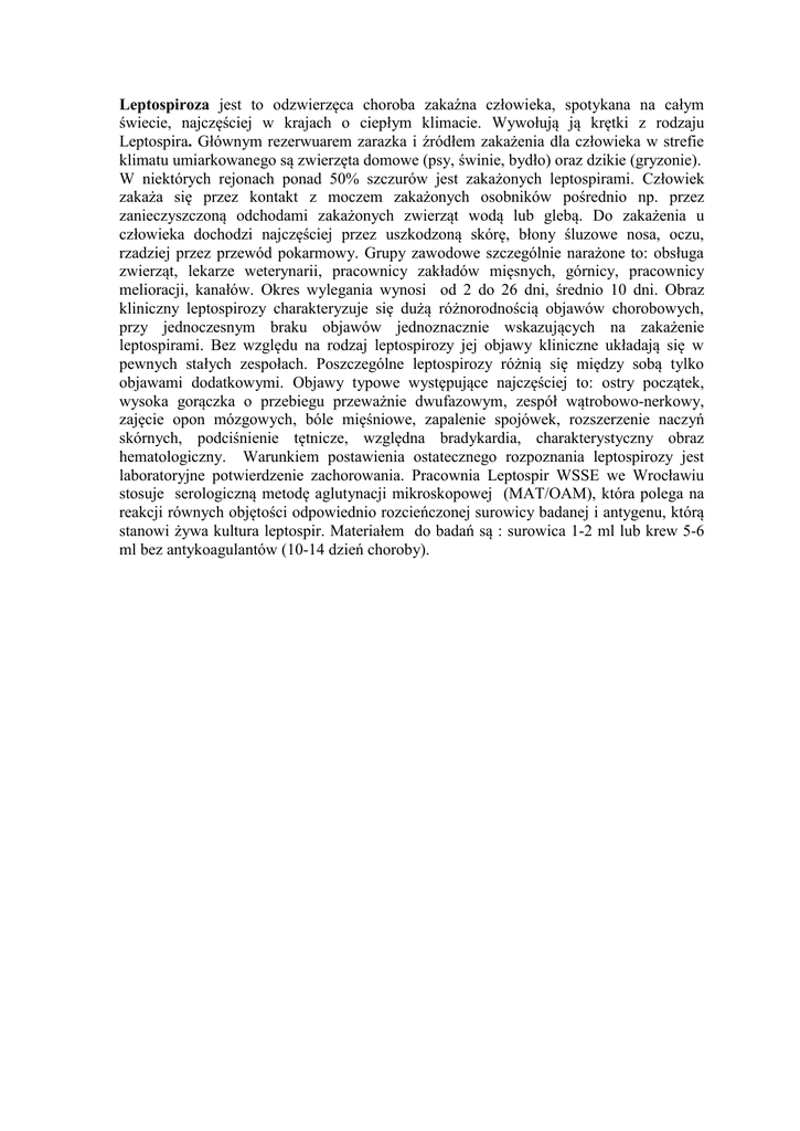 Leptospiroza jest to odzwierzęca choroba zakaźna człowieka, spotykana na całym świecie, najczęściej w krajach o ciepłym klimacie. Wywołują ją krętki z rodzaju Leptospira. Głównym rezerwuarem zarazka i źródłem zakażenia dla człowieka w strefie klimatu umiarkowanego są zwierzęta domowe (psy, świnie, bydło) oraz dzikie (gryzonie). W niektórych rejonach ponad 50% szczurów jest zakażonych leptospirami. Człowiek zakaża się przez kontakt z moczem zakażonych osobników pośrednio np. przez zanieczyszczoną odchodami zakażonych zwierząt wodą lub glebą. Do zakażenia u człowieka dochodzi najczęściej przez uszkodzoną skórę, błony śluzowe nosa, oczu, rzadziej przez przewód pokarmowy. Grupy zawodowe szczególnie narażone to: obsługa zwierząt, lekarze weterynarii, pracownicy zakładów mięsnych, górnicy, pracownicy melioracji, kanałów. Okres wylegania wynosi od 2 do 26 dni, średnio 10 dni. Obraz kliniczny leptospirozy charakteryzuje się dużą różnorodnością objawów chorobowych, przy jednoczesnym braku objawów jednoznacznie wskazujących na zakażenie leptospirami. Bez względu na rodzaj leptospirozy jej objawy kliniczne układają się w pewnych stałych zespołach. Poszczególne leptospirozy różnią się między sobą tylko objawami dodatkowymi. Objawy typowe występujące najczęściej to: ostry początek, wysoka gorączka o przebiegu przeważnie dwufazowym, zespół wątrobowo-nerkowy, zajęcie opon mózgowych, bóle mięśniowe, zapalenie spojówek, rozszerzenie naczyń skórnych, podciśnienie tętnicze, względna bradykardia, charakterystyczny obraz hematologiczny. Warunkiem postawienia ostatecznego rozpoznania leptospirozy jest laboratoryjne potwierdzenie zachorowania. Pracownia Leptospir WSSE we Wrocławiu stosuje serologiczną metodę aglutynacji mikroskopowej (MAT/OAM), która polega na reakcji równych objętości odpowiednio rozcieńczonej surowicy badanej i antygenu, którą stanowi żywa kultura leptospir. Materiałem do badań są : surowica 1-2 ml lub krew 5-6 ml bez antykoagulantów (10-14 dzień choroby).