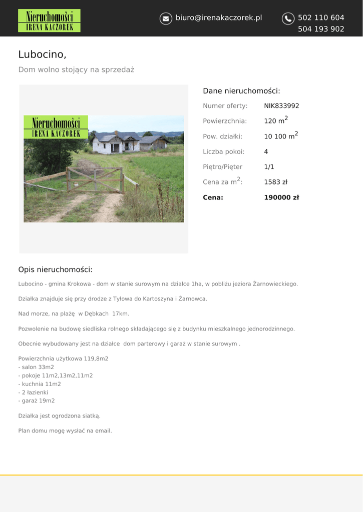 [email protected] 502 110 604 504 193 902 Lubocino, Dom wolno stojący na sprzedaż Dane nieruchomości: Numer oferty: NIK833992 Powierzchnia: 120 m Pow. działki: 10 100 m Liczba pokoi: 4 Piętro/Pięter 1/1 2 2 2 Cena za m : 1583 zł Cena: 190000 zł Opis nieruchomości: Lubocino - gmina Krokowa - dom w stanie surowym na dzialce 1ha, w pobliżu jeziora Żarnowieckiego. Działka znajduje się przy drodze z Tyłowa do Kartoszyna i Żarnowca. Nad morze, na plażę w Dębkach 17km. Pozwolenie na budowę siedliska rolnego składającego się z budynku mieszkalnego jednorodzinnego. Obecnie wybudowany jest na działce dom parterowy i garaż w stanie surowym . Powierzchnia użytkowa 119,8m2 - salon 33m2 - pokoje 11m2,13m2,11m2 - kuchnia 11m2 - 2 łazienki - garaż 19m2 Działka jest ogrodzona siatką. Plan domu mogę wysłać na email. [email protected] 502 110 604 504 193 902