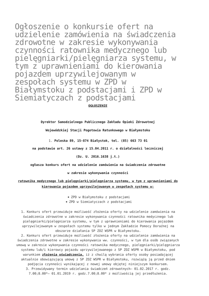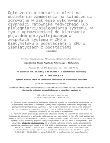 Ogłoszenie o konkursie ofert na udzielenie zamówienia na świadczenia zdrowotne w zakresie wykonywania czynności ratownika medycznego lub pielęgniarki/pielęgniarza systemu, w tym z uprawnieniami do kierowania pojazdem uprzywilejowanym w zespołach systemu w ZPD w Białymstoku z podstacjami i ZPD w Siemiatyczach z podstacjami OGŁOSZENIE Dyrektor Samodzielnego Publicznego Zakładu Opieki Zdrowotnej Wojewódzkiej Stacji Pogotowia Ratunkowego w Białymstoku 1. Poleska 89, 15-874 Białystok, tel. (85) 663 73 01 na podstawie art. 26 ustawy z 15.04.2011 r. o działalności leczniczej (Dz. U. 2016.1638 j.t.) ogłasza konkurs ofert na udzielenie zamówienia na świadczenia zdrowotne w zakresie wykonywania czynności ratownika medycznego lub pielęgniarki/pielęgniarza systemu, w tym z uprawnieniami do kierowania pojazdem uprzywilejowanym w zespołach systemu w: ZPD w Białymstoku z podstacjami ZPD w Siemiatyczach z podstacjami 1. Konkurs ofert przewiduje możliwość złożenia oferty na udzielenie zamówienia na świadczenia zdrowotne w zakresie wykonywania czynności ratownika medycznego lub pielęgniarki/pielęgniarza systemu, w tym z uprawnieniami do kierowania pojazdem uprzywilejowanym w zespołach systemu tylko w jednym Zakładzie Pomocy Doraźnej na obszarze działania SP ZOZ WSPR w Białymstoku. 2. Konkurs ofert przewiduje możliwość złożenia oferty na udzielenie zamówienia na świadczenia zdrowotne w zakresie wykonywania ww. czynności, w tym dla osób związanych umową w zakresie wykonywania czynności ratownika medycznego, pielęgniarki/pielęgniarza systemu lub/i kierowcy pojazdu uprzywilejowanego z SP ZOZ WSPR w Białymstoku, pod warunkiem złożenia oświadczenia, iż z chwilą wybrania oferty osoby posiadającej aktualnie obowiązującą umowę z SP ZOZ WSPR w Białymstoku, rozwiążą ją przed dniem podjęcia czynności wynikającej z nowej umowy objętej niniejszym konkursem. 3. Przewidywany termin udzielania świadczeń zdrowotnych– 01.02.2017 r. godz. 7.00;8.00*– 01.01.2019 r. godz.7.00;8.00* z możliwością jej przedłużenia. *dotyczy ZPD Siemiatycze z podstacjami. 1. Szacunkowa liczba ubezpieczonych i innych osób uprawnionych do świadczeń zdrowotnych na obszarze działania SP ZOZ WSPR w Białymstoku – ok. 711.000 osób. Formularz ofertowy oraz inne wymagane dokumenty związane z ofertą będą dostępne od dnia 13 stycznia 2017 r. w Dziale Kadr i Płac SP ZOZ WSPR w Białymstoku, 210. Poleska 89, pok. 210. oraz na stronie internetowej www.wspr.bialystok.pl Składanie ofert w terminie do 18 stycznia 2017 r. w Dziale Kadr i Płac SP ZOZ WSPR w Białymstoku, 15. Poleska 89, pokój 210, tel. 85 663 73 47 (do godz 15.00) Otwarcie ofert nastąpi w dniu 19 stycznia 2017 r. o godz. 10.00. Rozstrzygnięcie konkursu nastąpi w terminie nie dłuższym niż do dnia 20.01.2017 r. w siedzibie SP ZOZ WSPR w Białymstoku, a wyniki będą dostępne na stronie internetowej wspr.bialystok.pl Udzielający zamówienia informuje, iż zostaną przeprowadzone testy z wiedzy medycznej i znajomości topografii obszaru działania odpowiedniego ZPD z podstacjami, z wyłączeniem: 1. test z topografii obszaru działania nie dotyczy osób aktualnie zatrudnionych/wykonujących czynności prowadzenia pojazdu uprzywilejowanego w SP ZOZ WSPR w Białymstoku w danym ZPD – zgodny z tym na który jest składana oferta. 2. test z wiedzy medycznej nie dotyczy osób aktualnie zatrudnionych w SP ZOZ WSPR w Białymstoku na stanowisku ratownika medycznego lub pielęgniarki/pielęgniarza systemu (w tym z uprawnieniami do prowadzenia pojazdu uprzywilejowanego). Udzielający zamówienia zastrzega sobie prawo odwołania konkursu, zmiany terminu rozstrzygnięcia oraz przesunięcia terminu składania ofert – bez podania przyczyn. Oferent ma prawo do złożenia protestu w toku postępowania konkursowego i odwołania dotyczącego rozstrzygnięcia postępowania zgodnie z obowiązującymi przepisami prawa. Termin związania ofertą kończy się 30 dnia od upływu terminu składania ofert. Białystok, dnia 12 stycznia 2017 r. Wyniki Ogłoszenie o konkursie ofert na udzielenie zamówienia na świadczenia zdrowotne w zakresie wykonywania czynności dyspozytora medycznego na obszarze działania SP ZOZ WSPR w Białymstoku z miejscem wykonywania czynności w ZPD Białystok OGŁOSZENIE Dyrektor Samodzielnego Publicznego Zakładu Opieki Zdrowotnej Wojewódzkiej Stacji Pogotowia Ratunkowego w Białymstoku 1. Poleska 89, 15-874 Białystok, tel. (85) 663 73 301 na podstawie art. 26 ustawy z 15.04.2011r. o działalności leczniczej (Dz. U. 2016.1638 j.t.) ogłasza konkurs ofert na udzielenie zamówienia na świadczenia zdrowotne w zakresie wykonywania czynności dyspozytora medycznego na obszarze działania SP ZOZ WSPR w Białymstoku z miejscem wykonywania czynności w ZPD Białystok Przewidywany termin udzielania świadczeń zdrowotnych (czas, na jaki może być zawarta umowa) – 01.02.2017 r., godz. 7.00– 01.01.2019, godz.7.00. z możliwością jej przedłużenia Szacunkowa liczba ubezpieczonych i innych osób uprawnionych do świadczeń zdrowotnych na obszarze działania SP ZOZ WSPR w Białymstoku – ok. 711.000 osób. Formularz ofertowy oraz inne dokumenty związane z ofertą będą dostępne od dnia 13.01.2017 r. w Dziale Kadr i Płac SP ZOZ WSPR w Białymstoku ul. Poleska 89, oraz na stronie internetowej www.wspr.bialystok.pl Składanie ofert w terminie do 18.01.2017 r. w Dziale Kadr i Płac SP ZOZ WSPR w Białymstoku, 15. Poleska 89, pokój 210, tel. 85 663 73 47 (do godz.15.00). 1. Otwarcie ofert nastąpi w dn. 19.01.2017 r. o godz. 09.00 2. Rozstrzygnięcie konkursu nastąpi w terminie nie dłuższym niż do dnia 20.01.2017 r. godz. 15.00 w siedzibie SP ZOZ WSPR w Białymstoku, a wyniki będą dostępne na tablicy ogłoszeń w miejscu oraz na stronie internetowej www.wspr.bialystok.pl 3. Udzielający zamówienia zastrzega sobie prawo odwołania konkursu, zmiany terminu rozstrzygnięcia oraz przesuni