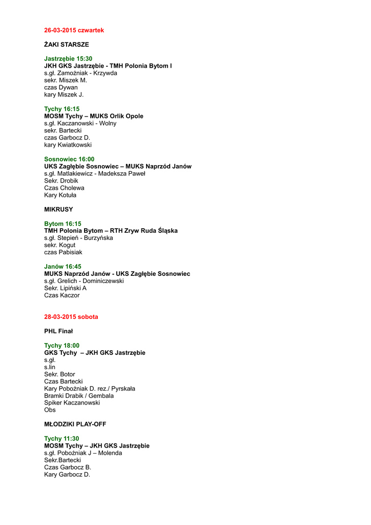 26-03-2015 czwartek ŻAKI STARSZE Jastrzębie 15:30 JKH GKS Jastrzębie - TMH Polonia Bytom I s.gł. Zamożniak - Krzywda sekr. Miszek M. czas Dywan kary Miszek J. Tychy 16:15 MOSM Tychy – MUKS Orlik Opole s.gł. Kaczanowski - Wolny sekr. Bartecki czas Garbocz D. kary Kwiatkowski Sosnowiec 16:00 UKS Zagłębie Sosnowiec – MUKS Naprzód Janów s.gł. Matlakiewicz - Madeksza Paweł Sekr. Drobik Czas Cholewa Kary Kotuła MIKRUSY Bytom 16:15 TMH Polonia Bytom – RTH Zryw Ruda Śląska s.gł. Stepień - Burzyńska sekr. Kogut czas Pabisiak Janów 16:45 MUKS Naprzód Janów - UKS Zagłębie Sosnowiec s.gł. Grelich - Dominiczewski Sekr. Lipiński A Czas Kaczor 28-03-2015 sobota PHL Finał Tychy 18:00 GKS Tychy – JKH GKS Jastrzębie s.gł. s.lin Sekr. Botor Czas Bartecki Kary Pobożniak D. rez./ Pyrskała Bramki Drabik / Gembala Spiker Kaczanowski Obs MŁODZIKI PLAY-OFF Tychy 11:30 MOSM Tychy – JKH GKS Jastrzębie s.gł. Pobożniak J – Molenda Sekr.Bartecki Czas Garbocz B. Kary Garbocz D. Sosnowiec 16:00 UKS Zagłębie Sosnowiec – MUKS Naprzód Janów s.gł. Madeksza Piotr - Madeksza Paweł Sekr. Drobik Czas Cholewa Kary Malara 29-03-2015 niedziela PHL Tychy 16:30 GKS Tychy – JKH GKS Jastrzębie s.gł. s.lin Sekr. Bartecki Czas Botor Kary Molenda rez./ Pobożniak J. Bramki Drabik / Wolny Spiker Kaczanowski Obs MŁODZIKI PLAY OFF Jastrzębie 12:30 JKH GKS Jastrzębie – MOSM Tychy s.gł. Pobożniak D - Zamożniak sekr. Miszek M czas Dywan kary Cieśla ŻAKI STARSZE Bytom 10:00 zgłoszono 24.03.2015 RTH Zryw Ruda Śląska – MUKS Naprzód Janów s.gł. Kogut – Stepień Sekr. Kucharczyk Czas Pabisiak Kary Krężel MINI-HOKEJ Tychy 11:45 TURNIEJ s.gł. Kucharewicz – Kaczanowski sekr. Botor / Pobożniak J. czas Garbocz B. 30-03-2015 poniedziałek MIKRUSY Tychy 16:15 MOSM Tychy – UKH Unia Oświęcim s.gł. Kucharewicz - Wolny sekr. Botor czas Kwiatkowski 01-04-2015 środa PHL Finał Jastrzębie 18:00 JKH GKS Jastrzębie - GKS Tychy s.gł. s.lin Sekr. Kaczanowski Czas Dywan Kary Breske rez./ Miszek M. Bramki Wolny / Gembala Spiker Oleś Obs Referat obsady Mariusz Tymczyszyn