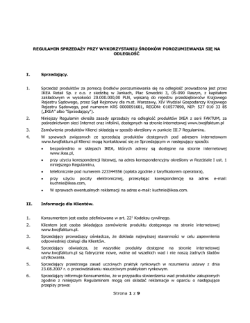 REGULAMIN SPRZEDAŻY PRZY WYKORZYSTANIU ŚRODKÓW POROZUMIEWANIA SIĘ NA ODLEGŁOŚĆ I. Sprzedający. 1. Sprzedaż produktów za pomocą środków porozumiewania się na odległość prowadzona jest przez IKEA Retail Sp. z o.o. z siedzibą w Jankach, Plac Szwedzki 3, 05-090 Raszyn, z kapitałem zakładowym w wysokości 20.000.000,00 PLN, wpisaną do rejestru przedsiębiorców Krajowego Rejestru Sądowego, przez Sąd Rejonowy dla m.st. Warszawy, XIV Wydział Gospodarczy Krajowego Rejestru Sądowego, pod numerem KRS 0000091681, REGON: 010577890, NIP: 527 010 33 85 („IKEA” albo "Sprzedający"). 2. Niniejszy Regulamin określa zasady sprzedaży na odległość produktów IKEA z serii FAKTUM, za pośrednictwem sieci Internet oraz infolinii, dostępnych na stronie internetowej www.twojfaktum.pl 3. Zamówienia produktów Klienci składają w sposób określony w punkcie III.7 Regulaminu. 4. W sprawach związanych ze sprzedażą produktów dostępnych pod adresem internetowym www.twojfaktum.pl Klienci mogą kontaktować się ze Sprzedającym w następujący sposób: bezpośrednio w sklepach IKEA, których adresy są dostępne na stronie internetowej www.ikea.pl, przy użyciu korespondencji listowej, na adres korespondencyjny określony w Rozdziale I ust. 1 niniejszego Regulaminu, telefonicznie pod numerem 223344556 (opłata zgodnie z taryfikatorem operatora), przy użyciu poczty [email protected], W sprawach ewentualnych reklamacji na adres e-mail: [email protected]. elektronicznej, przesyłając korespondencję na adres e-mail: II. Informacje dla Klientów. 1. Konsumentem jest osoba zdefiniowana w art. 221 Kodeksu cywilnego. 2. Klientem jest osoba składająca zamówienie produktu dostępnego na stronie internetowej www.twojfaktum.pl. 3. Sprzedający prowadzący oświadcza, że dokłada najwyższej staranności w celu zapewnienia odpowiedniej obsługi dla Klientów. 4. Sprzedający oświadcza, że wszystkie produkty dostępne na stronie internetowej www.twojfaktum.pl są fabrycznie nowe, wolne od wszelkich wad i nie noszą żadnych śladów użytkowania. 5. Sprzedający przestrzega zasad uczciwych praktyk rynkowych w rozumieniu ustawy z dnia 23.08.2007 r. o przeciwdziałaniu nieuczciwym praktykom rynkowym. 6. Sprzedający informuje Konsumentów, że w przypadku stwierdzenia wad produktów zakupionych zgodnie z niniejszym Regulaminem mogą oni składać reklamacje w oparciu o następujące przepisy prawa: Strona 1 z 9 a) Ustawę z dnia 30 maja 2014 r. o prawach konsumenta oraz ustawę z dnia 23 kwietnia 1964 Kodeks cywilny dla umów sprzedaży zawartych od dnia 25 grudnia 2014 r. b) Ustawę z dnia 27 lipca 2002 r. o szczególnych warunkach sprzedaży konsumenckiej oraz o zmianie kodeksu cywilnego oraz ustawę z dnia 23 kwietnia 1964 Kodeks cywilny dla umów sprzedaży zawartych przed dniem 25 grudnia 2014 r. c) na podstawie warunków gwarancji jakości udzielonej przez Sprzedającego albo podmioty współpracujące ze Sprzedającym, jeżeli dany produkt został objęty taką gwarancją. Jednocześnie sprzedający informuje, że udzielana gwarancja nie wyłącza, nie ogranicza, ani nie zawiesza uprawnień kupującego wynikających z przepisów określonych w punktach poprzedzających tj. 6 a) i 6 b). 7. Sprzedający rozpatruje reklamacje zgodnie z przepisami prawa wskazanymi w punkcie poprzedzającym oraz na zasadach określonych w warunkach gwarancji w przypadku produktów, na które gwarancja została udzielona. 8. Informacje o produktach objętych gwarancją oraz warunki gwarancji określone są dokumentach gwarancji dostępnych na stronie internetowej www.twojfaktum.pl w zakładce Gwarancje. 9. W przypadku ewentualnych sporów dotyczących zakupionych produktów Sprzedający będzie dążył do polubownego wyjaśnienia sprawy. 10. Sprzedający informuje, że Konsument ma możliwość pozasądowego rozpatrywania reklamacji poprzez: a) Złożenie reklamacji do Sprzedającego albo gwaranta, b) Uzyskanie nieodpłatnej pomocy prawnej od właściwego Rzecznika Konsumentów lub organizacji pozarządowych działających na rzecz konsumentów, c) Uzyskanie nieodpłatnej pomocy prawnej ze strony organów administracji państwowej, a w szczególności Urzędu Ochrony Konkurencji i Konsumentów oraz Inspekcji Handlowej. III. Oferowane usługi i procedura składania zamówienia. 1. Informacje znajdujące się stronie internetowej www.twojfaktum.pl nie stanowią oferty w rozumieniu Kodeksu Cywilnego. Wszelkie informacje o produktach i stanach magazynowych umieszczone na stronie www.twojfaktum.pl, w szczególności opisy, parametry techniczne i użytkowe, ceny stanowią zaproszenie do zawarcia umowy, która będzie zawierana i realizowana na zasadach wskazanych w niniejszym Regulaminie. 2. Klient składając zamówienie zgodnie z pkt 7 poniżej, składa ofertę kupna określonego produktu na warunkach podanych w opisie produktu. 3. Ceny produktów umieszczone na stronie www.twojfaktum.pl są cenami brutto (zawierają podatek od towarów i usług VAT) i podane są w złotych polskich. Przedstawione ceny produktów nie zawierają ceny dostarczenia produktu do Klienta. 4. W trakcie wypełniania formularza zamówienia produktu na stronie www.twojfaktum.pl, lub w trakcie składania zamówienia drogą telefoniczną zgodnie z pkt 7 poniżej, Klient otrzyma informację o wiążącej cenie brutto za zamówiony produkt oraz kosztach dostawy produktu zgodnie z opcją wybraną przez Klienta. Wszelkie ceny wskazane na stronie internetowej www.twojfaktum.pl inne niż cena podana Klientowi w formularzu zamówienia lub w rozmowie telefonicznej z konsultantem nie są wiążące dla stron. 5. Faktury VAT będą przesyłane Klientowi drogą elektroniczną. Strona 2 z 9 6. Zdjęcia produktów zamieszczone na stronie internetowej www.twojfaktum.pl, mogą nieznacznie różnić się od rzeczywistego wyglądu produktu. Różnice te mogą dotyczyć kolorystyki produktów, co wynika z różnic pomiędzy obrazem fotografii wykon