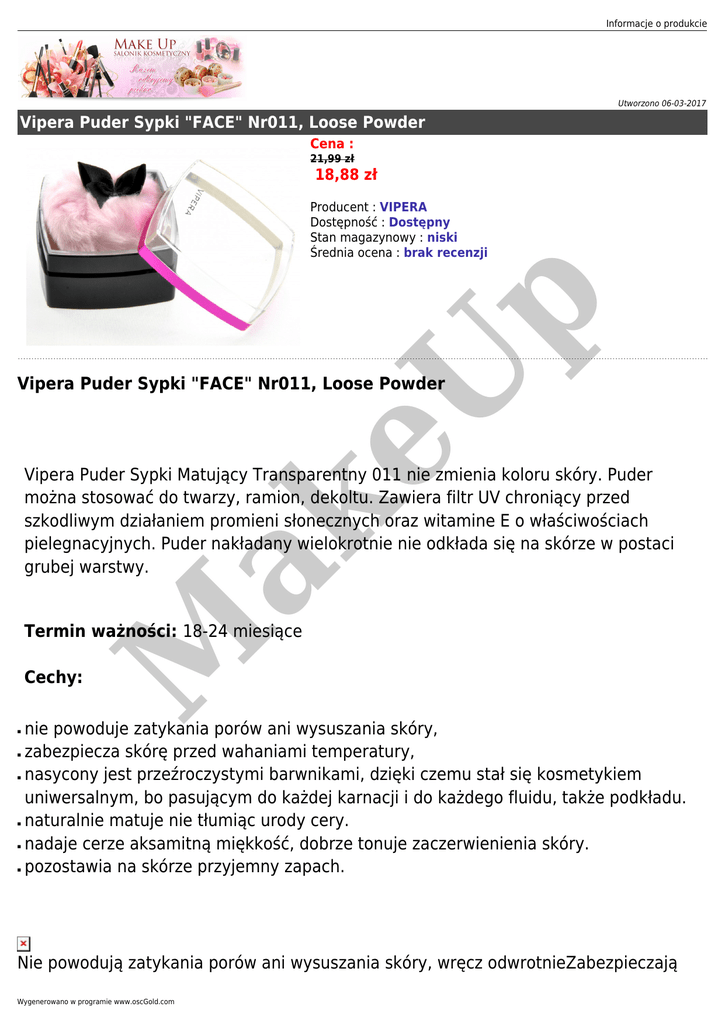 Informacje o produkcie Utworzono 06-03-2017 Vipera Puder Sypki "FACE" Nr011, Loose Powder Cena : 21,99 zł 18,88 zł ak eU p Producent : VIPERA Dostępność : Dostępny Stan magazynowy : niski Średnia ocena : brak recenzji Vipera Puder Sypki "FACE" Nr011, Loose Powder Vipera Puder Sypki Matujący Transparentny 011 nie zmienia koloru skóry. Puder można stosować do twarzy, ramion, dekoltu. Zawiera filtr UV chroniący przed szkodliwym działaniem promieni słonecznych oraz witamine E o właściwościach pielegnacyjnych. Puder nakładany wielokrotnie nie odkłada się na skórze w postaci grubej warstwy. M Termin ważności: 18-24 miesiące Cechy: ■ ■ ■ ■ ■ ■ nie powoduje zatykania porów ani wysuszania skóry, zabezpiecza skórę przed wahaniami temperatury, nasycony jest przeźroczystymi barwnikami, dzięki czemu stał się kosmetykiem uniwersalnym, bo pasującym do każdej karnacji i do każdego fluidu, także podkładu. naturalnie matuje nie tłumiąc urody cery. nadaje cerze aksamitną miękkość, dobrze tonuje zaczerwienienia skóry. pozostawia na skórze przyjemny zapach. Nie powodują zatykania porów ani wysuszania skóry, wręcz odwrotnieZabezpieczają Wygenerowano w programie www.oscGold.com skórę przed wahaniami temperatury. Pojemnośc: 15g M ak eU p Produkt absolutnie świeży i nieużywany