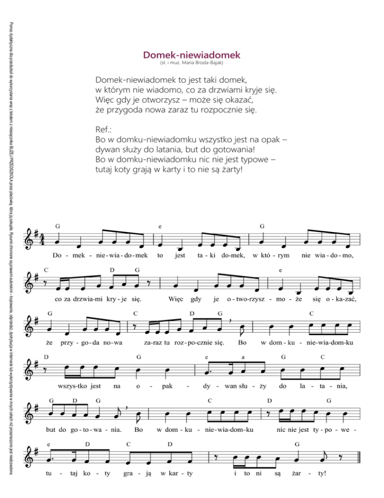 Pomoc dydaktyczna dla przedszkoli do wykorzystania wraz z tekstem z miesięcznika BLIŻEJ PRZEDSZKOLA przez placówkę, która ją zakupiła. Rysunki chronione są prawami autorskimi – kopiowanie, odprzedaż, dystrybucja w internecie lub wykorzystywanie w innych celach niż przeznaczono jest niedozwolone. Domek-niewiadomek (sł. i muz. Maria Broda-Bajak) Domek-niewiadomek to jest taki domek, w którym nie wiadomo, co za drzwiami kryje się. Więc gdy je otworzysz – może się okazać, że przygoda nowa zaraz tu rozpocznie się. Ref.: Bo w domku-niewiadomku wszystko jest na opak – dywan służy do latania, but do gotowania! Bo w domku-niewiadomku nic nie jest typowe – tutaj koty grają w karty i to nie są żarty!