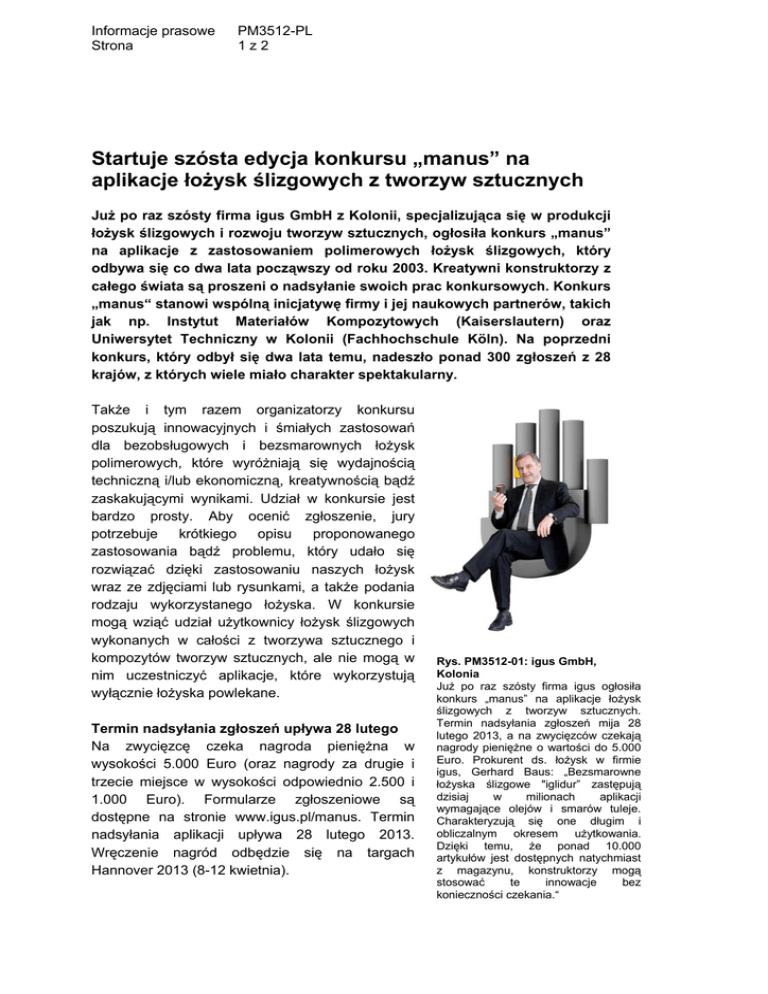 Informacje prasowe Strona PM3512-PL 1z2 Startuje szósta edycja konkursu „manus” na aplikacje łożysk ślizgowych z tworzyw sztucznych Już po raz szósty firma igus GmbH z Kolonii, specjalizująca się w produkcji łożysk ślizgowych i rozwoju tworzyw sztucznych, ogłosiła konkurs „manus” na aplikacje z zastosowaniem polimerowych łożysk ślizgowych, który odbywa się co dwa lata począwszy od roku 2003. Kreatywni konstruktorzy z całego świata są proszeni o nadsyłanie swoich prac konkursowych. Konkurs „manus“ stanowi wspólną inicjatywę firmy i jej naukowych partnerów, takich jak np. Instytut Materiałów Kompozytowych (Kaiserslautern) oraz Uniwersytet Techniczny w Kolonii (Fachhochschule Köln). Na poprzedni konkurs, który odbył się dwa lata temu, nadeszło ponad 300 zgłoszeń z 28 krajów, z których wiele miało charakter spektakularny. Także i tym razem organizatorzy konkursu poszukują innowacyjnych i śmiałych zastosowań dla bezobsługowych i bezsmarownych łożysk polimerowych, które wyróżniają się wydajnością techniczną i/lub ekonomiczną, kreatywnością bądź zaskakującymi wynikami. Udział w konkursie jest bardzo prosty. Aby ocenić zgłoszenie, jury potrzebuje krótkiego opisu proponowanego zastosowania bądź problemu, który udało się rozwiązać dzięki zastosowaniu naszych łożysk wraz ze zdjęciami lub rysunkami, a także podania rodzaju wykorzystanego łożyska. W konkursie mogą wziąć udział użytkownicy łożysk ślizgowych wykonanych w całości z tworzywa sztucznego i kompozytów tworzyw sztucznych, ale nie mogą w nim uczestniczyć aplikacje, które wykorzystują wyłącznie łożyska powlekane. Termin nadsyłania zgłoszeń upływa 28 lutego Na zwycięzcę czeka nagroda pieniężna w wysokości 5.000 Euro (oraz nagrody za drugie i trzecie miejsce w wysokości odpowiednio 2.500 i 1.000 Euro). Formularze zgłoszeniowe są dostępne na stronie www.igus.pl/manus. Termin nadsyłania aplikacji upływa 28 lutego 2013. Wręczenie nagród odbędzie się na targach Hannover 2013 (8-12 kwietnia). Rys. PM3512-01: igus GmbH, Kolonia Już po raz szósty firma igus ogłosiła konkurs „manus” na aplikacje łożysk ślizgowych z tworzyw sztucznych. Termin nadsyłania zgłoszeń mija 28 lutego 2013, a na zwycięzców czekają nagrody pieniężne o wartości do 5.000 Euro. Prokurent ds. łożysk w firmie igus, Gerhard Baus: „Bezsmarowne łożyska ślizgowe "iglidur” zastępują dzisiaj w milionach aplikacji wymagające olejów i smarów tuleje. Charakteryzują się one długim i obliczalnym okresem użytkowania. Dzięki temu, że ponad 10.000 artykułów jest dostępnych natychmiast z magazynu, konstruktorzy mogą stosować te innowacje bez konieczności czekania.“ Informacje prasowe Strona PM3512-PL 2z2 Bezsmarowne, ekonomiczne, trwałe Bezsmarowne i bezobsługowe łożyska ślizgowe z tworzywa sztucznego „iglidur“ zastępują obecnie w milionach zastosowań wymagające olejów i smarów tuleje metalowe – wyjaśnia Gerhard Baus, prokurent ds. łożysk ślizgowych z tworzyw sztucznych w firmie igus. „Charakteryzują się one długim i obliczalnym okresem użytkowania. A dzięki temu, że ponad 10.000 artykułów jest dostępnych natychmiast z magazynu, konstruktorzy mogą stosować te innowacje bez konieczności czekania.“ Ponadto pracujące bez smarowania łożyska polimerowe zapewniają większe bezpieczeństwo maszyn. Według studium sporządzonego przez MIT (Massuchusetts Institute of Technology), Cambridge, w samych tylko Stanach Zjednoczonych koszty awarii wynikających z braku smarowania sięgają 240 miliardów dolarów rocznie. A przy rocznym zużyciu środków smarowych rzędu prawie 1,1 mln. ton w Niemczech (Ministerstwo Ochrony Środowiska, Klimatu i Gospodarki Energetycznej, Baden-Würtemberg) ekonomiczne rozwiązania polimerowe mogą przynieść znaczne oszczędności w zakresie kosztów nabycia i eksploatacji. Według informacji udzielonych przez organizatora konkursu „manus“ - firmę igus, która oferuje poprzez swoje badania w laboratorium, unikalną i ogromną bazę danych oraz specjalne procesy produkcyjne, największy na świecie program przyjaznych dla środowiska łożysk ślizgowych dry-tech z tworzywa sztucznego z możliwością obliczania okresu użytkowania. Od roku 2001 – równie na skalę światową – konstruktorzy mogą podejmować decyzje w sprawie odpowiedniego łożyska online na stronie www.igus.pl na podstawie zweryfikowanych empirycznie, możliwych do obliczenia danych w zakresie żywotności produktu. www.igus.pl www.igus.pl/manus KONTAKT: igus® Sp. z o.o. ul. Nakielska 3 01-106 Warszawa Tel. 22-863 57 70 Faks 22-863 61 69 [email protected] www.igus.pl KONTAKT PRASOWY: Jörg Landgraf Corporate Communication igus GmbH Spicher Str. 1a D-51147 Köln Tel. +49 (0) 22 03 / 96 49 - 459 Fax +49 (0) 22 03 / 96 49 - 631 [email protected] www.igus.de DIN ISO 9001:2008 “igus, chainflex, readycable, easychain, e-chain, e-chainsystems, energy chain, energy chain system, flizz, readychain, triflex, twisterchain, invis, drylin, iglidur, igubal, xiros, xirodur, plastics for longer life, manus, vector“ są znakami towarowymi chronionymi prawem w Republice Federalnej Niemiec i na całym świecie.