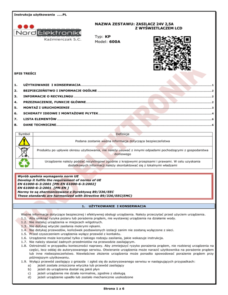 Instrukcja użytkowania .....PL NAZWA ZESTAWU: ZASILACZ 24V 2,5A Z WYŚWIETLACZEM LCD Typ: KP Model: 600A SPIS TREŚCI 1. UŻYTKOWANIE I KONSERWACJA .............................................................................................................................................................. 1 2. BEZPIECZEŃSTWO I INFORMACJE OGÓLNE .......................................................................................................................................... 2 3. INFORMACJE O RECYKLINGU ....................................................................................................................................................................... 2 4. PRZEZNACZENIE, FUNKCJE GŁÓWNE ........................................................................................................................................................ 2 5. MONTAŻ I URUCHOMIENIE ........................................................................................................................................................................... 3 6. SCHEMATY IDEOWE I MONTAŻOWE PŁYTEK ......................................................................................................................................... 4 7. LISTA ELEMENTÓW ........................................................................................................................................................................................... 6 8. DANE TECHNICZNE............................................................................................................................................................................................ 6 Symbol Definicje Podana zostanie ważna informacja dotycząca bezpieczeństwa Produktu po upływie okresu użytkowania, nie należy usuwać z innymi odpadami pochodzącymi z gospodarstwa domowego Urządzenie należy poddać recyklingowi zgodnie z krajowymi przepisami i prawami. W celu uzyskania dodatkowych informacji należy skontaktować się z lokalnymi władzami Wyrób spełnia wymagania norm UE Develop it fulfils the requirement of norms of UE EN 61000-6-3:2001 [PN-EN 61000-6-3:2002] EN 61000-6-2:2001 [PN-EN ] Normy te są zharmonizowane z Dyrektywą 89/336/EEC These standards are harmonized with Directive 89/336/EEC(EMC) 1. UŻYTKOWANIE I KONSERWACJA Ważne informacje dotyczące bezpiecznej i efektywnej obsługi urządzenia. Należy przeczytać przed użyciem urządzenia. 1.1. Aby uniknąć ryzyka pożaru lub porażenia prądem, nie wystawiaj urządzenia na działanie wody. 1.2. Nie instaluj urządzenia w miejscach wilgotnych. 1.3. Nie dotykaj wtyczki zasilania mokrymi rękami. 1.4. Nie dotykaj przewodów, końcówek pozbawionych izolacji zanim nie zostaną wyłączone z sieci. 1.5. Przed czyszczeniem urządzenia wyłącz przewód z kontaktu. 1.6. Urządzenie może korzystać tylko z takiego rodzaju zasilania, jakie wskazuje instrukcja. 1.7. Nie należy stawiać żadnych przedmiotów na przewodzie zasilającym. 1.8. Ostrożność w przypadku konieczności naprawy. Aby zmniejszyć ryzyko porażenia prądem, nie rozbieraj urządzenia na części, lecz oddaj do autoryzowanego serwisu. Otwieranie urządzenia może narazić użytkownika na porażenie prądem lub inne niebezpieczeństwo. Niewłaściwe złożenie urządzenia może ponadto spowodować porażenie prądem przy późniejszym użytkowaniu. 1.9. Wyłącz przewód zasilający z gniazda i zgłoś się do autoryzowanego serwisu w następujących przypadkach: a) jeżeli została zniszczona wtyczka lub przewód zasilający b) jeżeli do urządzenia dostał się jakiś płyn c) jeżeli urządzenie nie działa normalnie, zgodnie z obsługą d) jeżeli urządzenie upadło lub zostało mechanicznie uszkodzone Strona 1 z 6 e) jeżeli urządzenie przejawia wyraźne zmiany w sposobie działania f) nie korzystaj z urządzenia, jeżeli znajdujesz się w pobliżu nieszczelnej instalacji gazowe. 1.10. Informacje dodatkowe. Zabezpieczenia przed przepięciami w sieci (wyładowaniami atmosferycznymi). Gniazdo zasilające powinno być dodatkowo zabezpieczone przed skutkami wyładowań atmosferycznych. Wybór właściwego zabezpieczenia powinien być przeprowadzony przez uprawnionego instalatora. Uszkodzenie urządzenia spowodowane przepięciami w sieci w wyniku wyładowań atmosferycznym nie są objęte gwarancją, nawet, jeśli zastosowano wymienione wyżej zabezpieczenia dodatkowe. Podczas prób przeprowadzonych w docelowych warunkach użytkowania sprzętu nie stwierdzono szkodliwego wpływu urządzenia na inne urządzenia elektryczne i elektroniczne. UWAGA. Moduł powinien być zmontowany zgodnie z instrukcją. Produkt przeznaczony jest dla osób dorosłych. 2. BEZPIECZEŃSTWO I INFORMACJE OGÓLNE 2.1. Nie montować urządzenia w pomieszczeniach o wysokiej temperaturze. Wysokie temperatury mogą być przyczyną uszkodzeń podzespołów elektronicznych, odkształceń lub stopienia elementów plastikowych. 2.2. Nie używać urządzenia w miejscach wilgotnych np.: łazienka, sauny parowe, może to spowodować pożar lub być przyczyną porażenia elektrycznego. 2.3. Urządzenie powinno być zawsze suche . Nie powinno być narażone na padające krople i bryzgi wodne. W przypadku zawilgocenia urządzenia może to spowodować uszkodzenie podzespołów elektronicznych. 2.4. Nie wkładać żadnych przedmiotów w otwory wentylacyjne, grozi to uszkodzeniem urządzenia. 2.5. Nie upuszczaj, nie uderzaj i nie potrząsaj urządzeniem. Nieostrożne obchodzenie się z nim może spowodować uszkodzenie podzespołów elektronicznych i delikatnych mechanizmów. 2.6. Do czyszczenia nie używać wody, chemikaliów, rozpuszczalników. Czyścić wilgotną ściereczką z dodatkiem detergentów. 2.7. Do czyszczenia reflektorów używaj miękkiej, czystej i suchej ściereczki. 2.8. W przypadku wydobywania się podejrzanego zapachu/dym/, odłączyć niezwłocznie od zasilania i skontaktować się ze sprzedawcą lub producentem