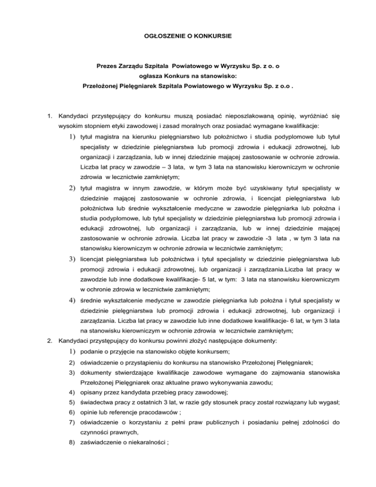 OGŁOSZENIE O KONKURSIE Prezes Zarządu Szpitala Powiatowego w Wyrzysku Sp. z o. o ogłasza Konkurs na stanowisko: Przełożonej Pielęgniarek Szpitala Powiatowego w Wyrzysku Sp. z o.o . 1. Kandydaci przystępujący do konkursu muszą posiadać nieposzlakowaną opinię, wyróżniać się wysokim stopniem etyki zawodowej i zasad moralnych oraz posiadać wymagane kwalifikacje: 1) tytuł magistra na kierunku pielęgniarstwo lub położnictwo i studia podyplomowe lub tytuł specjalisty w dziedzinie pielęgniarstwa lub promocji zdrowia i edukacji zdrowotnej, lub organizacji i zarządzania, lub w innej dziedzinie mającej zastosowanie w ochronie zdrowia. Liczba lat pracy w zawodzie – 3 lata, w tym 3 lata na stanowisku kierowniczym w ochronie zdrowia w lecznictwie zamkniętym; 2) tytuł magistra w innym zawodzie, w którym może być uzyskiwany tytuł specjalisty w dziedzinie mającej zastosowanie w ochronie zdrowia, i licencjat pielęgniarstwa lub położnictwa lub średnie wykształcenie medyczne w zawodzie pielęgniarka lub położna i studia podyplomowe, lub tytuł specjalisty w dziedzinie pielęgniarstwa lub promocji zdrowia i edukacji zdrowotnej, lub organizacji i zarządzania, lub w innej dziedzinie mającej zastosowanie w ochronie zdrowia. Liczba lat pracy w zawodzie -3 lata , w tym 3 lata na stanowisku kierowniczym w ochronie zdrowia w lecznictwie zamkniętym; 3) licencjat pielęgniarstwa lub położnictwa i tytuł specjalisty w dziedzinie pielęgniarstwa lub promocji zdrowia i edukacji zdrowotnej, lub organizacji i zarządzania.Liczba lat pracy w zawodzie lub inne dodatkowe kwalifikacje- 5 lat, w tym: 3 lata na stanowisku kierowniczym w ochronie zdrowia w lecznictwie zamkniętym; 4) średnie wykształcenie medyczne w zawodzie pielęgniarka lub położna i tytuł specjalisty w dziedzinie pielęgniarstwa lub promocji zdrowia i edukacji zdrowotnej, lub organizacji i zarządzania. Liczba lat pracy w zawodzie lub inne dodatkowe kwalifikacje- 6 lat, w tym 3 lata na stanowisku kierowniczym w ochronie zdrowia w lecznictwie zamkniętym; 2. Kandydaci przystępujący do konkursu powinni złożyć następujące dokumenty: 1) podanie o przyjęcie na stanowisko objęte konkursem; 2) oświadczenie o przystąpieniu do konkursu na stanowisko Przełożonej Pielęgniarek; 3) dokumenty stwierdzające kwalifikacje zawodowe wymagane do zajmowania stanowiska Przełożonej Pielęgniarek oraz aktualne prawo wykonywania zawodu; 4) opisany przez kandydata przebieg pracy zawodowej; 5) świadectwa pracy z ostatnich 3 lat, w razie gdy stosunek pracy został rozwiązany lub wygasł; 6) opinie lub referencje pracodawców ; 7) oświadczenie o korzystaniu z pełni praw publicznych i posiadaniu pełnej zdolności do czynności prawnych, 8) zaświadczenie o niekaralności ; 9) inne dokumenty, w szczególności potwierdzające dorobek i kwalifikacje zawodowe kandydata. 3. Dokumenty przedłożone w kopiach muszą być potwierdzone za zgodność z oryginałem przez kandydata. Kandydat wyłoniony w drodze konkursu będzie zobowiązany do przedstawienia oryginałów dokumentów. 4. Kandydat zgłaszający się do konkursu składa oświadczenie, że wyraża zgodę na przetwarzanie danych osobowych w celach przeprowadzania postępowania konkursowego na dane stanowisko. 5. Dokumenty, o których mowa w ust. 2, kandydaci zgłaszający się do konkursu składają w Sekretariacie Szpital Powiatowego w Wyrzysku, ul. 22 Stycznia 41, 89-300 Wyrzysk; na kopercie kandydat umieszcza swoje imię i nazwisko oraz adres i numer telefonu kontaktowego, a także adnotację o treści: "Konkurs na stanowisko Przełożonej Pielęgniarek." Oferty na Konkurs wraz z wymaganymi dokumentami prosimy składać w zaklejonej kopercie z dopiskiem „Konkurs na Przełożoną Pielęgniarek” na adres: Szpital Powiatowy w Wyrzysku Sp. z o. o., ul. 22 Stycznia 41, 89-300 Wyrzysk, w ciągu 30 dni od ukazania się ogłoszenia. Na kopercie kandydat umieszcza swoje imię i nazwisko oraz adres i numer telefonu kontaktowego. 6. Komisja konkursowa podejmie decyzje o dopuszczeniu lub odrzuceniu zgłoszeń kandydatów w terminie 14 dni roboczych od daty upływu terminu zgłoszeń, o czym poinformuje pisemnie kandydatów. Kandydaci zakwalifikowani do postępowania konkursowego zostaną poinformowani pisemnie o terminie posiedzenia Komisji, w którym wezmą osobisty udział. 7. Główny Księgowy Szpitala Powiatowego w Wyrzysku Sp. z o. o przekaże w siedzibie Spółki, na wniosek kandydata , który zgłasił się do konkursu i złożył wymagane dokumenty, informacje o stanie prawnym, organizacyjnym i ekonomicznym Spółki, po złożeniu stosownego oświadczenia o zachowaniu w tajemnicy informacj zdobytych w związku z ubieganiem się o stanowisko Przęłożonej Pielęgniarek. 8. Informacji dotyczących konkursu udziela w zakresie spraw medycznych oraz w zakresie postępowania konkursowego Dyrektor ds. Lecznictwa Szpitala Powiatowego w Wyrzysku Sp. z o. o.