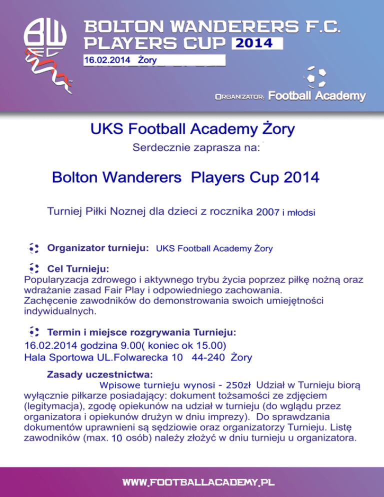 2014 16.02.2014 Żory UKS Football Academy Żory FOOTBALL ACADEMY OPOLE Żory Serdecznie zaprasza na: " Bolton Wanderers „Bolton Wanderers Bolton Wanderers Players Cup 2014 Players Cup 2014" Players Cup 2014 2013” 4 Turniej Piłki Noznej dla dzieci z rocznika 2004 2005 młodszych młodsi 7 i imłodsi Organizator turnieju: FOOTBALL OPOLE UKS FootballACADEMY Academy Żory Cel Turnieju: Popularyzacja zdrowego i aktywnego trybu życia poprzez piłkę nożną oraz wdrażanie zasad Fair Play i odpowiedniego zachowania. Zachęcenie zawodników do demonstrowania swoich umiejętności indywidualnych. Termin i miejsce rozgrywania Turnieju: 21.12.2013 godzina 10:00 sobotaok (zakończenie ok. 16:30) 16.02.2014 godzina 9.00( koniec 15.00) 16.02.2014 godzina 9.00Hala Widowiskowo-Sportowa UL. Folwarecka 10 Hala sportowa Politechniki Opolskiej, OPOLE ul. Prószkowska 76. Hala Sportowa UL.Folwarecka 10 44-240 Żory 44-240 Żory Zasady uczestnictwa: Organizator nie pobiera opłaty wpisowej za- udział. Wpisowe Koszt turnieju uczestnictwa wynosi 250zł Udział w Turnieju biorą wyłącznie piłkarze posiadający: dokument tożsamości ze zdjęciem (legitymacja), zgodę opiekunów na udział w turnieju (do wglądu przez organizatora i opiekunów drużyn w dniu imprezy). Do sprawdzania dokumentów uprawnieni są sędziowie oraz organizatorzy Turnieju. Listę zawodników (max. 10 12 osób) należy złożyć w dniu turnieju u organizatora. 2014 16.02.2014 Żory Regulamin turnieju: - liczba drużyn: 10 2 zespołów (12 10 zawodników + 1 opiekun) - boisko: 40 20 x 25m, - bramki: 3z tyczek x 2m, - czas gry: 12 min, - piłka: rozm 4 super lite, - drużyna: 12 zawodników) + bramkarz), 10 zawodników (w polu 45 zawodników - zmiany: system hokejowy bez przerw w grze, ilość zmian dowolna. - wrzut z autu: poprzez wprowadzenie piłki nogą do gry zanim zostanie wykonane podanie - rzut wolny: każdy rzut wolny jest pośredni - rzut różny: wykonuje się nogą z narożnej linii boiska, - wznowienie gry przez bramkarza: ręką do połowy boiska, lub nogą po obronionym strzale (również tylko do połowy) W Bolton Wanderers Players Cup 2013 2014 wystartuje 10 2 drużyn, grających systemem „każdy z każdym” w dwóch wcześniej wylosowanych grupach. Chcąc uniknąć niezdrowej rywalizacji wywołanej chęcią zdobycia jak najwyższego miejsca, pucharu, często kosztem idei samego szkolenia młodych piłkarzy, rezygnujemy z typowej końcowej klasyfikacji turniejowej (nie prowadzimy punktacji). Pragniemy, aby najmłodsi piłkarze, bez niepotrzebnego stresu związanego ze straconą bramką, popełnionym błędem demonstrowali swoje umiejętności indywidualne. 2014 16.02.2014 Żory Nagrody i puchary: Wszystkie drużyny otrzymają pamiątkowy dyplom, a każdy zawodnik medal niezależnie od osiągniętego wyniku. Wybrani zostaną również najlepsi zawodnicy z każdej drużyny, którzy otrzymają dodatkowe upominki. Spośród wszystkich biorących udział w turnieju zespołów, wybrana zostanie najlepiej i najładniej grająca drużyna, która otrzyma specjalnie przygotowane na tą okazję trofeum - Puchar Graczy Boltonu Organizator zapewnia: - wyżywienie i napoje+ napoje słodki poczęstunek - opiekę medyczną, - uprawnionych sędziów. sędziów - Ubezpiecza startujących lecz nie bierze odpowiedzialności za ewentualne nieszczęśliwe wypadki, - wspaniałą zabawę w klimacie Bolton Wanderers F.C.!, Zgłoszenia: Drużyny należy zgłaszać do31.01.2014 1.12.2013 - decyduje kolejność zgłoszeń Ilość miejsc ograniczona - 10 2 drużyn Zgłoszenia prosimy przesyłać drogą mailową na adres: na adres [email protected] Zapisy ze strony Football Academy Opole zory koordynuje tel 604 142trener 938 Paweł Jędrzejewski. Uwagi: Ewentualne sprawy sporne dotyczące przebiegu turnieju rozstrzyga Organizator po zasięgnięciu opinii trenerów drużyn biorących udział w zawodach. Organizator nie ponosi odpowiedzialności za rzeczy pozostawione w szatni, zastrzega sobie również możliwość zmian w Regulaminie przed rozpoczęciem turnieju i poinformowania o tym wszystkie drużyny. 2014 16.02.2014 Żory Sponsorzy UKS Football Academy Żory Żory 2014 16.02.2014 Żory UKS Football Academy Żory +48 604 142 938 Football Academy [email protected] [email protected] Niedziałkowskiego 16A/1 45-085 Opole Tel : +48 512 803 443 Tel : +48 502 635 835 www.footballacademy.pl [email protected]
