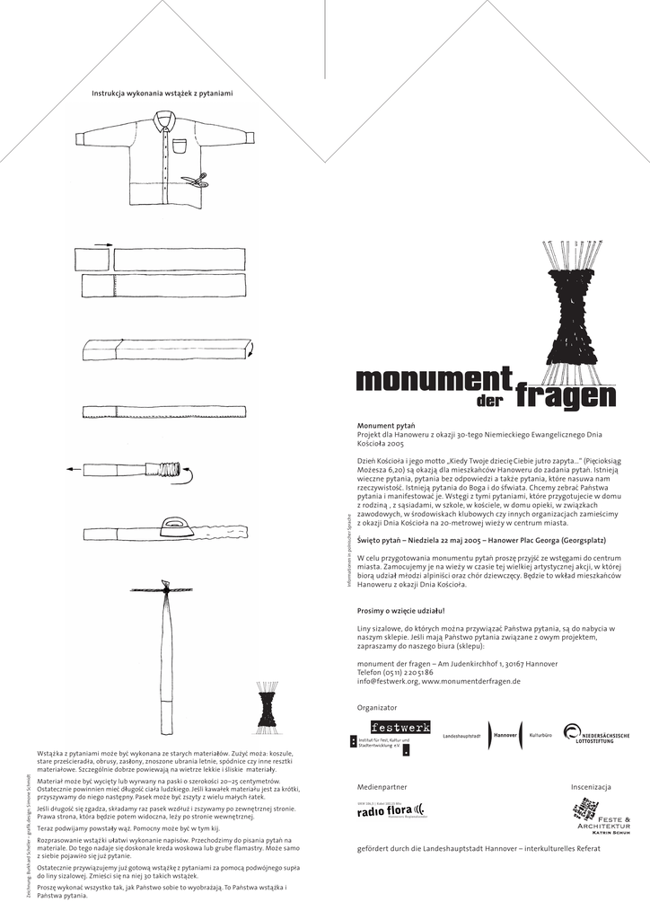 Instrukcja wykonania wsta˛żek z pytaniami Informationen in polnischer Sprache Monument pytań Projekt dla Hanoweru z okazji 30-tego Niemieckiego Ewangelicznego Dnia Kościo a 2005 Dzień Kościo a i jego motto „Kiedy Twoje dziecie˛ Ciebie jutro zapyta…“ (Pie˛cioksia˛g Możesza 6,20) sa˛ okazja˛ dla mieszkańców Hanoweru do zadania pytań. Istnieja˛ wieczne pytania, pytania bez odpowiedzi a także pytania, które nasuwa nam rzeczywistość. Istnieja˛ pytania do Boga i do śfwiata. Chcemy zebrać Państwa pytania i manifestować je. Wste˛ gi z tymi pytaniami, które przygotujecie w domu z rodzina˛ , z sa˛siadami, w szkole, w kościele, w domu opieki, w zwia˛zkach zawodowych, w środowiskach klubowych czy innych organizacjach zamieścimy z okazji Dnia Kościo a na 20-metrowej wieży w centrum miasta. Świe˛ to pytań – Niedziela 22 maj 2005 – Hanower Plac Georga (Georgsplatz) W celu przygotowania monumentu pytań prosze˛ przyjść ze wste˛gami do centrum miasta. Zamocujemy je na wieży w czasie tej wielkiej artystycznej akcji, w której biora˛ udzia m odzi alpiniści oraz chór dziewcze˛cy. Be˛dzie to wk ad mieszkańców Hanoweru z okazji Dnia Kościo a. Prosimy o wzie˛cie udzia u! Liny sizalowe, do których można przywia˛zać Państwa pytania, sa˛ do nabycia w naszym sklepie. Jeśli maja˛ Państwo pytania zwia˛zane z owym projektem, zapraszamy do naszego biura (sklepu): monument der fragen – Am Judenkirchhof 1, 30167 Hannover Telefon (05 11) 2 20 51 86 [email protected], www.monumentderfragen.de Organizator Zeichnung: Burkhard Scheller – grafik.design: Simone Schmidt Wsta˛żka z pytaniami może być wykonana ze starych materia ów. Zużyć moża: koszule, stare prześcierad a, obrusy, zas ony, znoszone ubrania letnie, spódnice czy inne resztki materia owe. Szczególnie dobrze powiewaja˛ na wietrze lekkie i śliskie materia y. Materia może być wycie˛ ty lub wyrwany na paski o szerokości 20–25 centymetrów. Ostatecznie powinnien mieć d ugość cia a ludzkiego. Jeśli kawa ek materia u jest za krótki, przyszywamy do niego naste˛ pny. Pasek może być zszyty z wielu ma ych atek. Medienpartner Inscenizacja Jeśli d ugość sie˛ zgadza, sk adamy raz pasek wzd uż i zszywamy po zewne˛ trznej stronie. Prawa strona, która be˛dzie potem widoczna, leży po stronie wewne˛ trznej. Teraz podwijamy powsta y wa˛ż. Pomocny może być w tym kij. Rozprasowanie wsta˛żki u atwi wykonanie napisów. Przechodzimy do pisania pytań na materiale. Do tego nadaje sie˛ doskonale kreda woskowa lub grube flamastry. Może samo z siebie pojawi o sie˛ już pytanie. Ostatecznie przywia˛zujemy już gotowa˛ wsta˛żke˛ z pytaniami za pomoca˛ podwójnego sup a do liny sizalowej. Zmieści sie˛ na niej 30 takich wsta˛żek. Prosze˛ wykonać wszystko tak, jak Państwo sobie to wyobrażaja˛. To Państwa wsta˛żka i Państwa pytania. gefördert durch die Landeshauptstadt Hannover – interkulturelles Referat
