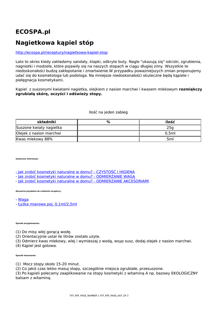 ECOSPA.pl Nagietkowa kąpiel stóp http://ecospa.pl/receptury/nagietkowa-kapiel-stop Lato to okres kiedy zakładamy sandały, klapki, odkryte buty. Nagle "ukazują się" odciski, zgrubienia, nagniotki i modzele, które pojawiły się na naszych stopach w ciągu długiej zimy. Wszystkie te niedoskonałości budzą zakłopotanie i zmartwienie.W przypadku poważniejszych zmian proponujemy udać się do kosmetologa lub podologa. Na mniejsze niedoskonałości skuteczne będą kąpiele i pielęgnacja kosmetykami. Kąpiel z suszonymi kwiatami nagietka, olejkiem z nasion marchwi i kwasem mlekowym rozmiękczy zgrubiałą skórę, oczyści i odświeży stopy. Ilość na jeden zabieg składniki % ilość Suszone kwiaty nagietka 25g Olejek z nasion marchwi 0,5ml Kwas mlekowy 88% 5ml Użyteczne informacje: - Jak zrobić kosmetyki naturalne w domu? - CZYSTOŚĆ I HIGIENA - Jak zrobić kosmetyki naturalne w domu? - ODMIERZANIE WAGĄ - Jak zrobić kosmetyki naturalne w domu? - ODMIERZANIE AKCESORIAMI Akcesoria przydatne do zrobienia receptury: - Waga - Łyżka miarowa poj. 0,1ml/2,5ml Sposób przygotowania: (1) (2) (3) (4) Do misy wlej gorącą wodę. Orientacyjnie ustal ile litrów zostało użyte. Odmierz kwas mlekowy, wlej i wymieszaj z wodą, wsyp susz, dodaj olejek z nasion marchwi. Kąpiel jest gotowa. Sposób stosowania: (1) Mocz stopy około 15-20 minut. (2) Co jakiś czas lekko masuj stopy, szczególnie miejsca zgrubiałe, przesuszone. (3) Po kąpieli polecamy zaaplikowanie na stopy kosmetyki z witaminą A np. bazowy EKOLOGICZNY balsam z witaminą. TXT_PDF_PAGE_NUMBER 1 TXT_PDF_PAGE_OUT_OF 2 Przechowywanie stosowanie termin przydatności zużyj całą porcję na raz 2-3 razy w tygodniu jednorazowe użycie TXT_PDF_PAGE_NUMBER 2 TXT_PDF_PAGE_OUT_OF 2