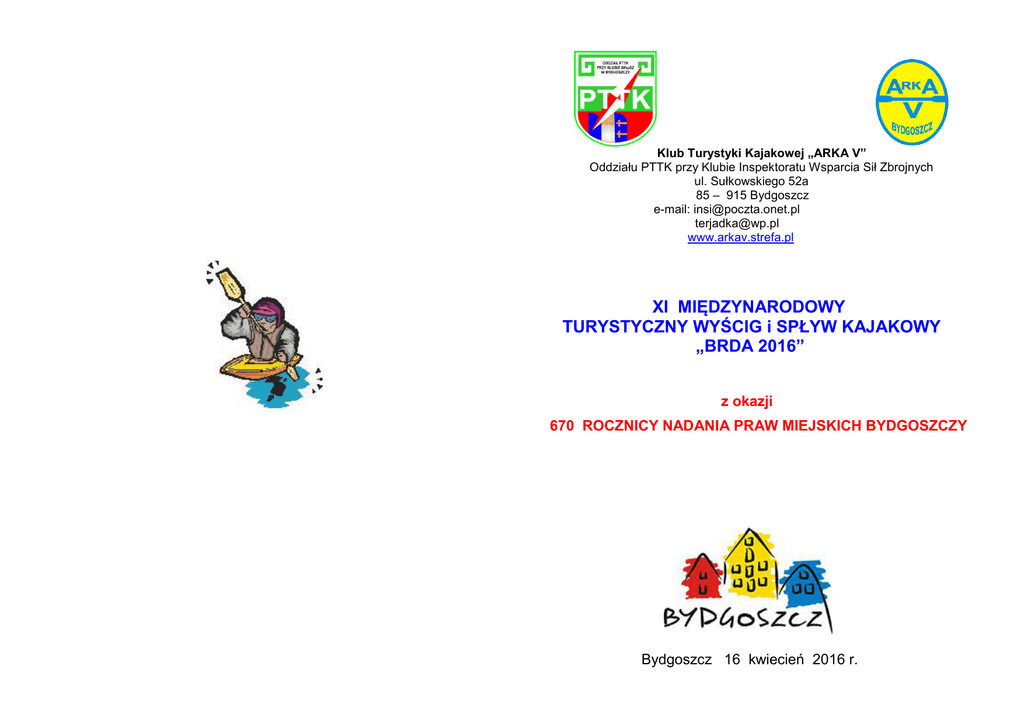 Klub Turystyki Kajakowej „ARKA V” Oddziału PTTK przy Klubie Inspektoratu Wsparcia Sił Zbrojnych ul. Sułkowskiego 52a 85 – 915 Bydgoszcz e-mail: [email protected] [email protected] www.arkav.strefa.pl XI MIĘDZYNARODOWY TURYSTYCZNY WYŚCIG i SPŁYW KAJAKOWY „BRDA 2016” z okazji 670 ROCZNICY NADANIA PRAW MIEJSKICH BYDGOSZCZY Bydgoszcz 16 kwiecień 2016 r. WSPÓŁORGANIZATORZY: WSPÓŁORGANIZATORZY: POLICEALNE SZKOŁY COSINUS Urząd Miasta Bydgoszczy Zespół Szkół Nr 29 Bydgoszcz Kujawsko – Pomorski Związek Kajakowy Centrum Tańca GABI PAŁAC MŁODZIEŻY – UKS „KOPERNIK” Bydgoszcz TEB Edukacja – szkoły policealne CENTRUM GALANTERII SKÓRZANEJ I BAGAŻU Bydgoszcz www.marwal.pl Sunrisesystem – pozycjonowanie stron WWW PRODUCENT KAJAKÓW www.gokajak.com Pepsi - Cola General Bottlers Sp. z o. o. KOMITET ORGANIZACYJNY: Teresa Kaczmarek Maciej Juhnke Piotr Paradowski Marek Lubiszewski Adam Nawrotek - Prezes Klubu Turystyki Kajakowej” ARKA V” V-ce Prezes Klubu Turystyki Kajakowej „ARKA V” Klub Turystyki Kajakowej „ARKA V” Klub Turystyki Kajakowej „ARKA V” Klub Turystyki Kajakowej „ARKA V” tel. 505 661 399 tel. 602 408 996 tel. 571 312 425 tel. 601 835 455 tel. 698 656 528 KIEROWNICTWO IMPREZY TURYSTYCZNEJ: Komandor - Pilot początkowy: Sędzia główny : Sędziowie: Sekretariat: Kwatermistrz: Pilot końcowy; Marek Lubiszewski Teresa Kaczmarek Andrzej Zaremba Zofia Nowak Danuta Plewa Magdalena Pabisek Alicja Kodzik Andrzej Krysiak Adam Nawrotek Piotr Paradowski - Przodownik Turystyki Kajakowej - Sędzia kl. zw. - Sędzia kl. zw. - Sędzia kl. zw. - Sędzia kl. okr. KTKaj „ARKA V” - KTKaj „ARKA V” - KTKaj. „ARKA V” - KTKaj. „ARKA V” - KTKaj. „ ARKA V” - KTKaj. „ ARKA V” XI MIĘDZYNARODOWY TURYSTYCZNY WYŚCIG I SPŁYW KAJAKOWY „BRDA 2016” I. Cel i zadania spływu: - popularyzacja turystyki kajakowej jako formy aktywnego wypoczynku, - promocja Miasta Bydgoszczy, - uczestnictwo w obchodach 670 rocznicy nadania praw miejskich Bydgoszczy, - zapoznanie uczestników z walorami rzeki Brdy, II. Data i trasa imprezy: Bydgoszcz, dnia 16 kwietnia 2016 r. Przystań Wodna UKS „Kopernik” Pałac Młodzieży ul. Babia Wieś – Wyspa Młyńska - przystań KTKaj „ARKA V” ul. Witebska 4 dł. 13 km III. Warunki uczestnictwa: 1. W imprezie mogą brać udział turyści indywidualni, zrzeszeni i niezrzeszeni. 2. W imprezie mogą brać udział osoby pełnoletnie, młodzież niepełnoletnia pod opieką osoby dorosłej, o dobrym stanie zdrowia, posiadające umiejętności pływania, nie uprawiające czynnie sportu wyczynowego i na sprzęcie turystycznym. 3. Uczestnicy imprezy startują na własną odpowiedzialność, za ewentualne straty i szkody Kierownictwo nie bierze odpowiedzialności 4. Uczestnicy dokonują zgłoszenia na odpowiednich drukach – kartach zgłoszeń i składają oświadczenia o odpowiedzialności za osobę niepełnoletnią ( wg załączników nr 1 i 2 ) 5. Zgłoszenia należy przesłać na adres drogą elektroniczną; e-mail: [email protected] lub pisemnie KTKaj „ARKA V” Oddziału PTTK przy Klubie IWspSZ ul. Sułkowskiego 52a 85-915 Bydgoszcz z dopiskiem „kajaki” w terminie nie przekraczalnym do dnia 11.04.2016 roku. 6. Koszt uczestnictwa w imprezie wynosi: dzieci do lat 12 – 20,00 zł; dorośli - 40,00 zł od osoby. Opłaty należy dokonać na konto : PTTK Oddział przy Klubie IWspSZ ul. Sułkowskiego 52a 85 - 915 Bydgoszcz nr: 20 1020 1462 0000 7202 0125 5363 z dopiskiem „kajaki” 7. W razie nie przybycia na start na imprezę lub rezygnację 7 dni przed rozpoczęciem imprez – wpisowe nie podlega zwrotowi. 8. W przypadku wnoszenia opłaty w dniu imprezy pobierana będzie opłata w wysokości 5 zł od zgłoszonej osoby. IV. Sprzęt Uczestnicy biorą udział w imprezie na własnym sprzęcie (kajaki, kamizelki asekuracyjne), ponoszą pełną odpowiedzialność za poziom techniczny posiadanego sprzętu. Istnieje możliwość wypożyczenia kajaków od organizatora za opłatą 10 zł od osoby, decyduje kolejność zgłoszeń. V. Konkurencje: K-1 K-1 K-2 K-2 K-2 Kobiet Mężczyzn Kobiet Mężczyzn Mix VI. Program spływu i wyścigu: 9.00 – 10.00 - weryfikacja uczestników, przygotowanie sprzętu / Przystań Wodna UKS Kopernik 10.30 - uroczystość otwarcia XI Międzynarodowego Turystycznego Wyścigu i Spływu 11.30 11.40 14.00 13.00 14.30 - start wyścigu kajaków K – 1; K – 2 - start spływu - zamknięcie mety spływu i wyścigu w Brdyujściu Przystań KTKaj. „ARKA V” - gorący posiłek na przystani klubowej Brdyujście / ul. Witebska 4 / - uroczyste zakończenie imprezy i wręczenie nagród dla uczestników imprezy. VII. Nagrody w wyścigu i spływie kajakowym w konkurencjach indywidualnych Organizator przewiduje medale, puchary, dyplomy, nagrody rzeczowe. VIII. Obowiązki uczestnika spływu i wyścigu: - podporządkowanie się zarządzeniom kierownictwu imprezy - przestrzeganie regulaminu imprezy - zakaz spożywania alkoholu w czasie imprezy - wszyscy uczestnicy spływu i wyścigu płyną obowiązkowo w kamizelce asekuracyjnej, IX. Organizator w ramach wpisowego zapewnia: - ubezpieczenie NW - asekurację na wodzie i obsługę ratowniczą - wklejki TOK - gorący posiłek, napoje i gadżety Zgłaszający ponosi pełną odpowiedzialność za stan zdrowia oraz umiejętności pływackie. INFORMATOR Nie zwlekaj ze zgłoszeniem, zgłoś się już dziś , impreza będzie jak zawsze udana i wspaniała dzięki Twojej obecności na pięknym szlaku wodnym rzeki Brdy. REGULAMIN