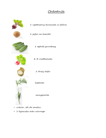 Chłodnik 1 ugotowany buraczek w skórce 1 jajko na twardo 1 ogórek gruntowy 2-3 rzodkiewki 1 duży kefir koperek szczypiorek • cukier, sól do smaku, • 1 łyżeczka octu winnego 1. Buraczki obrać ze skórki i utrzeć na tarce 2. ogórki obrać i pokroić w cienkie plasterki 3. rzodkiewkę i jajko pokroić w kosteczkę 4. koperek i szczypiorek posiekać 5. wszystkie składniki wrzucić do miski, zalać kefirem i dodać przyprawy do smaku ( chłodnik powinien być winno – słodki) 6. Schłodzić w lodówce i jeść z ugotowanymi młodymi ziemniaczkamiposypanymi koperkiem Życzymy smacznego !!!