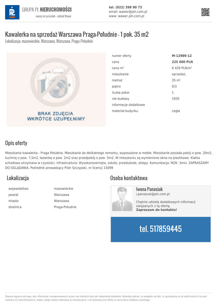 tel. (022) 398 90 73 email: [email protected] www: wawer.pln.com.pl Kawalerka na sprzedaż Warszawa Praga-Południe - 1 pok. 35 m2 Lokalizacja: mazowieckie, Warszawa, Warszawa, Praga-Południe numer oferty M-12989-12 cena 225 000 PLN cena m 6 429 PLN/m2 mieszkanie sprzedaż, metraż 35 m2 piętro 0/3 liczba pokoi 1 rok budowy 1935 2 informacje dodatkowe materiał budynku cegła Opis oferty Mieszkanie kawalerka - Praga Południe. Mieszkanie do delikatnego remontu, wyposażone w meble. Mieszkanie posiada pokój o pow. 20m2, kuchnię o pow. 7,5m2, łazienkę o pow. 2m2 oraz przedpokój o pow. 5m2. W mieszkaniu są wymienione okna na plastikowe. Klatka schodowa utrzymana w czystości. Infrastruktura: Wysokorozwinięta, szkoła, przedszkole, sklepy. Komunikacja: MZK- 3min. ZAPRASZAMY DO OGLĄDANIA. Pośrednik prowadzący Piotr Szczypski, nr licencji 15099 Lokalizacja Osoba kontaktowa Iwona Panasiuk województwo mazowieckie powiat Warszawa [email protected] miasto Warszawa dzielnica Praga-Południe Chętnie udzielę dodatkowych informacji związanych z tą ofertą. Zapraszam do kontaktu! tel. 517859445 Zawsze dążymy do tego, aby informacje o proponowanych przez nas ofertach były jak najbardziej dokładne. Niekiedy jednak, ze względu na fakt, iż uzyskujemy je od osób trzecich nie jest możliwe ich zweryfikowanie, wobec czego należy traktować je orientacyjnie i nie stanowią one oferty w rozumieniu kodeksu cywilnego.