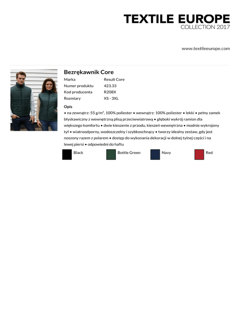 Bezrękawnik Core Marka Result Core Numer produktu 423.33 Kod producenta R208X Rozmiary XS - 3XL Opis • na zewnątrz: 55 g/m², 100% poliester • wewnątrz: 100% poliester • lekki • pełny zamek błyskawiczny z wewnętrzną plisą przeciwwiatrową • głęboki wykrój ramion dla większego komfortu • dwie kieszenie z przodu, kieszeń wewnętrzna • modnie wykrojony tył • wiatroodporny, wodoszczelny i szybkoschnący • tworzy idealny zestaw, gdy jest noszony razem z polarem • dostęp do wykonania dekoracji w dolnej tylnej części i na lewej piersi • odpowiedni do haftu Black Bottle Green Navy Red
