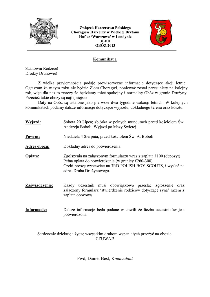 Związek Harcerstwa Polskiego Chorągiew Harcerzy w Wielkiej Brytanii Hufiec ‘Warszawa’ w Londynie 3LDH OBÓZ 2013 Komunikat 1 Szanowni Rodzice! Drodzy Druhowie! Z wielką przyjemnością podaję prowizoryczne informacje dotyczące akcji letniej. Ogłaszam że w tym roku nie będzie Zlotu Chorągwi, ponieważ został przesunięty na kolejny rok, więc dla nas to znaczy że będziemy mieć spokojny i normalny Obóz w gronie Drużyny. Przecież takie obozy są najfajniejsze! Daty na Obóz są ustalone jako pierwsze dwa tygodnie wakacji letnich. W kolejnych komunikatach podamy dalsze informacje dotyczące wyjazdu, dokładnego terenu oraz kosztu. Wyjazd: Sobota 20 Lipca; zbiórka w pełnych mundurach przed kościołem Św. Andrzeja Boboli. Wyjazd po Mszy Swiętej. Powrót: Niedziela 4 Sierpnia; przed kościołem Św. A. Boboli Adres obozu: Dokładny adres do potwierdzenia. Opłata: Zgołszenia na załączonym formularzu wraz z zapłatą £100 (depozyt) Pełna opłata do potwierdzenia (w granicy £260-300) Czeki proszę wystawiać na 3RD POLISH BOY SCOUTS, i wysłać na adres Druha Drużynowego. Zaświadczenie: Każdy uczestnik musi obowiązkowo przesłać zgłoszenie oraz załączony formularz ‘stwierdzenie rodziców dotyczące syna’ razem z zapłatą obozową. Informacje: Dalsze informacje będa podane w chwili że liczba uczestników jest potwierdzona. Serdecznie dziękuję i życzę wszystkim druhom wspaniałych przeżyć na obozie. CZUWAJ! Pwd, Daniel Best, Komendant Ekwipunek na obóz letni Umundurowanie: Koszula Szorty Mundurowe Skarpety Pas Harcerski Buty do marszu Beret Chusta drużyny W Plecaku: Śpiwór Dymak (Materac dmuchany) Brezent (Groundsheet) Karimat 2 sznury po 12.5 m każdy (sash cord) Strój polowy (combats, panterka, buty do marszu) 2 pary combats / spodni 2 ciepłe swetery / sweat shirt 1 ciepła kurtka nieprzemakalna 4 pary grubych wełnianych skarpet 7 zmian bielizny 4 koszulki Strój sportowy (szorty, sweat shirt,T-shirt, tenisówki) Pasta i szczotka do zębów Mydło, szampon do włosów 2 średniego rozmiaru ręczniki Kąpielówki Worek na brudną bieliznę Menażki eccuzzS Kubek ezrSicS Igły, nici, guziki, agrafki eczczccStrtsSpcStaztouczS ySsrSit rpczSP, znaczki i koperty euStcSSt zcrzS Latarka W Chlebaku: Apteczka Chustki do nosa Notes, pióro, ołówek Kompas Śpiewnik harcerski Scyzoryk Vaseline Wszystkie rzeczy powinny być oznaczone nazwiskiem harcerza i porządnie spakowane. Zachęcamy, aby harcerz zabrał ze sobą: □ instrumenty muzyczne □ aparat □ lornetkę □ polskie książki 3LDH ZGŁOSZENIE NA OBÓZ 2013. Imię i nazwisko: ........................................................................ Data Urodzenia: ........................................................................ Adres: ........................................................................................ ....................................................................................... ....................................................................................... Email: ...................................................................................... ........................................................................................ Telefon Domowy: ................................................................... Telefon Komórkowy: .............................................................. ............................................................. Stopień: .................................................................................. Załączam zadatek w wysokości £ : .......................................................................... Pozwalam synowi brać udział na Obozie: Podpis: ................................................................................ Data: ................................................................................... Stwierdzenie Rodziców Dotyczące Syna (Wszelkie podane informacje są ściśle poufne) Nazwisko ................................................... Imię ..............................Data Urodzenia……………………. Czy syn ma przepisane jakieś lekarstwa, które powinien zazywać podczas obozu? Tak □ Nie □ Jeżeli ‘Tak’, to prosze podać szczególy: ....................................................................................................................................................................... ..................................................................................................................................................................... ……………………………………………………………………………………………………………... Chłopcom nie wolno mieć przy sobie lekarstw. Lekarstwa należy przed wyjazdem oddać komendantowi, który dopilnuje odpowiedniogo zażywania. Na opakowaniu ma być zaznaczone imię i nazwisko chłopca dawka leku oraz instrukcje dotyczące odpowiedniego spożycia. Czy syn choruje pordczas podróży? Czy syn chorował lub choruje na asthmę? Czy syn bierze lekarstwa na astmę? Czy syn ma jakieś uczulenia / alergie? Proszę podać szczegóły ..................................................... Tak Tak Tak Tak Nie Nie Nie Nie Czy syn był szczepiony przeciw tężcowi (anti-tetanus) Tak Nie Proszę podać datę ostatniego szczepienia ................................ Proszę ZAŁĄCZYĆ spis wszystkich odbytych szczepień oraz ich daty. Adres wakacjyny rodziców (podczas obozu) Telefon ........................................................................ ....................................................................... ............................. Imię i Nazwisko Lekarza : ..................................................... Adres przychodni lekarskiej: ................................................................................... ................................................................................... Telefon ...................