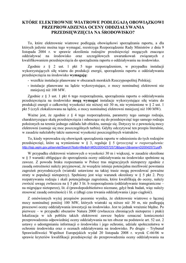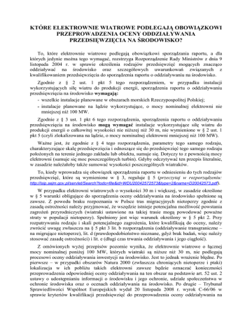 KTÓRE ELEKTROWNIE WIATROWE PODLEGAJĄ OBOWIĄZKOWI PRZEPROWADZENIA OCENY ODDZIAŁYWANIA PRZEDSIĘWZIĘCIA NA ŚRODOWISKO? To, które elektrownie wiatrowe podlegają obowiązkowi sporządzania raportu, a dla których jedynie moŜna tego wymagać, rozstrzyga Rozporządzenie Rady Ministrów z dnia 9 listopada 2004 r. w sprawie określenia rodzajów przedsięwzięć mogących znacząco oddziaływać na środowisko oraz szczegółowych uwarunkowań związanych z kwalifikowaniem przedsięwzięcia do sporządzenia raportu o oddziaływaniu na środowisko. Zgodnie z § 2 ust. 1 pkt 5 tego rozporządzeniem, w przypadku instalacji wykorzystujących siłę wiatru do produkcji energii, sporządzenia raportu o oddziaływaniu przedsięwzięcia na środowisko wymagają: - wszelkie instalacje planowane w obszarach morskich Rzeczypospolitej Polskiej; - instalacje planowane na lądzie wykorzystujące, o mocy nominalnej elektrowni nie mniejszej niŜ 100 MW. Zgodnie z § 3 ust. 1 pkt 6 tego rozporządzenia, sporządzenia raportu o oddziaływaniu przedsięwzięcia na środowisko mogą wymagać instalacje wykorzystujące siłę wiatru do produkcji energii o całkowitej wysokości nie niŜszej niŜ 30 m, nie wymienione w § 2 ust. 1 pkt 5 (czyli zlokalizowana na lądzie, o mocy nominalnej elektrowni mniejszej niŜ 100 MW). WaŜne jest, Ŝe zgodnie z § 4 tego rozporządzenia, parametry tego samego rodzaju, charakteryzujące skalę przedsięwzięcia i odnoszące się do przedsięwzięć tego samego rodzaju połoŜonych na terenie jednego zakładu lub obiektu, sumuje się. Dotyczy to z pewnością mocy elektrowni (sumuje się moc poszczególnych turbin). Gdyby odczytywać ten przepis literalnie, w zasadzie naleŜałoby takŜe sumować wysokości poszczególnych wiatraków. To, kiedy wprowadza się obowiązek sporządzenia raportu w odniesieniu do tych rodzajów przedsięwzięć, które są wymienione w § 3, reguluje § 5 (przeczytaj w rozporządzeniu: http://isip.sejm.gov.pl/servlet/Search?todo=file&id=WDU20042572573&type=2&name=D20042573.pdf). W przypadku elektrowni wiatrowych o wysokości 30 m i większej, w zasadzie określone w § 5 warunki obligujące do sporządzenia oceny oddziaływania na środowisko spełnione są zawsze. Z powodu braku rozpoznania w Polsce tras migracyjnych nietoperzy zgodnie z zasadą ostroŜności naleŜy przyjmować, Ŝe wszędzie istnieje potencjalna moŜliwość powstania zagroŜeń przyrodniczych (wiatraki ustawione na takiej trasie mogą powodować powaŜne straty w populacji nietoperzy). Spełniony jest więc warunek określony w § 5 pkt 2. Przy rozpatrywaniu rodzaju i skali potencjalnego zagroŜenia, które kwalifikują do oceny, naleŜy zwrócić uwagę zwłaszcza na § 5 pkt 3 lit. b rozporządzenia (oddziaływanie transgraniczne – na migrujące nietoperze), lit. d (prawdopodobieństwo nieznane, gdyŜ brak badań, więc naleŜy stosować zasadę ostroŜności) i lit. e (długi czas trwania oddziaływania i jego ciągłość). Z omówionych wyŜej przepisów pozornie wynika, Ŝe elektrownie wiatrowe o łącznej mocy nominalnej poniŜej 100 MW, których wiatraki są niŜsze niŜ 30 m, nie podlegają procesowi oceny oddziaływania inwestycji na środowisko. Jest to jednak wraŜenie błędne. Po pierwsze – w przypadki obszarów Natura 2000 (zwłaszcza chroniących nietoperze i ptaki) lokalizacja w ich pobliŜu takich elektrowni zawsze będzie oznaczać konieczności przeprowadzenia odpowiedniej oceny oddziaływania na ten obszar na podstawie art. 52 ust. 2 ustawy o udostępnianiu informacji o środowisku i jego ochronie, udziale społeczeństwa w ochronie środowiska oraz o ocenach oddziaływania na środowisko. Po drugie – Trybunał Sprawiedliwości Wspólnot Europejskich wydał 20 listopada 2008 r. wyrok C-66/06 w sprawie kryteriów kwalifikacji przedsięwzięć do przeprowadzenia oceny oddziaływania na środowisko. Uznał w nim, Ŝe system kwalifikacji przedsięwzięć do przeprowadzenia oceny oddziaływania na środowisko oparty na progach wielkości przedsięwzięcia jest sprzeczny z prawem UE, a więc niedopuszczalny. Nie moŜna więc np. rezygnować z wykonania oceny oddziaływania na środowisko elektrowni wiatrowej jedynie na podstawie jej maksymalnej mocy czy wysokości wiatraków, jeśli przesłanki merytoryczne wskazują, Ŝe moŜe ona stanowić zagroŜenie dla chronionych walorów przyrodniczych (np. nietoperzy). Wyrok Trybunału ma pierwszeństwo przed prawem krajowym. Poza tym naleŜy teŜ zwrócić uwagę na rezolucję 5.6 Porozumienia EUROBATS. Co prawda nie obowiązuje ona w Polsce bezpośrednio, ale nasze państwo jest stroną tego Porozumienia, więc nasze organy powinny przyjmować taką interpretację przepisów i praktykę ich stosowania, aby wypełniać jego postanowienia. Powinny więc przyjmować, Ŝe badanie oddziaływania na nietoperze takŜe niŜszych wiatraków jest zawsze konieczne. Wszak zagroŜenia powodowane przez niŜsze turbiny często mogą być większe niŜ w przypadku tych wysokich. (09.02.09, A. Kepel, PTOP „Salamandra”: opracowanie robocze, na potrzeby organów ochrony przyrody i POE)