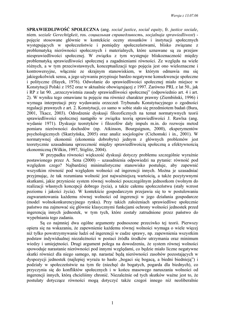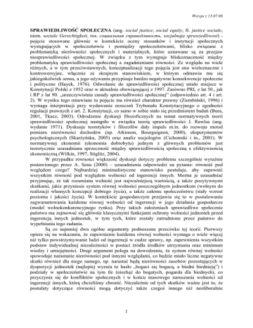 Wersja z 13.07.06 SPRAWIEDLIWOŚĆ SPOŁECZNA (ang. social justice, social equity, fr. justice sociale, niem. soziale Gerechtigkeit, ros. cоциальная справедливость, socjalnaja sprawiedliwost) pojęcie stosowane głównie w kontekście oceny stosunków i instytucji społecznych występujących w społeczeństwie i pomiędzy społeczeństwami, blisko związane z problematyką nierówności społecznych i materialnych, które uznawane są za przejaw niesprawiedliwości społecznej. W związku z tym występuje bliskoznaczność między problematyką sprawiedliwości społecznej a zagadnieniami równości. Ze względu na wiele różnych, a w tym przeciwstawnych, konceptualizacji tego pojęcia jest ono wieloznaczne i kontrowersyjne, włącznie ze skrajnym stanowiskiem, w którym odmawia mu się jakiegokolwiek sensu, a jego używaniu przypisuje bardzo negatywne konsekwencje społeczne i polityczne (Hayek, 1976). Odwołanie do sprawiedliwości społecznej miało miejsce w Konstytucji Polski z 1952 oraz w aktualnie obowiązującej z 1997. Zarówno PRL z lat 50., jak i RP z lat 90. „urzeczywistnia zasady sprawiedliwości społecznej” (odpowiednio art. 4 i art. 2). W wyniku tego omawiane tu pojęcie ma również charakter prawny (Ziembiński, 1996) i wymaga interpretacji przy wydawaniu orzeczeń Trybunału Konstytucyjnego o zgodności regulacji prawnych z art. 2. Konstytucji, co samo w sobie stało się przedmiotem badań (Bura, 2001, Tkacz, 2003). Odrodzenie dyskusji filozoficznych na temat normatywnych teorii sprawiedliwości społecznej nastąpiło w związku teorią sprawiedliwości J. Rawlsa (ang. wydanie 1971). Dyskusje teoretyków i filozofów dały impuls m.in. do rozwoju metod pomiaru nierówności dochodów (np. Atkinson, Bourguignon, 2000), eksperymentów psychologicznych (Skarżyńska, 2005) oraz analiz socjologów (Cichomski i in., 2001). W normatywnej ekonomii (ekonomia dobrobytu) jednym z głównych problemów jest teoretycznie uzasadniana sprzeczność między sprawiedliwością społeczną a efektywnością ekonomiczną (Wilkin, 1997, Stiglitz, 2004). W przypadku równości większość dyskusji dotyczy problemu szczególnie wyraźnie postawionego przez A. Sena (2000) – uzasadnienia odpowiedzi na pytanie: równość pod względem czego? Najbardziej minimalistyczne stanowisko postuluje, aby zapewnić wszystkim równość pod względem wolności od ingerencji innych. Można je uzasadniać przyjmując, że tak rozumiana wolność jest najważniejszą wartością, a także pozytywnymi skutkami, jakie przyniesie system równej wolności poszczególnym jednostkom (wolnym do realizacji własnych koncepcji dobrego życia), a także całemu społeczeństwu (stały wzrost poziomu i jakości życia). W kontekście gospodarczym przejawia się to w postulowaniu zagwarantowania każdemu równej wolności od ingerencji w jego działania gospodarcze (model wolnokonkurencyjnego rynku). Przy takich założeniach sprawiedliwe społecznie państwo ma zajmować się głównie klasycznymi funkcjami ochrony wolności jednostek przed ingerencją innych jednostek, w tym tych, które zostały zatrudnione przez państwo do wypełniania tego zadania. Są co najmniej dwa ogólne argumenty podnoszone przeciwko tej teorii. Pierwszy opiera się na wskazaniu, że zapewnienie każdemu równej wolności wymaga o wiele więcej niż tylko powstrzymywanie ludzi od ingerencji w cudze sprawy, np. zapewnienia wszystkim podstaw indywidualnej niezależności w postaci źródła środków utrzymania oraz minimum wiedzy i umiejętności. Drugi argument polega na dowodzeniu, że system równej wolności spowoduje narastanie nierówności pod innymi względami, co będzie miało liczne negatywne skutki również dla niego samego, np. narastać będą nierówności zasobów pozostających w dyspozycji jednostek (najlepiej wyraża to hasło „bogaci się bogacą, a biedni biednieją”) i podziały w społeczeństwie na tym tle (niechęć do bogatych, pogarda dla biednych), co przyczynia się do konfliktów społecznych i w końcu masowego naruszania wolności od ingerencji innych, którą chcieliśmy chronić. Niezależnie od tych skutków ważne jest to, że postulaty dotyczące równości mogą dotyczyć także czegoś innego niż neoliberalnie 1 Wersja z 13.07.06 rozumiana wolność, np. pewnych rodzajów zasobów (R. Dworkin), dóbr (J. Rawls), możliwości wyboru sposobu życia (A. Sen i jego pojęcie capabilities). Teoria J. Rawlsa zasługuje na krótkie przedstawienie ze względu na jej znaczenie w odnowieniu zainteresowania ogólnymi teoriami sprawiedliwości. Składała się ona z trzech hierarchicznie podporządkowanych zasad (Rawls, 1994, 1998): 1) podstawowe dobra i wolności powinny być równe dla wszystkich przy zachowaniu autentycznych praw politycznych, 2) stanowiska dające władzę nad innymi powinny być równie dostępne dla wszystkich w warunkach autentycznej równości szans, 3) nierówności są tylko wtedy uzasadnione, gdy w największym stopniu zwiększają udział w dobrach podstawowych jednostek będących w najgorszej sytuacji. W razie konfliktu zaleceń wynikających z tych zasad, pierwszeństwo należy dawać najpierw pierwszej, a potem drugiej. Podkreślanie autentyczności praw politycznych i równości szans związane jest ze stanowiskiem, że samo formalne przyznanie pewnych praw nie jest wystarczające dla zapewnienia sprawiedliwości społecznej. Państwa w związku z prawami obywateli mają co najmniej trzy obowiązki: nienaruszania tych praw, chronienia obywateli przed naruszaniem ich praw przez trzecią stronę oraz ich realizacji poprzez skutecznie działające instytucje. Rawls wyprowadził swoją teorię z hipotetycznej sytuacji, w której racjonalne osoby mają wynegocjować zasady sprawiedliwego społeczeństwa, nie wiedząc przy tym, jaką pozycję w nim zajmą (umowa społeczna za zasłoną niewiedzy). Jak wspomniano, teoria ta wywołała ożywioną dys