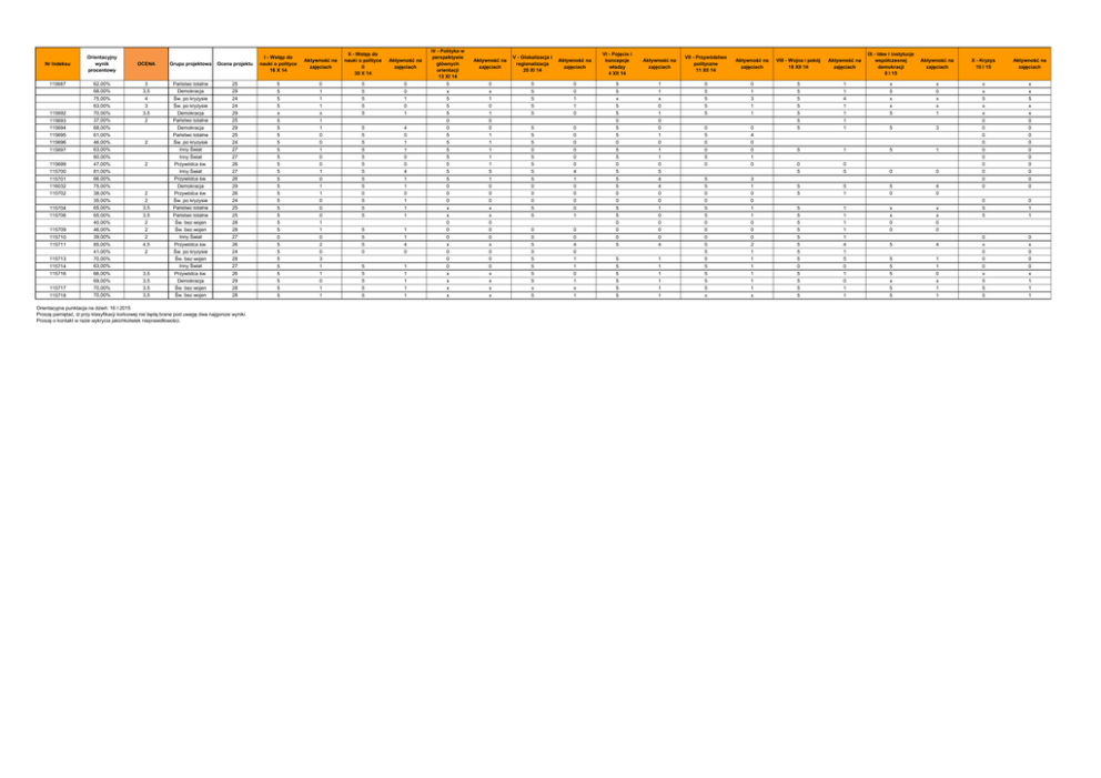 Nr Indeksu 115687 115692 115693 115694 115695 115696 115697 115699 115700 115701 116032 115702 115704 115706 115709 115710 115711 115713 115714 115716 115717 115718 Orientacyjny wynik procentowy 62,00% 68,00% 75,00% 63,00% 70,00% 37,00% 68,00% 61,00% 46,00% 63,00% 60,00% 47,00% 81,00% 66,00% 75,00% 38,00% 35,00% 65,00% 65,00% 40,00% 46,00% 39,00% 85,00% 41,00% 70,00% 63,00% 66,00% 69,00% 70,00% 70,00% OCENA Grupa projektowa Ocena projektu I - Wstęp do nauki o polityce 16 X 14 3 3,5 4 3 3,5 2 Państwo totalne Demokracja Św. po kryzysie Św. po kryzysie Demokracja Państwo totalne Demokracja Państwo totalne Św. po kryzysie Inny Świat Inny Świat Przywódca św. Inny Świat Przywódca św. Demokracja Przywódca św. Św. po kryzysie Państwo totalne Państwo totalne Św. bez wojen Św. bez wojen Inny Świat Przywódca św. Św. po kryzysie Św. bez wojen Inny Świat Przywódca św. Demokracja Św. bez wojen Św. bez wojen 25 29 24 24 29 25 29 25 24 27 27 26 27 26 29 26 24 25 25 28 28 27 26 24 28 27 26 29 28 28 5 5 5 5 x 5 5 5 5 5 5 5 5 5 5 5 5 5 5 5 5 0 5 5 5 5 5 5 5 5 2 2 2 2 3,5 3,5 2 2 2 4,5 2 3,5 3,5 3,5 3,5 Orientacyjna punktacja na dzień: 16 I 2015 Proszę pamiętać, iż przy klasyfikacji końcowej nie będą brane pod uwagę dwa najgorsze wyniki. Proszę o kontakt w razie wykrycia jakichkolwiek nieprawidłowości. Aktywność na zajęciach 0 1 1 1 x 1 1 0 0 1 0 0 1 0 1 1 0 0 0 1 1 0 2 0 3 1 1 0 1 1 II - Wstęp do nauki o polityce II 30 X 14 Aktywność na zajęciach 5 5 5 5 5 0 0 1 0 1 5 5 5 5 5 5 5 5 5 0 5 5 5 4 0 1 1 0 0 4 1 1 0 1 1 1 5 5 5 0 1 1 4 0 5 5 5 5 5 1 1 1 1 1 IV - Polityka w perspektywie głównych orientacji 13 XI 14 Aktywność na zajęciach 5 x 5 5 5 0 0 5 5 5 5 5 5 5 0 0 0 x x 0 0 0 x 0 0 0 x x x x 0 x 1 0 1 0 0 1 1 1 1 1 5 1 0 0 0 x x 0 0 0 x 0 0 0 x x x x V - Globalizacja i regionalizacja 20 XI 14 Aktywność na zajęciach 5 5 5 5 5 0 0 1 1 0 5 5 5 0 5 5 5 5 0 0 0 5 5 0 0 0 0 0 0 4 1 0 0 0 0 1 0 0 5 0 5 5 5 5 x 5 0 0 4 0 1 1 0 1 x 1 VI - Pojęcie i koncepcje władzy 4 XII 14 Aktywność na zajęciach 5 5 x 5 5 0 5 5 0 5 5 0 5 5 5 0 0 5 5 0 0 0 5 1 1 x 0 1 0 0 1 0 1 1 0 5 4 4 0 0 1 0 0 0 0 4 5 5 5 5 5 5 1 1 1 1 1 1 IX - Idee i instytucje współczesnej demokracji 8 I 15 Aktywność na zajęciach X - Kryzys 15 I 15 Aktywność na zajęciach 1 1 4 1 1 1 1 x 5 x x 5 x 0 x x 1 5 3 5 1 5 1 0 5 0 5 0 0 5 5 5 1 5 0 4 0 x x 5 x x 0 0 0 0 0 0 0 0 0 0 x x 5 x x 0 0 0 0 0 0 0 0 0 0 5 5 5 5 5 5 5 5 0 5 5 5 5 1 1 1 1 1 4 1 5 0 1 0 1 1 x x 0 0 x x 0 0 0 5 5 0 1 1 5 4 5 5 5 x 5 5 1 1 0 x 1 1 0 x 0 0 0 x 5 5 5 0 x 0 0 0 x 1 1 1 VII - Przywództwo polityczne 11 XII 14 Aktywność na zajęciach VIII - Wojna i pokój 18 XII 14 Aktywność na zajęciach 5 5 5 5 5 0 1 3 1 1 0 5 0 0 5 0 0 4 0 0 1 0 5 5 5 5 5 5 5 5 5 0 0 5 5 0 0 0 5 5 5 5 5 5 5 x 3 1 0 0 1 1 0 0 0 2 1 1 1 1 1 1 x