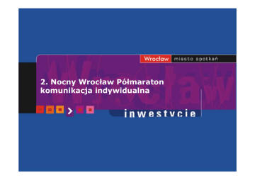 2. Nocny Wrocław Półmaraton komunikacja indywidualna Trasa 2.Nocnego Wrocław Półmaratonu Most Zwierzyniecki 2.Nocny Wrocław Półmaraton 1. Zamknięcie ulic na trasie biegu dla ruchu kołowego najwcześniej na 45 minut przed biegaczami 2. Otwarcie ulic dla ruchu kołowego bezpośrednio po przebiegnięciu biegaczy 3. Przez cały czas trwania półmaratonu czynny jest wjazd na Wielką Wyspę: - od strony Centrum ulicą Kowalską (bez przecięcia z trasą biegu) - przez Rondo Reagana od ulicy Szczytnickiej (z przecięciem trasy biegu) 4. Przez cały czas trwania półmaratonu czynny jest wjazd do Miasta dla wschodnich rejonów (w tym dla osiedla Biskupin i Sępolno): - od ulicy Kowalskiej (bez przecięcia z trasą biegu) - przez Rondo Reagana w ulicę Piastowską ( z przecięciem trasy biegu) 2.Nocny Wrocław Półmaraton – oś czasu 19.00 Początek Opery Makbet w Hali Stulecia 19.15 Ustawienie posterunku policji na skrzyŜowaniu ulic Swojczycka – Mydlana. Kierowanie samochodów jadących w kierunku Centrum w ulicę Mydlaną 20.00 Wprowadzenie ruchu wahadłowego na moście Zwierzynieckim 20.15 Zamknięcie dla ruchu ulicy RóŜyckiego 21.00 Początek Maratonu 21.30 Otwarcie przejazdu Paderewskiego Moniuszki – Kochanowskiego w kierunku placu Kromera i Mostów Warszawskich 22.00 Otwarcie przejazdu Paderewskiego Moniuszki – Kochanowskiego w kierunku Mostu Szczytnickiego 22.30 Koniec spektaklu w Hali Stulecia, pokaz fontanny 24.00 Koniec Maratonu Przywrócenie ruchu jednokierunkowego na moście Zwierzynieckim 2.Nocny Wrocław Półmaraton – komunikacja indywidualna w godzinach 20.15 – 21.30 na Moście Zwierzynieckim ruch wahadłowy 2.Nocny Wrocław Półmaraton – komunikacja indywidualna w rejonie Wielkiej Wyspie w godzinach 20.15 – 21.30 1. Czynny jest wjazd na Wielką Wyspę od strony Centrum : • przez Mosty Warszawskie, ulicami Kromera, Bolesława Krzywoustego, Kowalską, Mydlaną , Swojczycką, przez Mosty Chrobrego (bez przecięcia z trasą biegu), • przez Rondo Reagana od ulicy Szczytnickiej (z przecięciem trasy biegu) i dalej ulicami Norwida, WybrzeŜe Wyspiańskiego i Most Zwierzyniecki ( ruch wahadłowy) 2. Czynny jest wjazd do Miasta dla wschodnich rejonów (w tym dla osiedla Biskupin i Sępolno): • ulicą Mydlaną, ulicą Kowalską, Bolesława Krzywoustego, ulicą Kromera w kierunku Mostów warszawskich (bez przecięcia z trasą biegu) • przez Most Zwierzyniecki ( ruch wahadłowy), ulicami WybrzeŜe Wyspiańskiego , Smoluchowskiego, Norwida do Ronda Reagana i dalej w kierunku ulicy Piastowskiej (z przecięciem trasy biegu) 2.Nocny Wrocław Półmaraton – komunikacja indywidualna w godzinach 21.30 – 22.00 na Moście Zwierzynieckim ruch wahadłowy 2.Nocny Wrocław Półmaraton – komunikacja indywidualna w rejonie Wielkiej Wyspie w godzinach 21.30 – 22.00 1. Czynny jest wjazd na Wielką Wyspę od strony Centrum : • przez Mosty Warszawskie, ulicami Kromera, Bolesława Krzywoustego, Kowalską, Mydlaną , Swojczycką, przez Mosty Chrobrego (bez przecięcia z trasą biegu), • przez Rondo Reagana od ulicy Szczytnickiej (z przecięciem trasy biegu) i dalej ulicami Norwida, WybrzeŜe Wyspiańskiego i Most Zwierzyniecki ( ruch wahadłowy) 2. Czynny jest wjazd do Miasta dla wschodnich rejonów (w tym dla osiedla Biskupin i Sępolno): • ulicą Mydlaną, ulicą Kowalską, Bolesława Krzywoustego, ulicą Kromera w kierunku Mostów warszawskich (bez przecięcia z trasą biegu) • przez Most Zwierzyniecki ( ruch wahadłowy), ulicami WybrzeŜe Wyspiańskiego , Smoluchowskiego, Norwida do Ronda Reagana i dalej w kierunku ulicy Piastowskiej (z przecięciem trasy biegu) • ulicami Paderewskiego, Moniuszki, Kochanowskiego, Kromera i dalej przez Mosty Warszawskie (z przecięciem trasy biegu) 2.Nocny Wrocław Półmaraton – komunikacja w godzinach 22.00 – 24.00 na Moście Zwierzynieckim ruch wahadłowy 2.Nocny Wrocław Półmaraton – komunikacja indywidualna w rejonie Wielkiej Wyspie w godzinach 22.00 – 24.00 1. Czynny jest wjazd na Wielką Wyspę od strony Centrum : • przez Mosty Warszawskie, ulicami Kromera, Bolesława Krzywoustego, Kowalską, Mydlaną , Swojczycką, przez Mosty Chrobrego (bez przecięcia z trasą biegu), • przez Rondo Reagana od ulicy Szczytnickiej (z przecięciem trasy biegu) i dalej ulicami Norwida, WybrzeŜe Wyspiańskiego i Most Zwierzyniecki (ruch wahadłowy) • Przez Mosty Warszawskie, ulicami Kochanowskiego, Czackiego, Moniuszki, Paderewskiego (z przecięciem trasy biegu) 2. Czynny jest wjazd do Miasta dla wschodnich rejonów (w tym dla osiedla Biskupin i Sępolno): • ulicą Mydlaną, ulicą Kowalską, Bolesława Krzywoustego, ulicą Kromera w kierunku Mostów warszawskich (bez przecięcia z trasą biegu) • przez Most Zwierzyniecki ( ruch wahadłowy), ulicami WybrzeŜe Wyspiańskiego , Smoluchowskiego, Norwida do Ronda Reagana i dalej w kierunku ulicy Piastowskiej (z przecięciem trasy biegu) • ulicami Paderewskiego, Moniuszki, Kochanowskiego, Kromera i dalej przez Mosty Warszawskie (z przecięciem trasy biegu) • Ulicami Paderewskiego, Moniuszki, Kochanowskiego, i dalej przez Most Szczytnicki 2.Nocny Wrocław Półmaraton – komunikacja miejska Podczas trwania II Nocnego Półmaratonu przewiduje się zmiany w organizacji komunikacji zbiorowej, które zostaną wprowadzone po godzinie 20:30 dla następujących linii: • tramwajowych: 2, 6, 8, 10, 11, 14, 17, 20, 23, 24, 31, 32, 33, 71 Z uwagi na wyłączenie większej części trasy linii tramwajowej 0, po godzinie 20:30 zostanie zawieszone kursowanie linii tramwajowych 0L i 0P. • autobusowych A, C, D, N, 103, 110, 113, 115, 116, 118, 122, 127, 128, 131, 141, 144, 145, 146, 149, 435, 602, 612, 701, 911 Komunikacja tramwajowa i autobusowa wraca na swoje stałe trasy przejazdu natychmiast po przebiegnięciu maratończyków. Na wszystkich skrzyŜowaniach przecinających trasę półmaratonu, słuŜby policji będą w miarę moŜliwości umoŜliwiały przejazd komun