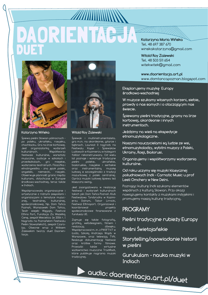 DAORIENTACJA DUET Katarzyna Maria Wińska Tel. 48 697 387 670 [email protected] Witold Roy Zalewski Tel. 48 503 511 654 [email protected] www.daorientacja.art.pl www.domtancapoznan.blogspot.com Eksplorujemy muzykę Europy środkowo-wschodniej W muzyce szukamy własnych korzeni, siebie, prawdy o nas samych i o otaczającym nas świecie. Śpiewamy pieśni tradycyjne, gramy na lirze korbowej, akordeonie i innych instrumentach. Katarzyna Wińska Witold Roy Zalewski Śpiewa pieśni Słowian północnych po polsku, ukraińsku, rosyjsku, chachłacku. Gra na lirze korbowej. Jest organizatorką wydarzeń kulturalnych. Współtworzy festiwale kulturalne, warsztaty muzyczne, audycje w szkołach i przedszkolach, gry miejskie, wydarzenia teatralnych. Filozofka i etnolingwistka - zna język polski, angielski, niemiecki, rosyjski. Obserwuje płynność granic między kulturami, dotychczas w Europie środkowo-wschodniej, teraz także w Indiach. Śpiewak i multiinstrumentalista. gra m.in. na akordeonie, gitarze i bębnach. Laureat II nagrody na Festiwalu Kapel i Śpiewaków Ludowych w Kazimierzu w kategorii folklor rekonstruowany. Od wielu lat poznaje i wykonuje tradycyjne pieśni polskie, ukraińskie, białoruskie, rosyjskie i serbskie oraz instrumentalną muzykę ludową w szczególności z tradycji mazurkowej z polski centralnej. Oprócz muzyki ludowej śpiewa też klasyczny swing. Współpracowała organizacyjnie i artystycznie z różnymi zespołami i organizacjami o tematyce muzycznej, teatralnej, kulturalnej, społecznościowej. Np. Dom Tańca Poznań, Warszawski Dom Tańca, Teatr wiejski Węgajty, Festival Ethno Port, Fundacja Za Wszelką Cenę, zespół Miecielica (w 2006 r. I Nagroda na Poznańskim Festiwalu Pieśni Słowiańskich), zespół Czarolija. Obecnie wraz z Witkiem Zalewskim tworzy duet Daorientacja. Jest zaangażowany w realizację festiwali i wydarzeń kulturalnych takich jak: Dom Tańca Poznań. Klub Festiwalowy Tyndyrydny w Kazimierzu Dolnym, Tabor Lirnicki, Festiwal Ethnoport. Organizował i koordynował projekty społecznościowe finansowane z funduszy UE. Zajmuje się także fotografią, grafiką, webdesignem, filmem i realizacją dźwięku. Współpracował m. in. z PWSFTViT w Łodzi, Szkołą Andrzeja Wajdy w Warszawie, oraz telewizją TVN. Realizuje dokumentację festiwali oraz krótkie formy filmowe. Prowadzi także wirtualne wydawnictwo muzyczne TradiRadi, które publikuje nagrania muzyki tradycyjnej. Jeździmy na wieś na ekspedycje etnomuzykologiczne. Naszymi nauczycielami są ludzie ze wsi, etnomuzykolodzy, wybitni muzycy z Polski, Ukrainy, Rosji, Białorusi. Organizujemy i współtworzymy wydarzenia kulturalne. Od roku uczymy się muzyki klasycznej południowych Indii - Carnatic Music u prof Leeli Omchery w New Delni. Poznając kulturę Indii szukamy elementów wspólnych z kulturą Słowian. Przy okazji nawiązujemy kontakty z muzykami indyjskimi i promujemy naszą kulturę tradycyjną. PROGRAMY Pieśni tradycyjne rubieży Europy Pieśni Świetojańskie Storytelling/opowiadanie historii w pieśni Gurukulam - nauka muzyki w Indiach audio: daorien tacja.art.pl/du et DAORIENTACJA DUET - PROGRAMY Katarzyna Maria Wińska Tel. 48 697 387 670 [email protected] Witold Roy Zalewski Tel. 48 503 511 654 [email protected] www.daorientacja.art.pl www.domtancapoznan.blogspot.com Pieśni tradycyjne rubieży Europy Pieśni Świetojańskie Noc Kupały to pradawne święto, które nasi przodkowie obchodzili jeszcze w czasach przedchrześcijańskich. Znaki i symbole tych rytuałów do dziś funkcjonują w muzyce ludowej. Pieśni, które śpiewamy pochodzą z różnych regionów Polski, Ukrainy, Białorusi i Rosji. Śpiewamy solo, na głosy oraz z towarzyszeniem tradycyjnych instrumentów. Program trwa 45 - 60 min Wraz ze zmianami pór roku obchodzimy różne święta, odprawiamy obrzędy. Opowiemy o nich prezentując charakterystyczne pieśni danego czasu. Ten program to podróż w czasie i przestrzeni, podczas której odkrywamy jak przenikają się kultury Polski, Ukrainy, Białorusi, Rosji i Zachodu. Opowiemy o czasach przedchrześcijańskich, z których obrzędy zachowały się po dziś dzień. Pieśni śpiewamy bez akompaniamentu - jednogłosowo i dwugłosowo - oraz z towarzyszeniem instrumentów: m.in. liry korbowej, akordeonu. Storytelling/ opowiadanie historii w pieśni Nie tak dawno temu był czas, kiedy ludzie żyli bez telewizji, internetu a nawet radia. W tamtych czasach ludzie inaczej opowiadali historie, a niektóre z nich były popularne w całej Europie. Wiele z tych opowieści zachowało się w pieśniach wędrownych dziadów, których można było spotkać jeszcze w pierszej połowie XX w. Pieśni o historiach codziennych, wielkich czynach królów, pieśni o Świętych Pańskich i o grzechach czynionych przez zwykłych ludzi. Podczas tego spotkania opowiemy te historie muzyką i śpiewem przy akompaniamencie żywych instrumentów, m.in. akordeonu i liry korbowej. Gurukulam nauka muzyki w Indiach Wracamy właśnie z Indii, gdzie przez rok uczyliśmy się klasycznego śpiewu południowych Indii. Mieszkaliśmy w New Delhi, sporo też podróżowaliśmy. Opowiemy o nauce muzyki w systemie guru-uczeń, o życiu w New Delhi oraz o tradycjach muzycznych Kerali, skąd pochodzi nasza Guru. Opowieść ilustrujemy zdjęciami, nagraniami audio oraz śpiewem. grafika: Jagoda Glińska, fot. Witka na scenie: Maciej Kaczyński, układ graficzny i fotografie: WItold Roy Zalewski