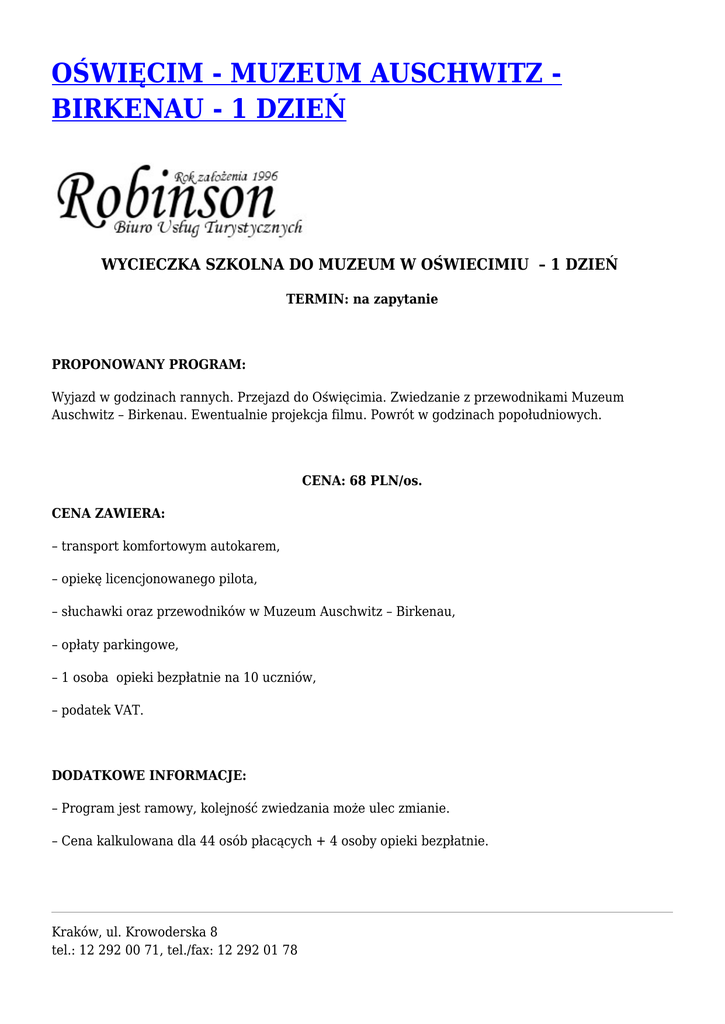 OŚWIĘCIM - MUZEUM AUSCHWITZ BIRKENAU - 1 DZIEŃ WYCIECZKA SZKOLNA DO MUZEUM W OŚWIECIMIU – 1 DZIEŃ TERMIN: na zapytanie PROPONOWANY PROGRAM: Wyjazd w godzinach rannych. Przejazd do Oświęcimia. Zwiedzanie z przewodnikami Muzeum Auschwitz – Birkenau. Ewentualnie projekcja filmu. Powrót w godzinach popołudniowych. CENA: 68 PLN/os. CENA ZAWIERA: – transport komfortowym autokarem, – opiekę licencjonowanego pilota, – słuchawki oraz przewodników w Muzeum Auschwitz – Birkenau, – opłaty parkingowe, – 1 osoba opieki bezpłatnie na 10 uczniów, – podatek VAT. DODATKOWE INFORMACJE: – Program jest ramowy, kolejność zwiedzania może ulec zmianie. – Cena kalkulowana dla 44 osób płacących + 4 osoby opieki bezpłatnie. Kraków, ul. Krowoderska 8 tel.: 12 292 00 71, tel./fax: 12 292 01 78 www.robinsontravel.pl e-mail: [email protected] PIENINY - TRZY KORONY lub SOKOLICA - 1 DZIEŃ WYCIECZKA SZKOLNA W PIENINY- TRZY KORONY LUB SOKOLICA – 1 DZIEŃ TERMIN: na zapytanie PROPONOWANY PROGRAM: Wyjazd w godzinach rannych. Przejazd do Krościenka. Wycieczka piesza na Trzy Korony lub Sokolicę. Następnie przejazd do Szczawnicy i krótki spacer po uzdrowisku. Powrót w godzinach wieczornych. CENA: 56 PLN/os. CENA ZAWIERA: – transport komfortowym autokarem, – opiekę licencjonowanego przewodnika, – bilet wstępu: Pieniński Park Narodowy, – opłaty parkingowe, – 1 osoba opieki bezpłatnie na 10 uczniów, – podatek VAT. DODATKOWE INFORMACJE: – Program jest ramowy, kolejność zwiedzania może ulec zmianie. – Cena kalkulowana dla 44 osób płacących + 4 osoby opieki bezpłatnie. Kraków, ul. Krowoderska 8 tel.: 12 292 00 71, tel./fax: 12 292 01 78 www.robinsontravel.pl e-mail: [email protected] SOBKÓW - POKAZ RYCERSKI - 1 DZIEŃ WYCIECZKA SZKOLNA DO SOBKOWA – POKAZ RYCERSKI – 1 DZIEŃ TYERMIN: na zapytanie PROPONOWANY PROGRAM: Wyjazd w godzinach rannych. Przejazd do Tokarni (zwiedzanie Skansenu Wsi Kieleckiej). Następnie przejazd do Sobkowa na pokaz rycerski (3 – godzinne zajęcia rekreacyjne, gry i zabawy rycerskie, przejażdżka gondolą, grill z kiełbaską i herbatą). Powrót w godzinach popołudniowych. CENA: 58 PLN/os + 22 PLN/os. bilet wstępu w Sobkowie CENA ZAWIERA: – transport komfortowym autokarem, – opiekę licencjonowanego pilota, – bilet wstępu: skansen w Tokarni, – opłaty parkingowe, – 1 osoba opieki bezpłatnie na 10 uczniów, – podatek VAT. DODATKOWE INFORMACJE: – Program jest ramowy, kolejność zwiedzania może ulec zmianie. – Cena kalkulowana dla 44 osób płacących + 4 osoby opieki bezpłatnie. Kraków, ul. Krowoderska 8 tel.: 12 292 00 71, tel./fax: 12 292 01 78 www.robinsontravel.pl e-mail: [email protected] GÓRY ŚWIĘTOKRZYSKIE – ŚW. KRZYŻ i TOKARNIA - 1 DZIEŃ WYCIECZKA SZKOLNA W GÓRY ŚWIĘTOKRZYSKIE – 1 DZIEŃ TERMIN: na zapytanie PROPONOWANY PROGRAM: Wyjazd w godzinach rannych. Przejazd do Tokarni, zwiedzanie Skansenu Wsi Kieleckiej. Następnie przejazd w Góry Świętokrzyskie. Wyjście na Św. Krzyż, zwiedzanie Klasztoru z kryptą oraz z Muzeum Misyjnym, galeria widokowa na gołoborzu na Łysej Górze. Powrót w godzinach wieczornych. CENA: 80 PLN/os. CENA ZAWIERA: – transport komfortowym autokarem, – opiekę licencjonowanego pilota, – bilety wstępu: Skansen w Tokarni, wstęp do Świętokrzyskiego Parku Narodowego, wejście do krypty, Muzeum Misyjne, – opłaty parkingowe, – 1 osoba opieki bezpłatnie na 10 uczniów, – podatek VAT. DODATKOWE INFORMACJE: – Program jest ramowy, kolejność zwiedzania może ulec zmianie. – Cena kalkulowana dla 44 osób płacących + 4 osoby opieki bezpłatnie. Kraków, ul. Krowoderska 8 tel.: 12 292 00 71, tel./fax: 12 292 01 78 www.robinsontravel.pl e-mail: [email protected] BABIA GÓRA - 1 DZIEŃ WYCIECZKA SZKOLNA NA BABIĄ GÓRĘ – 1 DZIEŃ TERMIN: na zapytanie PROPONOWANY PROGRAM: Wyjazd w godzinach rannych. Przejazd na przełęcz Krowiarki. Wejście na Babią Górę, następnie zejście przez schronisko na Markowych Szczawinach. Powrót w godzinach popołudniowych. CENA: 50 PLN/os. CENA ZAWIERA: – transport komfortowym autokarem, – opiekę licencjonowanego przewodnika, – bilet wstępu do Babiogórskiego Parku Narodowego, – opłaty parkingowe, – 1 osoba opieki bezpłatnie na 10 uczniów, – podatek VAT. DODATKOWE INFORMACJE: – Program jest ramowy, kolejność zwiedzania może ulec zmianie. – Cena kalkulowana dla 44 osób płacących + 4 osoby opieki bezpłanie. Kraków, ul. Krowoderska 8 tel.: 12 292 00 71, tel./fax: 12 292 01 78 www.robinsontravel.pl e-mail: [email protected]