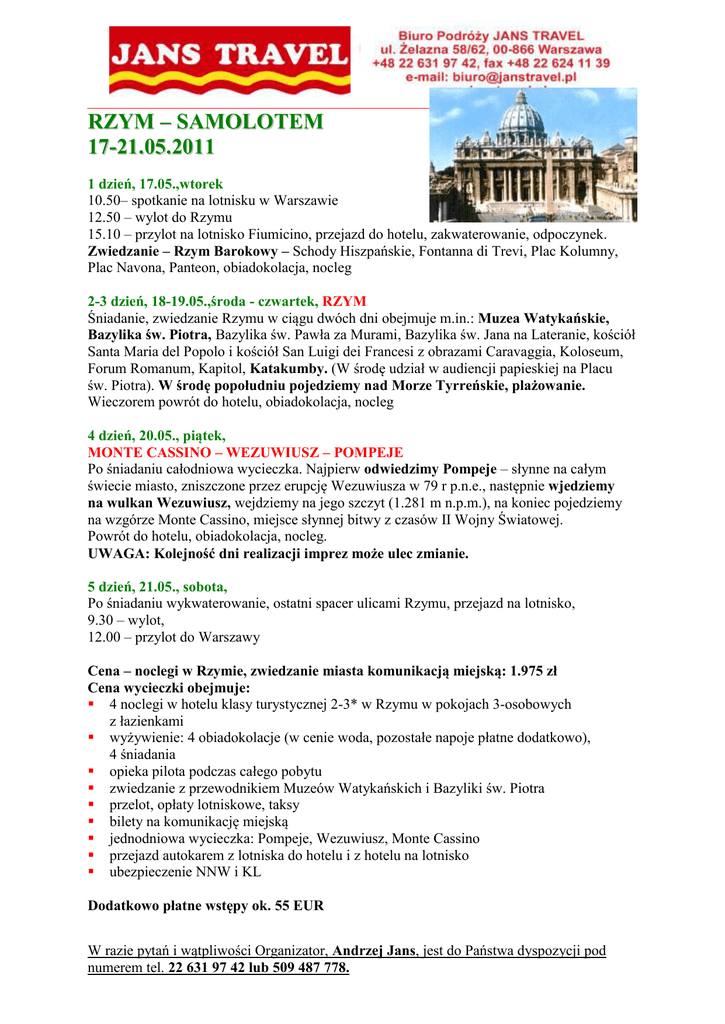 RZYM – SAMOLOTEM 17-21.05.2011 1 dzień, 17.05.,wtorek 10.50– spotkanie na lotnisku w Warszawie 12.50 – wylot do Rzymu 15.10 – przylot na lotnisko Fiumicino, przejazd do hotelu, zakwaterowanie, odpoczynek. Zwiedzanie – Rzym Barokowy – Schody Hiszpańskie, Fontanna di Trevi, Plac Kolumny, Plac Navona, Panteon, obiadokolacja, nocleg 2-3 dzień, 18-19.05.,środa - czwartek, RZYM Śniadanie, zwiedzanie Rzymu w ciągu dwóch dni obejmuje m.in.: Muzea Watykańskie, Bazylika św. Piotra, Bazylika św. Pawła za Murami, Bazylika św. Jana na Lateranie, kościół Santa Maria del Popolo i kościół San Luigi dei Francesi z obrazami Caravaggia, Koloseum, Forum Romanum, Kapitol, Katakumby. (W środę udział w audiencji papieskiej na Placu św. Piotra). W środę popołudniu pojedziemy nad Morze Tyrreńskie, plażowanie. Wieczorem powrót do hotelu, obiadokolacja, nocleg 4 dzień, 20.05., piątek, MONTE CASSINO – WEZUWIUSZ – POMPEJE Po śniadaniu całodniowa wycieczka. Najpierw odwiedzimy Pompeje – słynne na całym świecie miasto, zniszczone przez erupcję Wezuwiusza w 79 r p.n.e., następnie wjedziemy na wulkan Wezuwiusz, wejdziemy na jego szczyt (1.281 m n.p.m.), na koniec pojedziemy na wzgórze Monte Cassino, miejsce słynnej bitwy z czasów II Wojny Światowej. Powrót do hotelu, obiadokolacja, nocleg. UWAGA: Kolejność dni realizacji imprez może ulec zmianie. 5 dzień, 21.05., sobota, Po śniadaniu wykwaterowanie, ostatni spacer ulicami Rzymu, przejazd na lotnisko, 9.30 – wylot, 12.00 – przylot do Warszawy Cena – noclegi w Rzymie, zwiedzanie miasta komunikacją miejską: 1.975 zł Cena wycieczki obejmuje: 4 noclegi w hotelu klasy turystycznej 2-3* w Rzymu w pokojach 3-osobowych z łazienkami wyżywienie: 4 obiadokolacje (w cenie woda, pozostałe napoje płatne dodatkowo), 4 śniadania opieka pilota podczas całego pobytu zwiedzanie z przewodnikiem Muzeów Watykańskich i Bazyliki św. Piotra przelot, opłaty lotniskowe, taksy bilety na komunikację miejską jednodniowa wycieczka: Pompeje, Wezuwiusz, Monte Cassino przejazd autokarem z lotniska do hotelu i z hotelu na lotnisko ubezpieczenie NNW i KL Dodatkowo płatne wstępy ok. 55 EUR W razie pytań i wątpliwości Organizator, Andrzej Jans, jest do Państwa dyspozycji pod numerem tel. 22 631 97 42 lub 509 487 778. Dodatkowe informacje dla osób wyjeżdżających do Rzymu, 17-21.05.2011. 1. Proszę pamiętać o zabraniu dokumentu tożsamości : dowodu osobistego lub paszportu. 2. Spotkanie na lotnisku Warszawa Okęcie terminal A wtorek, 17.05.2011r. godz. 10.50. Wylot z Warszawy o godz. 12.50, w Rzymie na lotnisku Fiumicino będziemy o godz. 15.10. Opieka: wychowawcy klas 1a,1b,1c,3a,3b 3. Wylot z Rzymu o godz. 9.30, w Warszawie na lotnisku Okęcie na terminalu A będziemy o 12.00, w sobotę 21.05.2011. 4. Można zabrać bagaż główny do 23 kg i bagaż podręczny do 8 kg o wymiarach 55 cm/ 25 cm/ 35 cm. 5. Należy pamiętać, aby w bagażu podręcznym nie było żadnych pojemników z płynami ponad 100 ml (perfumy, pasta do zębów, napoje itp.). Pojemniki z płynami do 100 ml powinny być zapakowane w specjalnych woreczkach foliowych. Nie należy także zabierać do bagażu podręcznego niebezpiecznych i ostrych narzędzi (np. pilniczki, nożyczki itp.). 6. Zakwaterowani będziemy w hotelu LUX, via Gaeta 14, Rzym. 7. Nie ma różnic w stosunku do czasu polskiego. 8. Pogoda będzie jak zwykle słoneczna, dlatego należy pamiętać o odpowiedniej, lekkiej odzieży, nakryciu na głowę, kremie z filtrem. Ze względu na to, że będziemy wchodzić do kilku kościołów, należy zabrać odzież, która okryje ramiona i długie spodnie. A także strój kąpielowy, gdyż jedno popołudnie spędzimy nad morzem. Pamiętaj o zabraniu wygodnego obuwia, będziemy wchodzić na wulkan Wezuwiusz, wygodne obuwie przyda się także podczas naszych spacerów po Rzymie. 9. Zgodnie z obowiązującymi przepisami prawnymi Jans Travel zawiera dla wszystkich uczestników ubezpieczenie od kosztów leczenia (10 000 EUR), następstw nieszczęśliwych wypadków (1 300 EUR) podczas imprezy. 10. W cenie imprezy nie jest zawarte ubezpieczenie od kosztów rezygnacji w przypadku choroby lub zdarzenia losowego, oraz ubezpieczenie za objęcie ochroną ubezpieczeniową następstw chorób przewlekłych. 11. Obowiązującą walutą jest EUR, najlepiej złotówki wymienić w Polsce. 12. Dodatkowo należy przeznaczyć na wejścia 55 EUR Przykładowe ceny: kawa ok. 1-1,50 EUR pizza w restauracji ok. 7 EUR zimne napoje 1-2 EUR